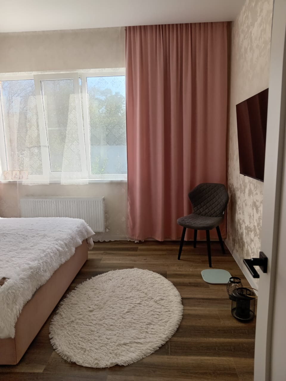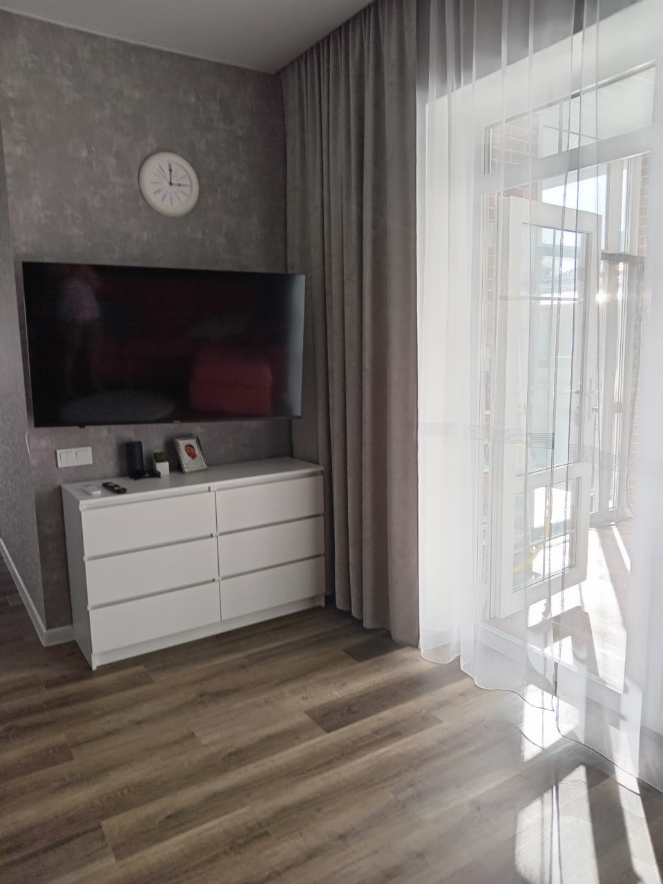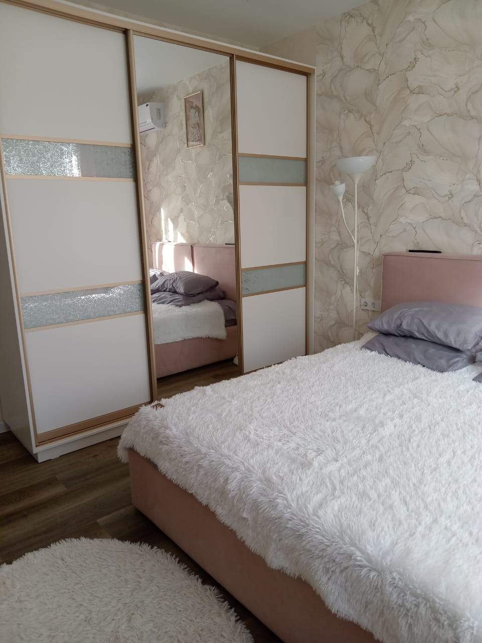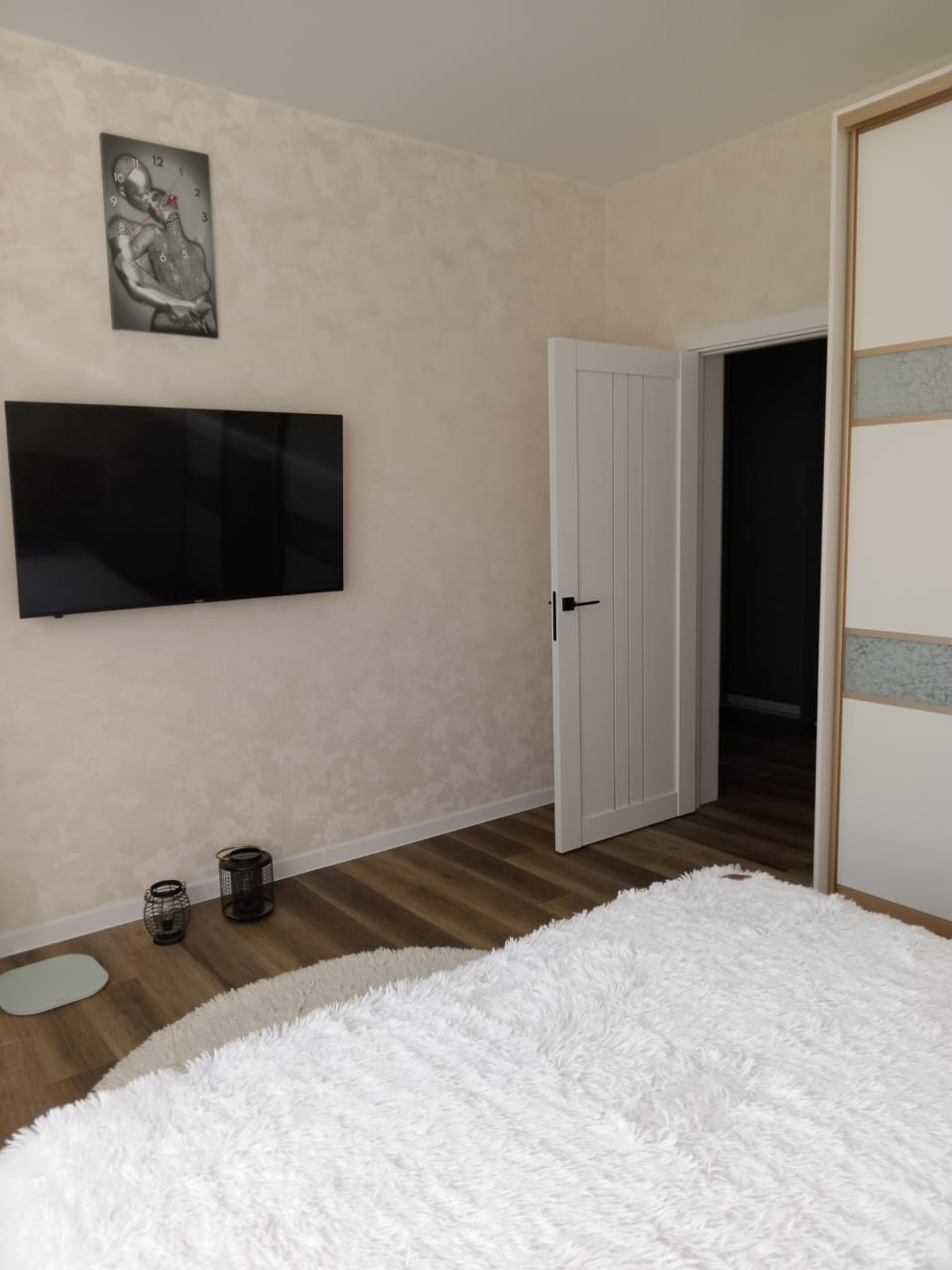 В спальне большая двухспальная кровать с ортопедическим матрасом, шкаф-купе, телевизор.