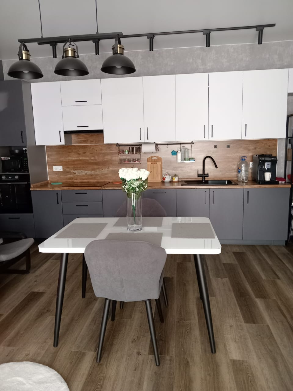 В кухне-гостиной - встроенный кухонный гарнитур с духовым шкафом, посудомоечной машинкой, электроплитой, вытяжкой. Остается большой обеденный стол, очень удобный большой диван, телевизор, комод, холодильник.