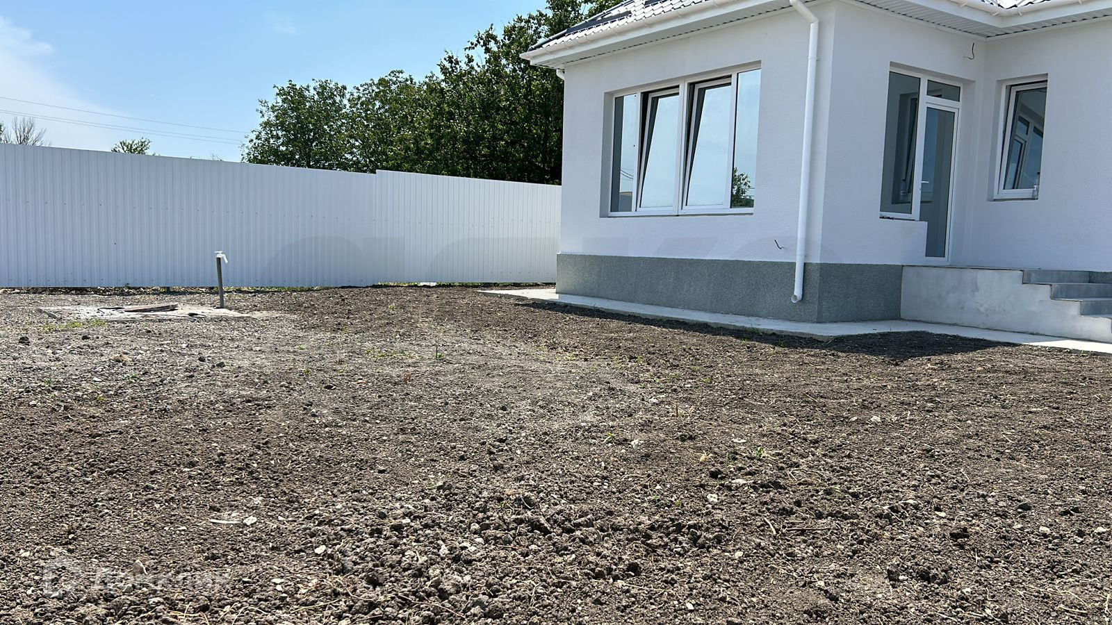 Фасад дома выполнен в светлых тонах, что придает ему легкость и воздушность. Окна большие, что позволяет максимально использовать естественное освещение. Крыша дома выполнена из металлопрофиля под черепицу, по периметру участка сделан капитальный забор с колоннами из кирпича и металлического штакетника.