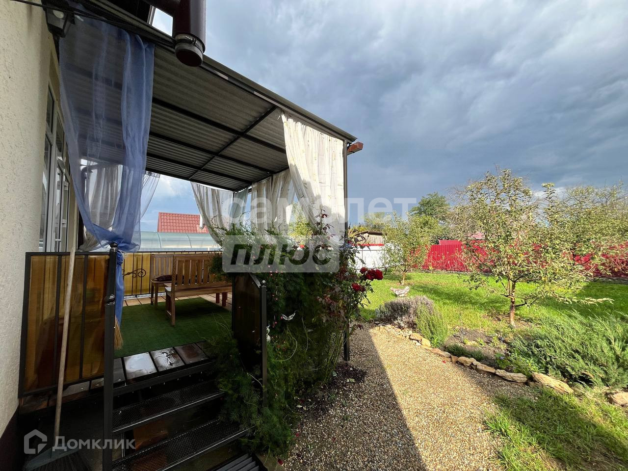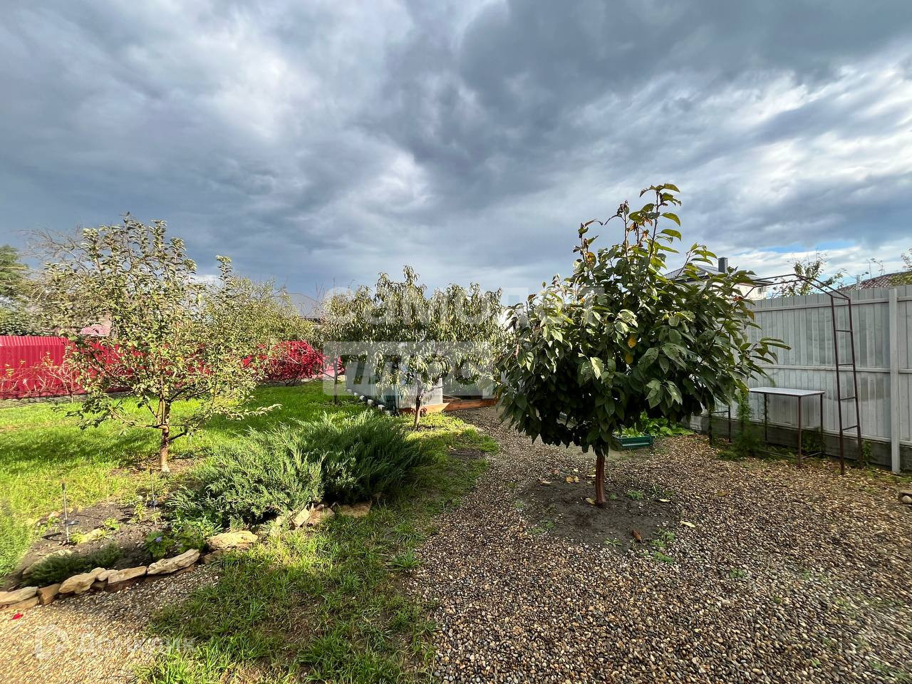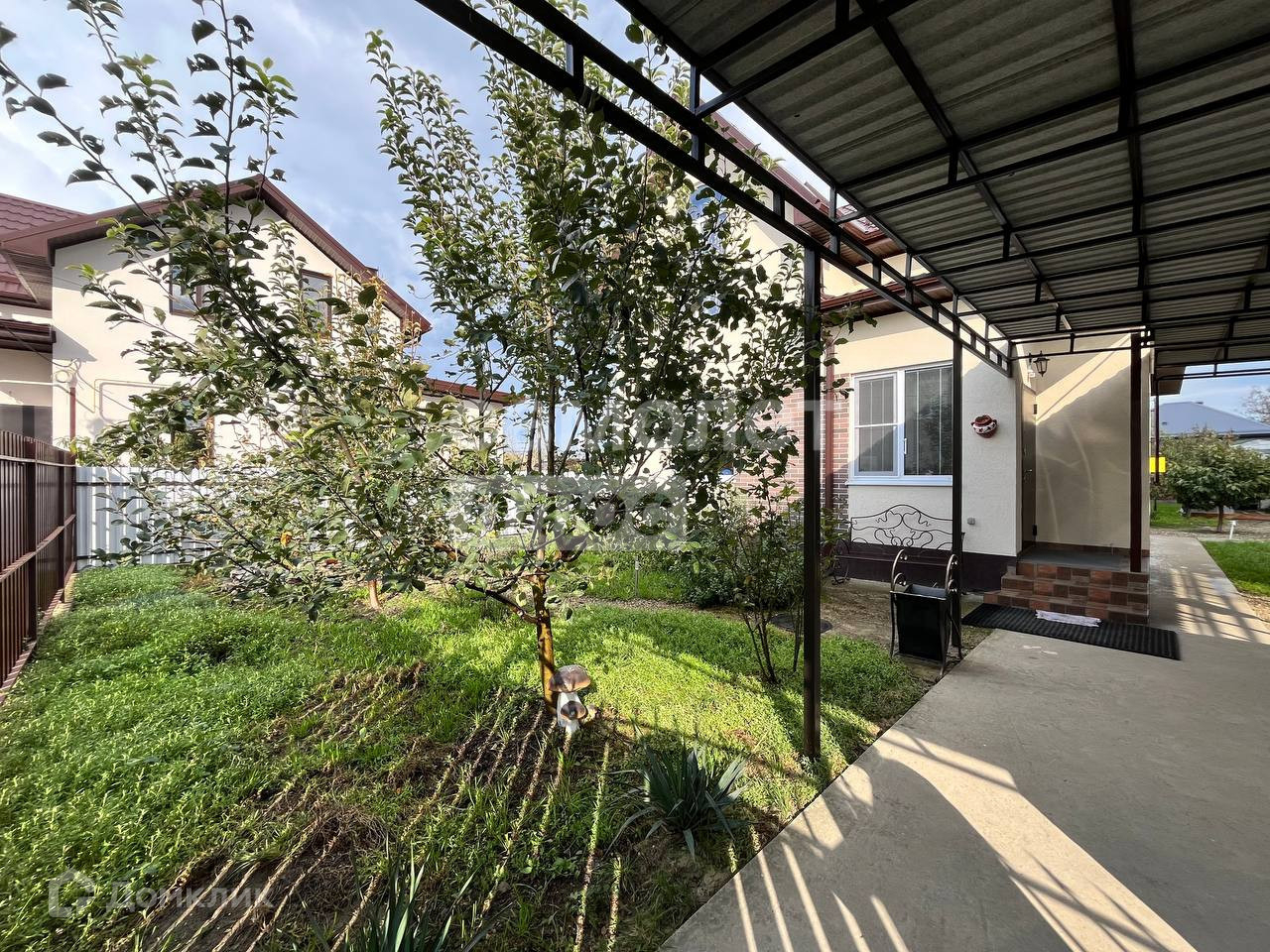 Большой навес над парковочным местом 11*4 метра.Имеется wi-fi и телевидение Триколор.Фасад участка сделан из евроштакетника с распашными воротами.Покупателю в подарок средства,инструменты и предметы для ухода за садом.