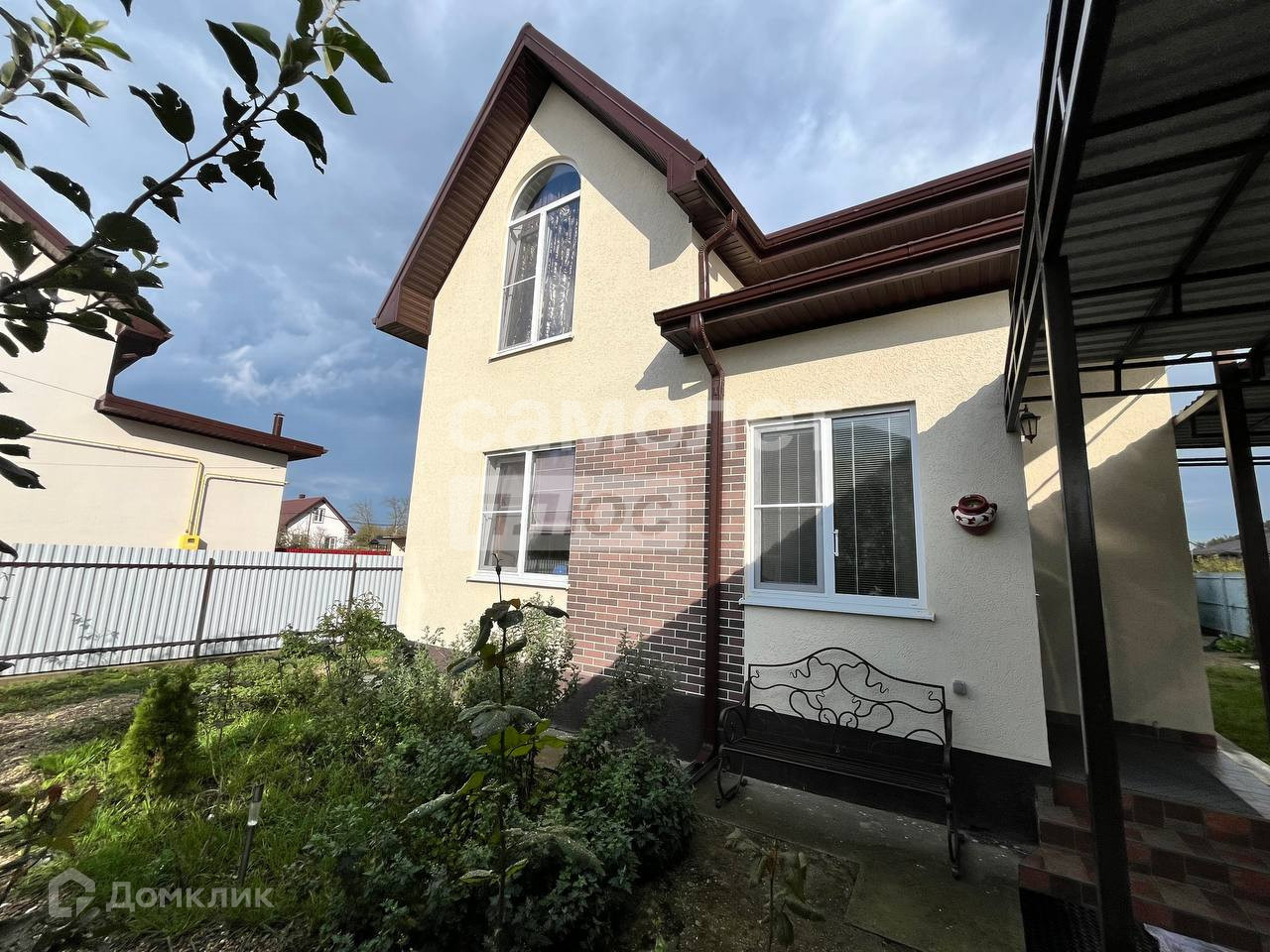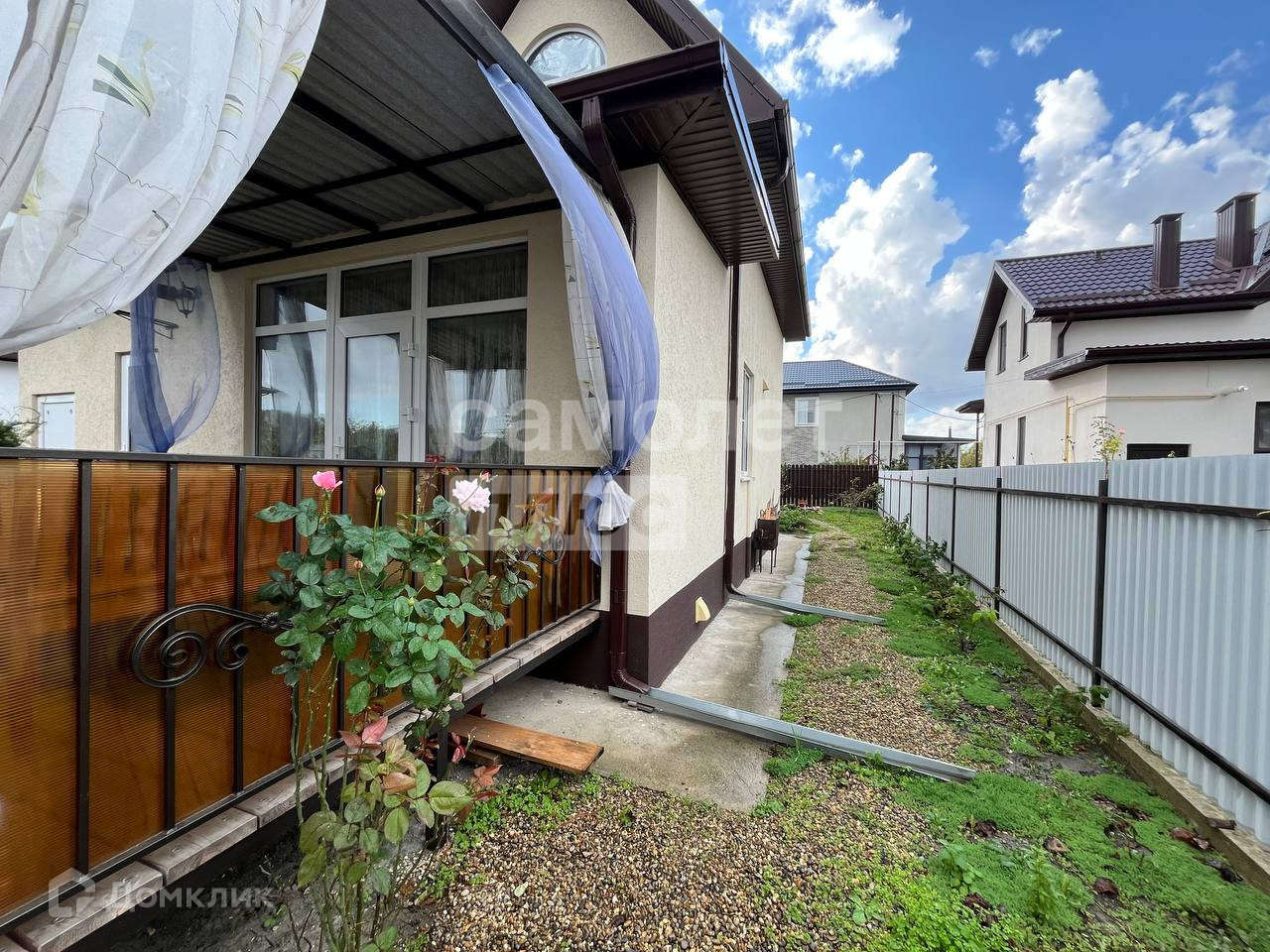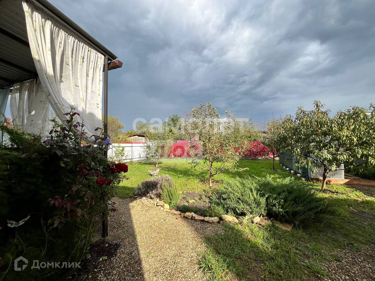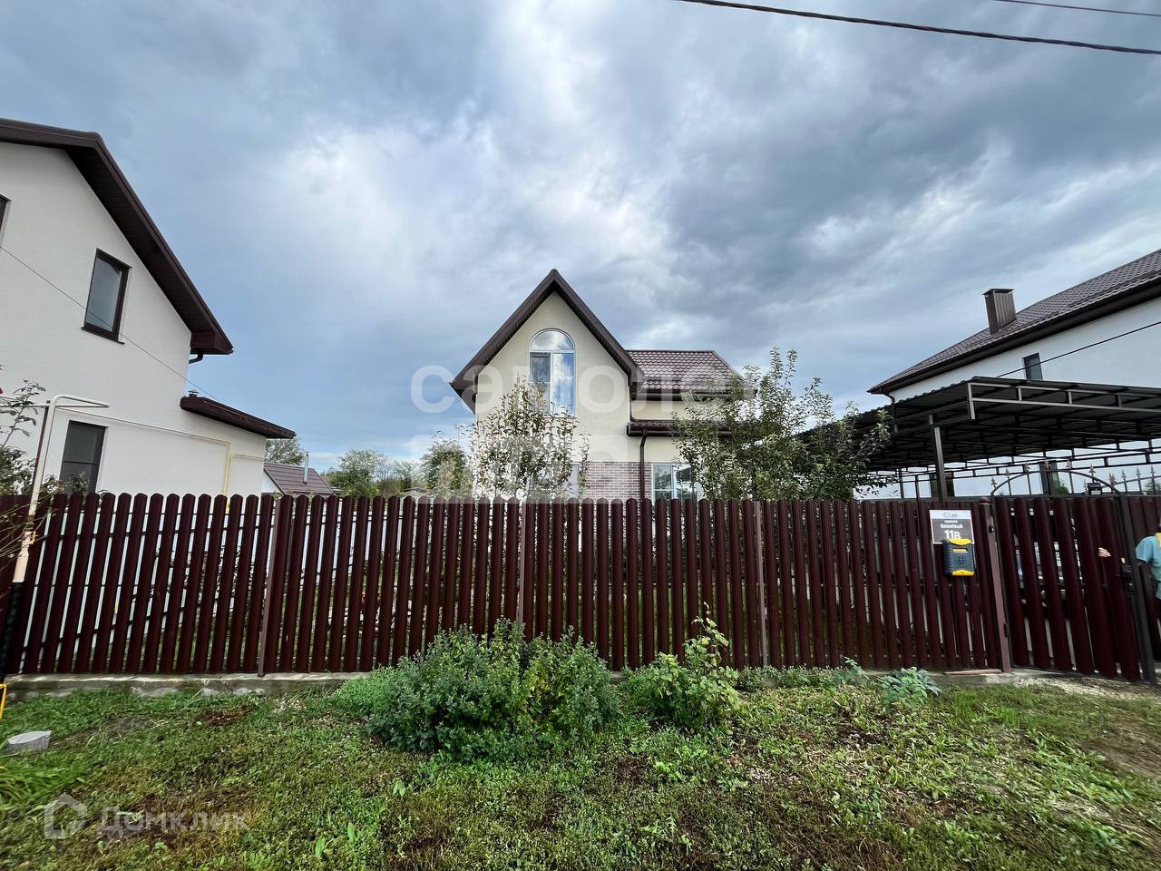 Большой навес над парковочным местом 11*4 метра.Имеется wi-fi и телевидение Триколор.Фасад участка сделан из евроштакетника с распашными воротами.Покупателю в подарок средства,инструменты и предметы для ухода за садом.