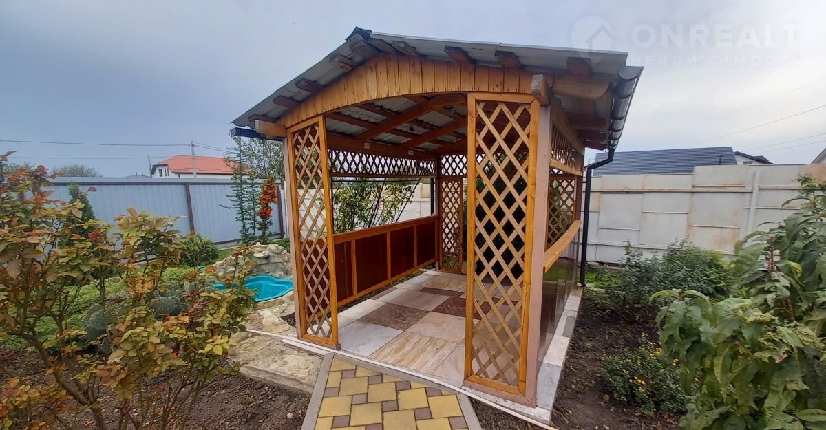 Беседка, которая является украшением участка, небольшой пруд с фонтаном