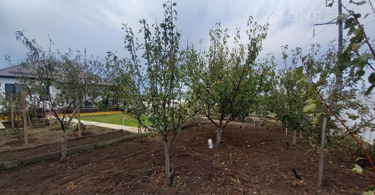 Высажены плодовые деревья, виноград, декоративные растения.