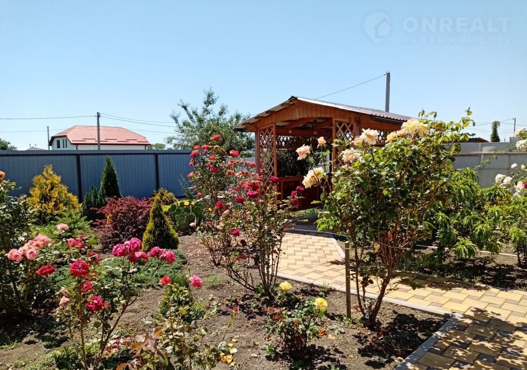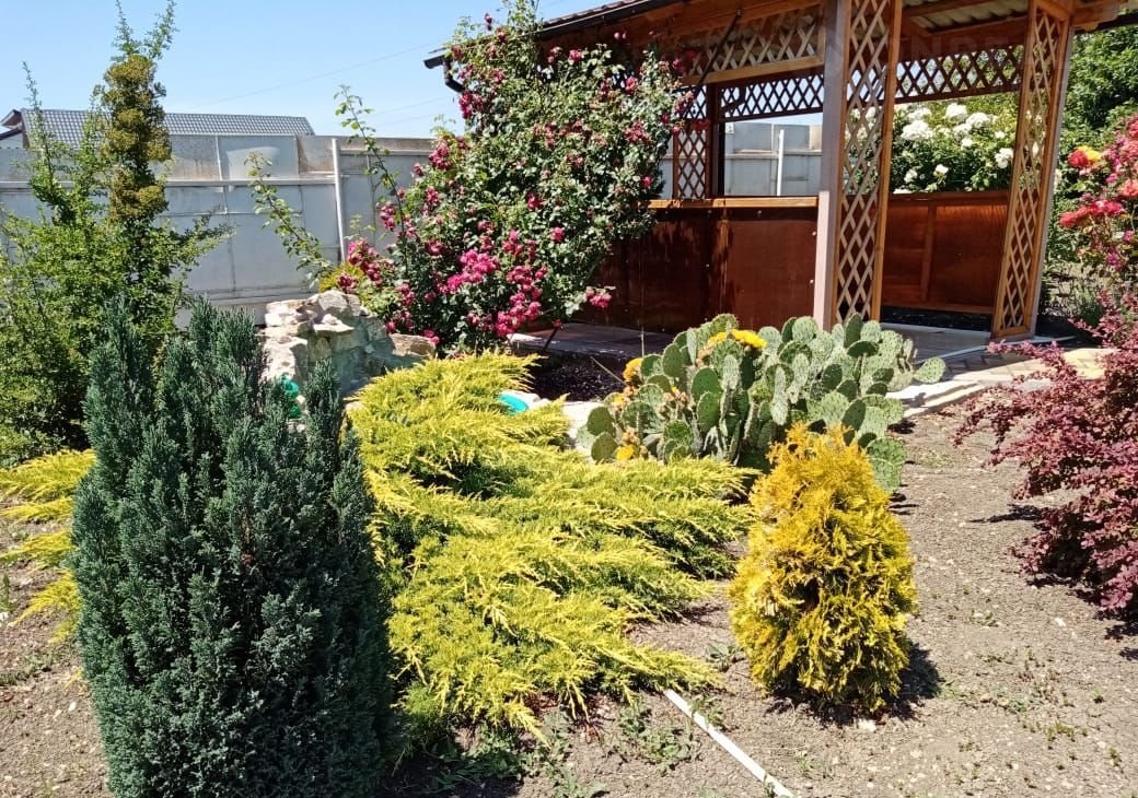 На территории участка много зелени, различные сорта роз, 10 сортов винограда, плодоносящий фруктовый сад, много декоративных деревьев.