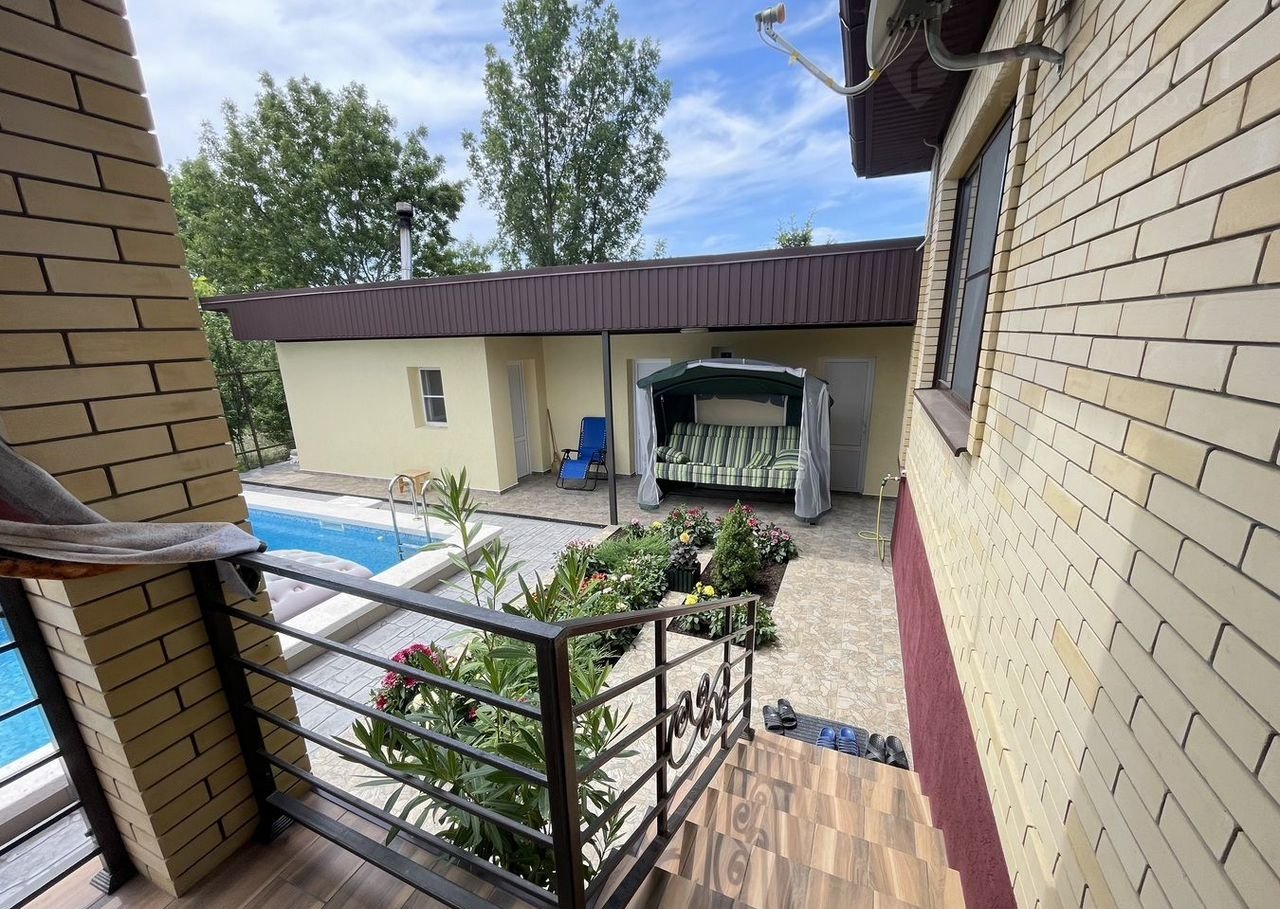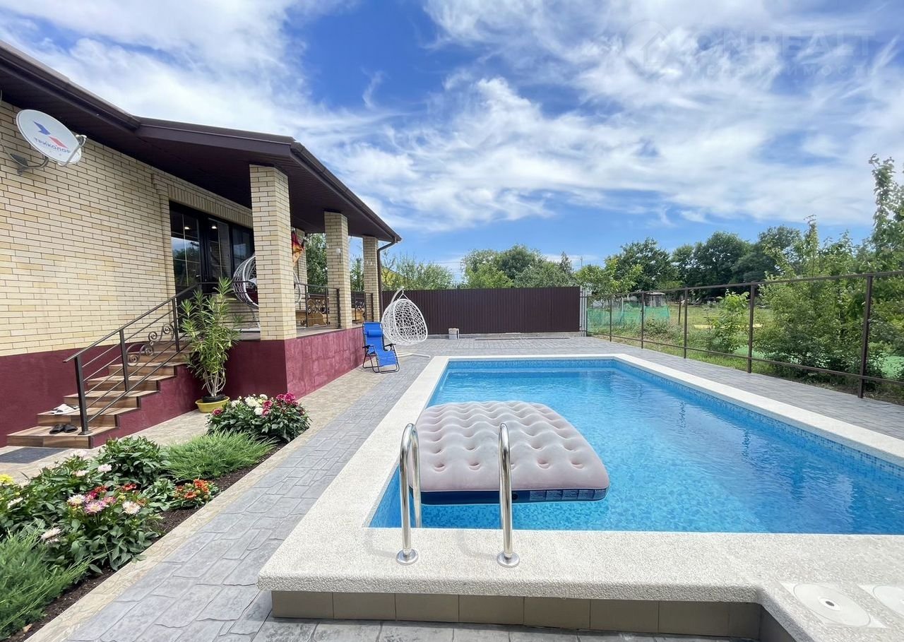 Придомовая территория благоустроена: имеется бассейн 4*6, баня на дровах, тротуарная плитка и забор из металлического штакетника с кирпичными опорами.
