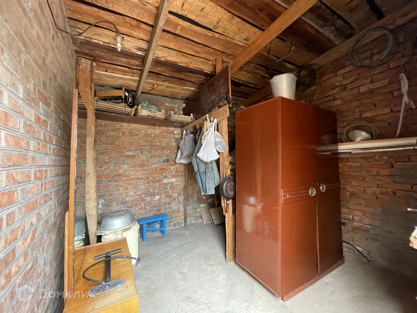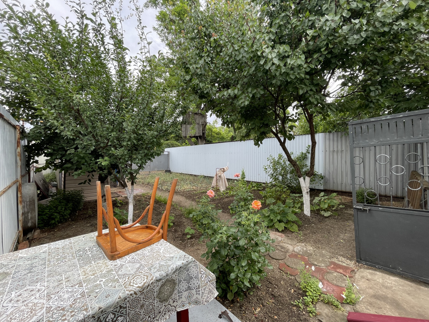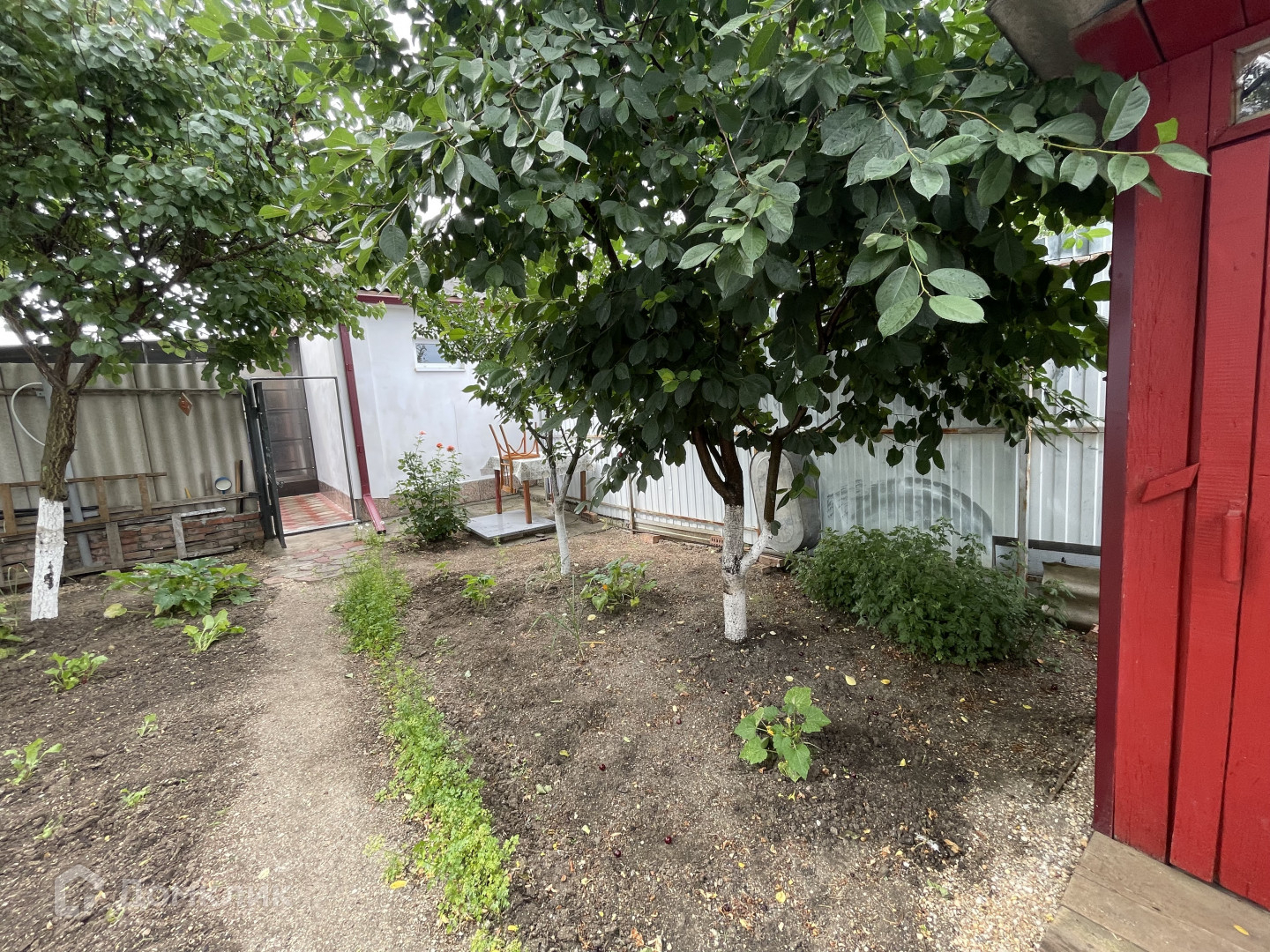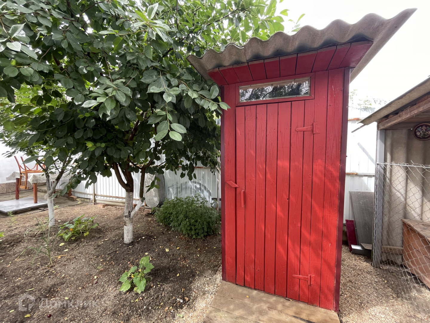 Кирпичная постройка на участке можно использовать как мастерскую или дополнительную комнату для отдыхающих. В заднем дворе располагается летний душ, огород с плодовыми деревьями (черешня, персик и др.), летний туалет, хозяйственная постройка и вольер для собаки.