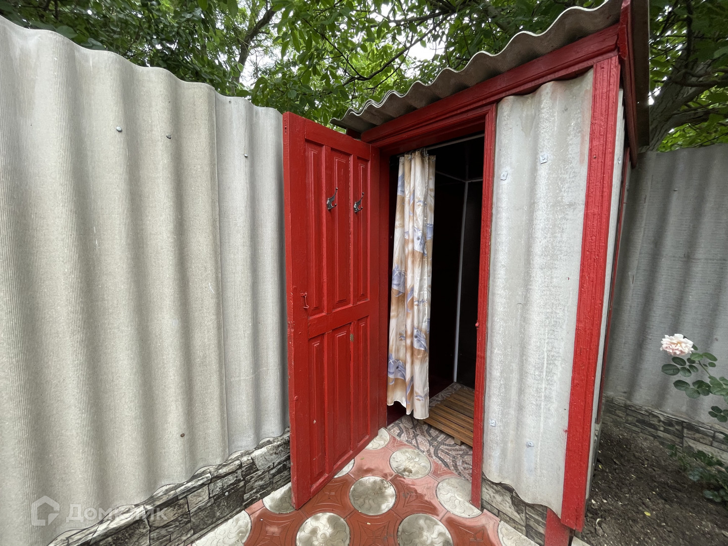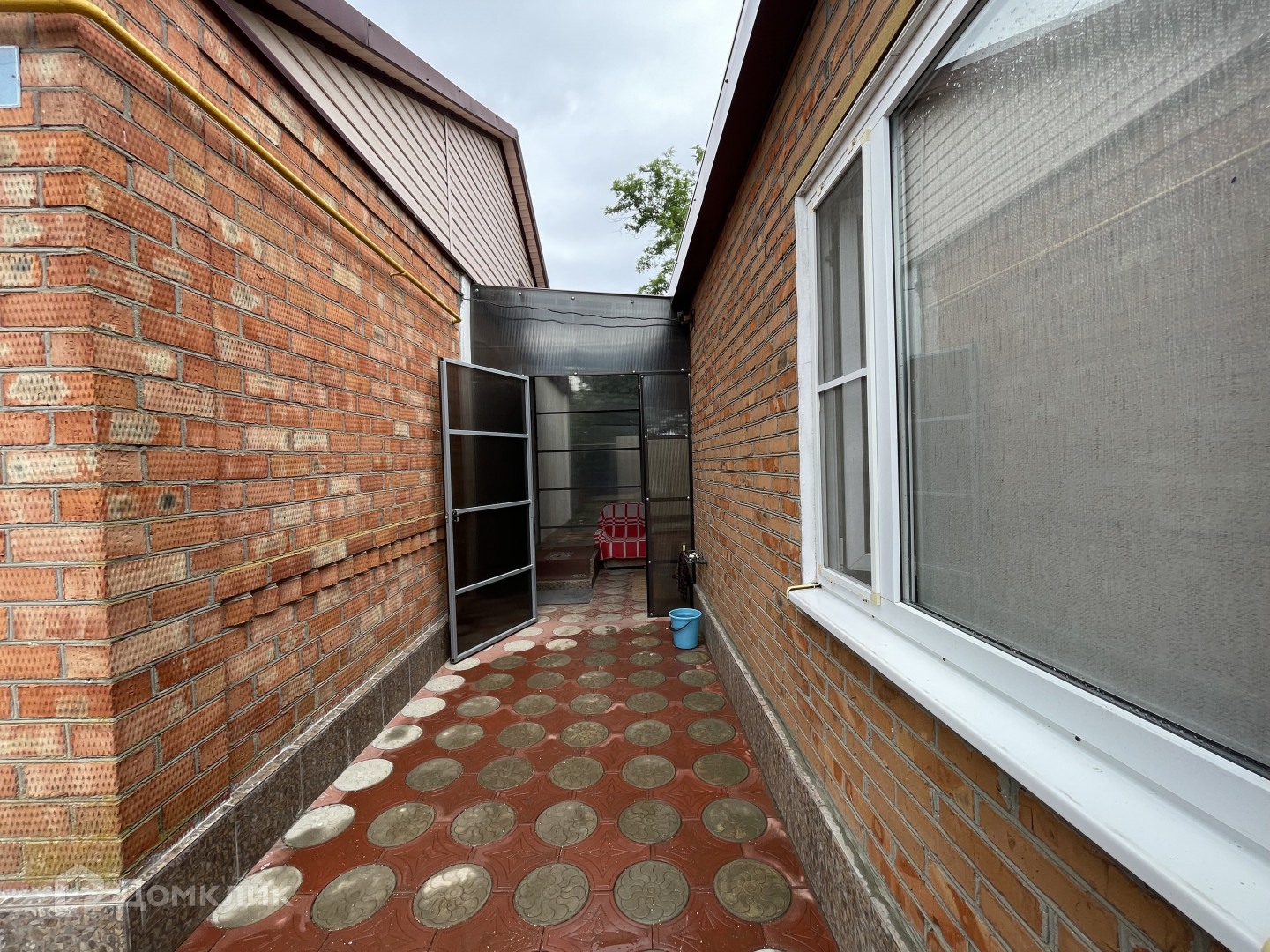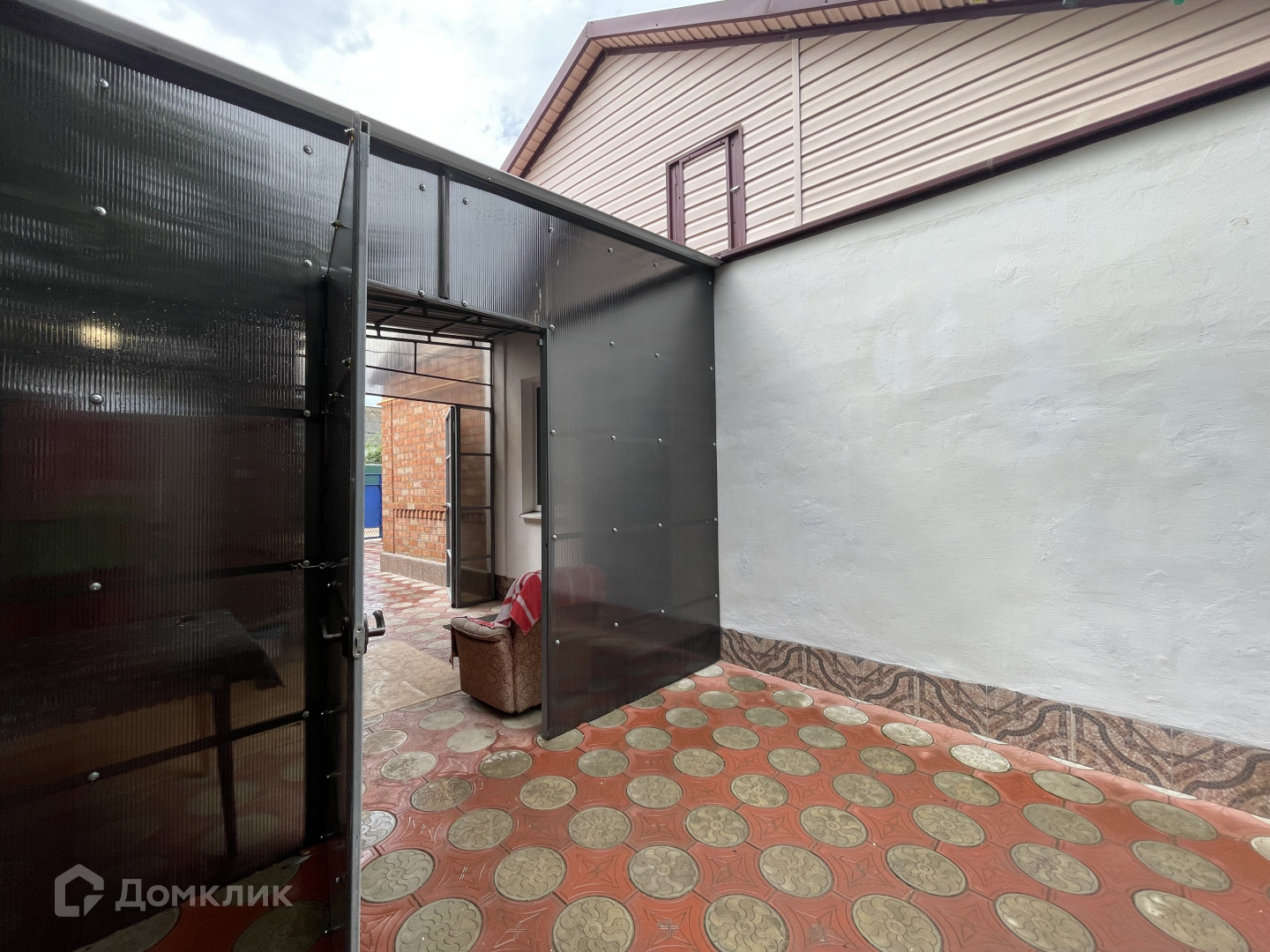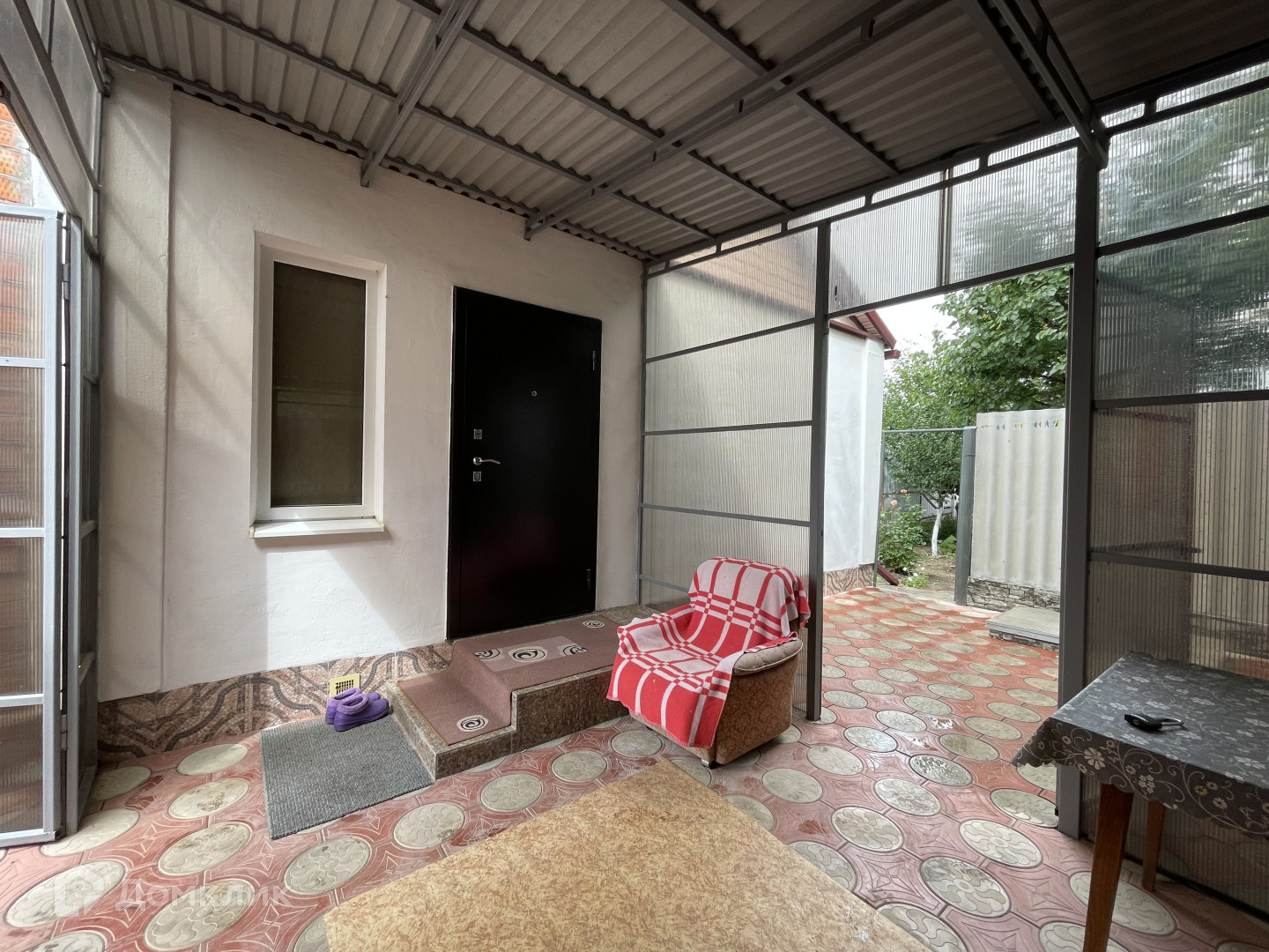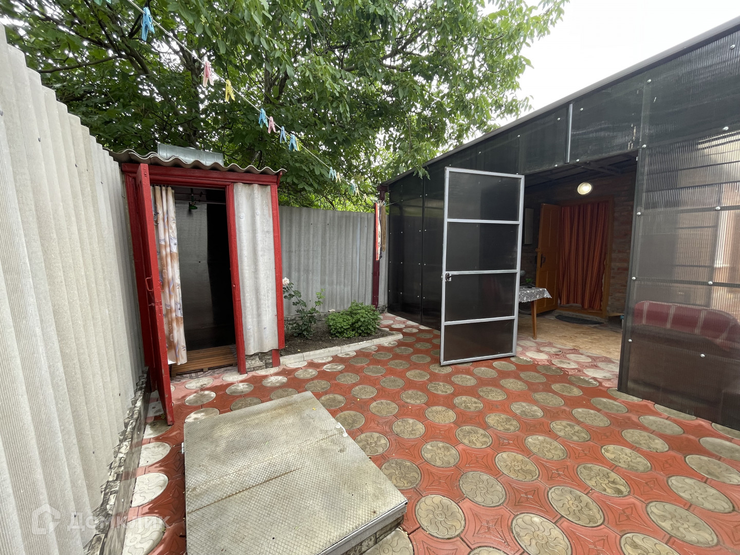 Участок имеет два въезда для машины с двух сторон. Двор выложен плиткой и ухожен. Вход в дом оборудован беседкой с навесом из поликарбоната, что обеспечивает тень и комфортное место для отдыха. На территории также имеется летняя кухня с водой и электричеством, которую можно использовать для дополнительного заработка.
