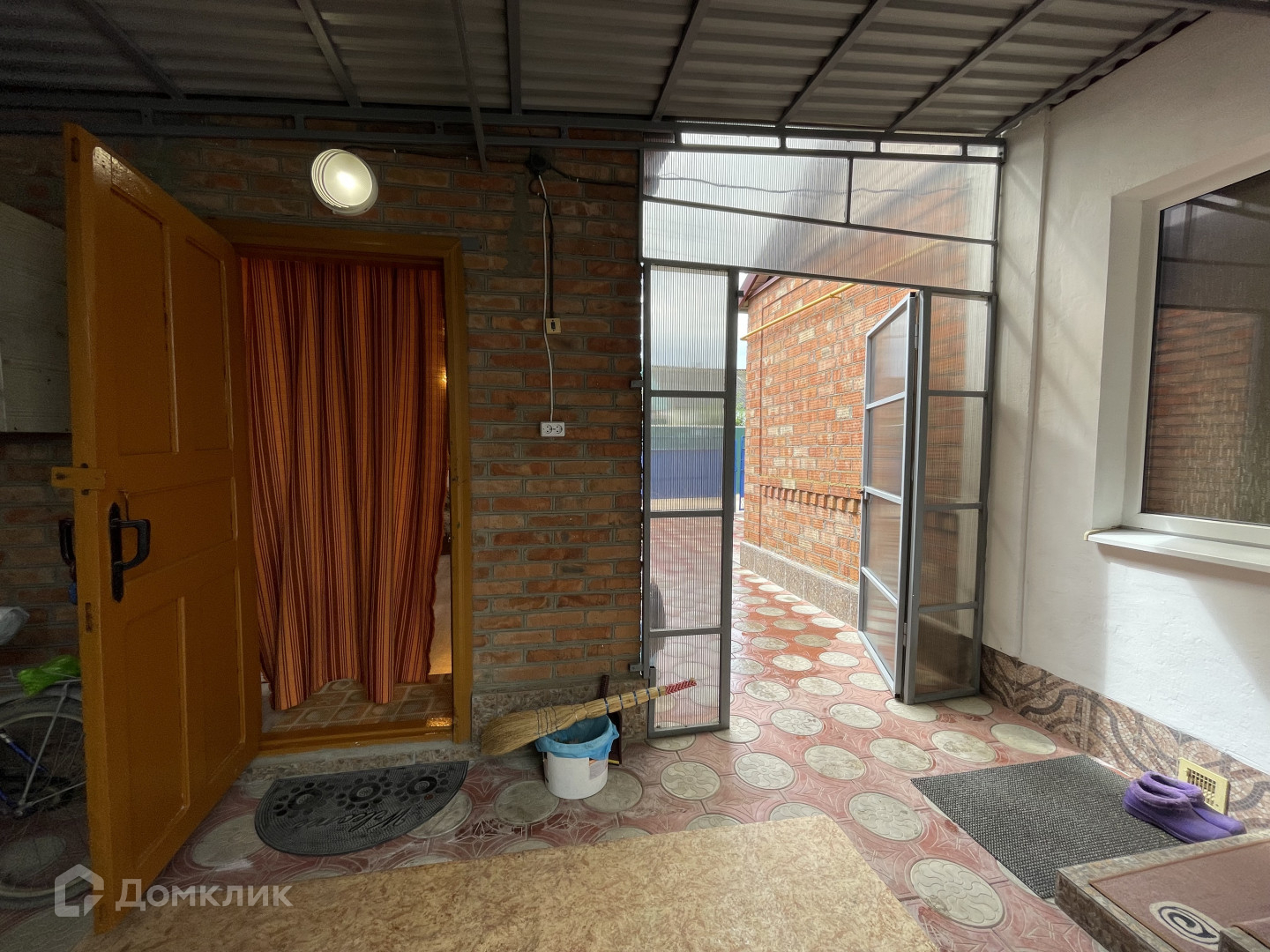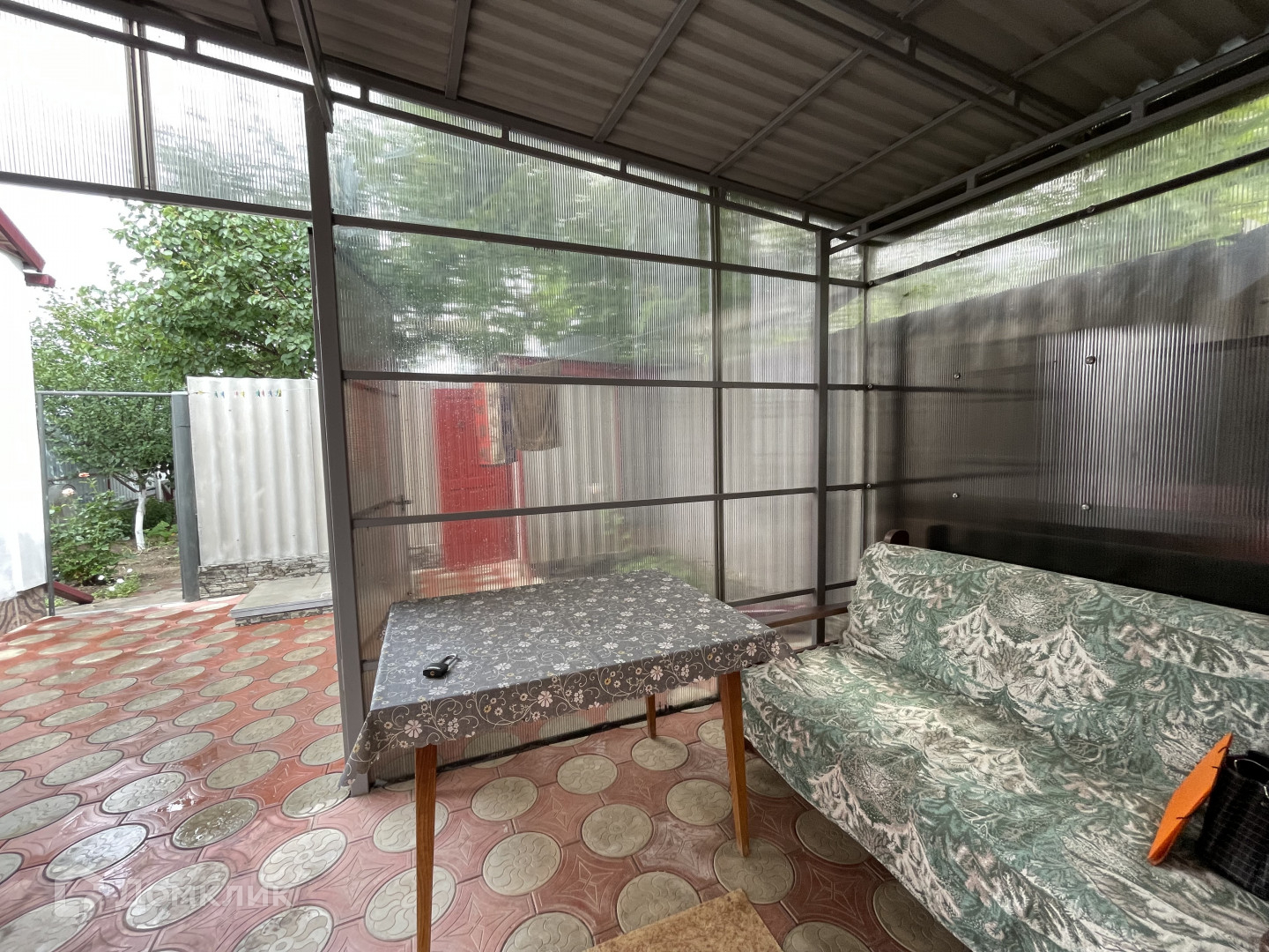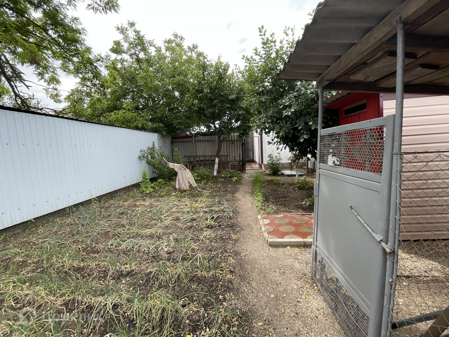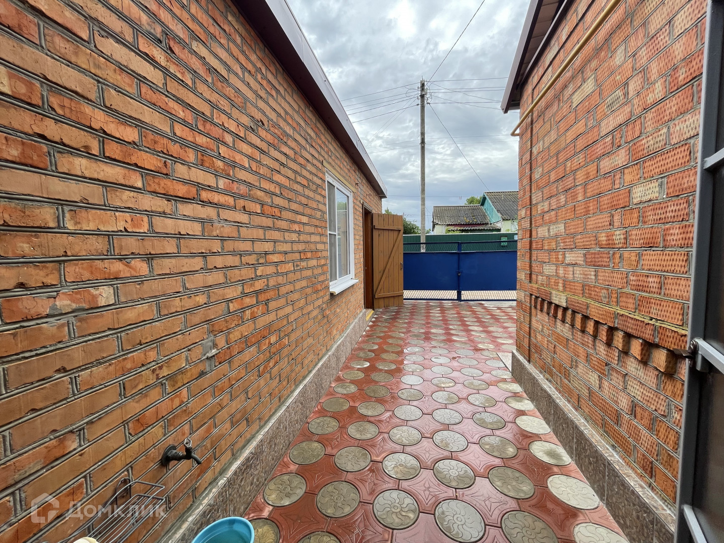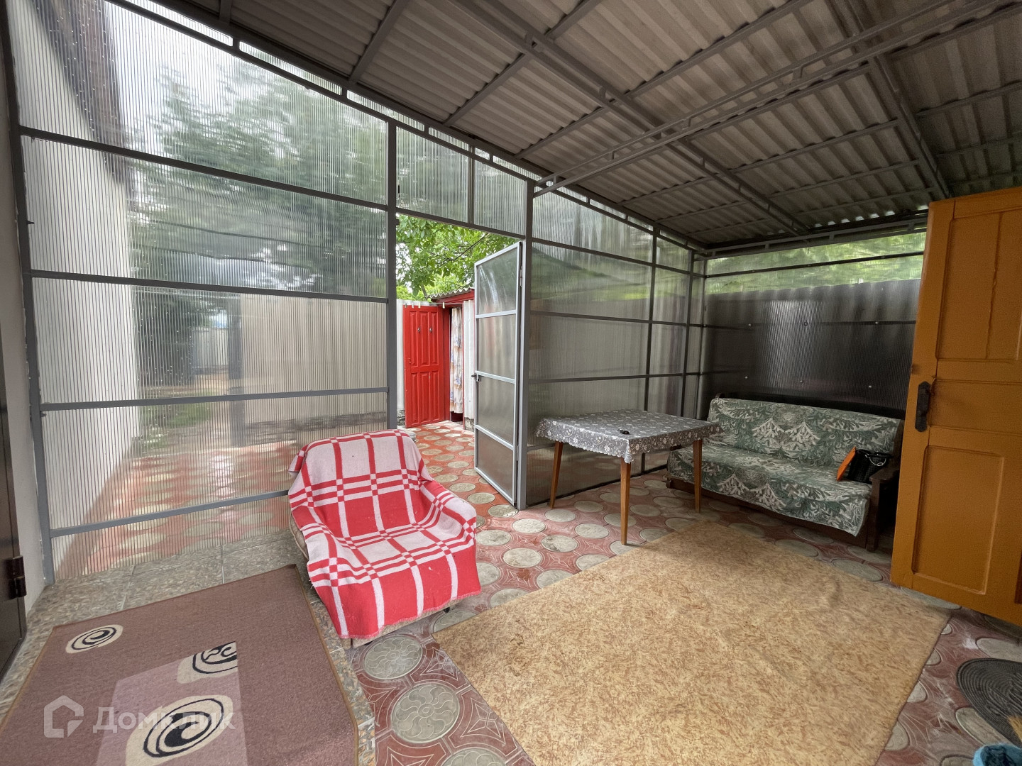 Участок имеет два въезда для машины с двух сторон. Двор выложен плиткой и ухожен. Вход в дом оборудован беседкой с навесом из поликарбоната, что обеспечивает тень и комфортное место для отдыха. На территории также имеется летняя кухня с водой и электричеством, которую можно использовать для дополнительного заработка.