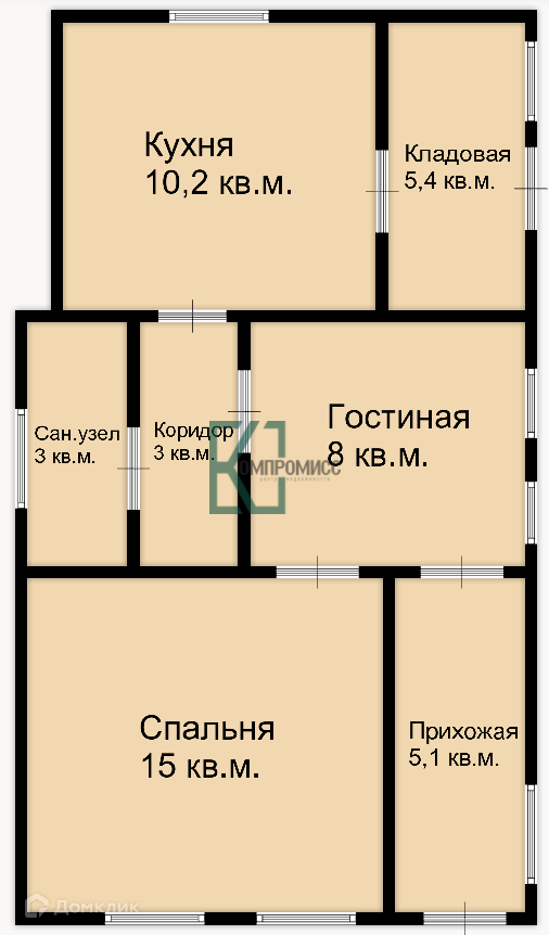 В доме спальня, гостиная, кухня, прихожая, кладовая, сан. узел.