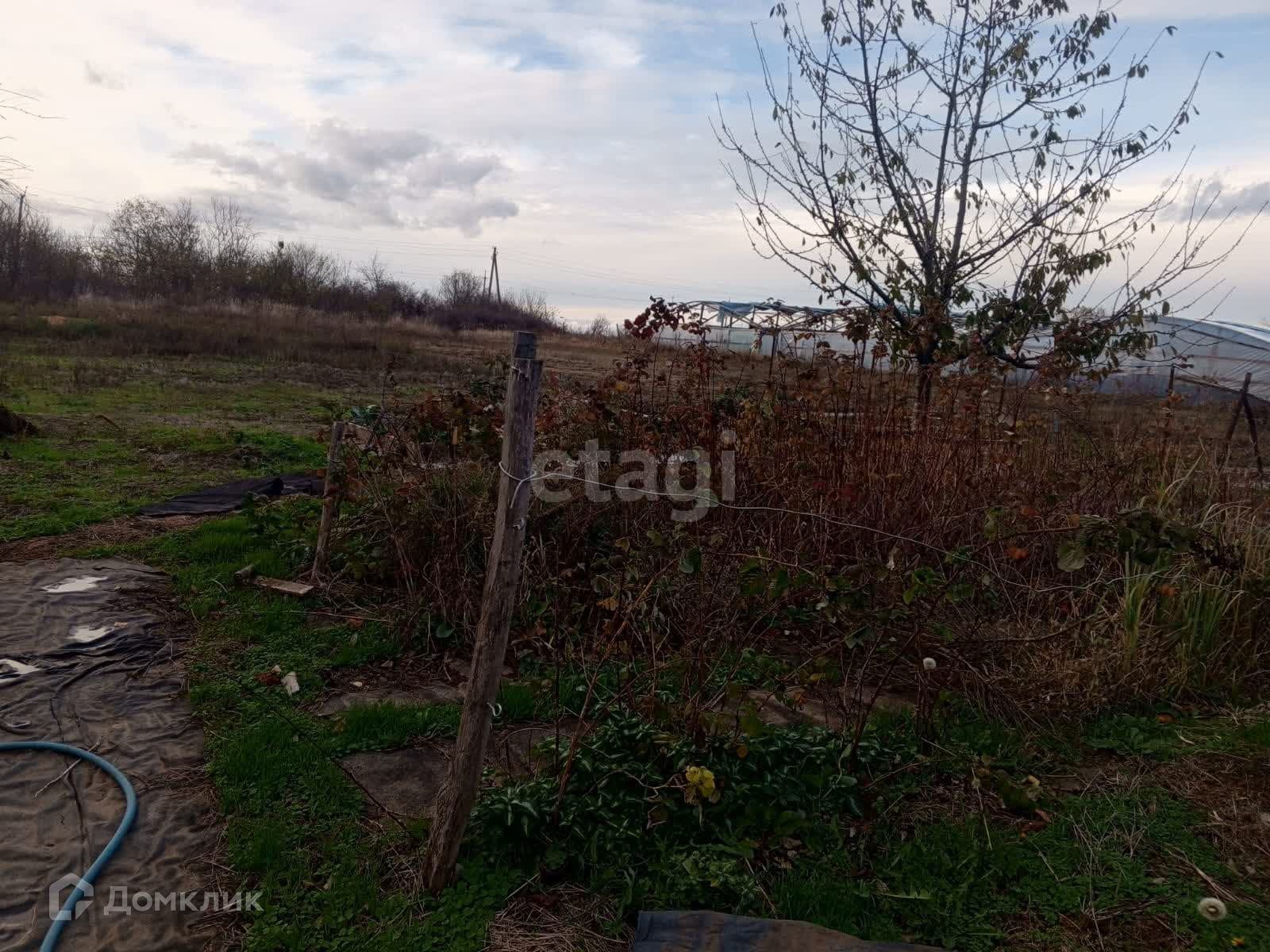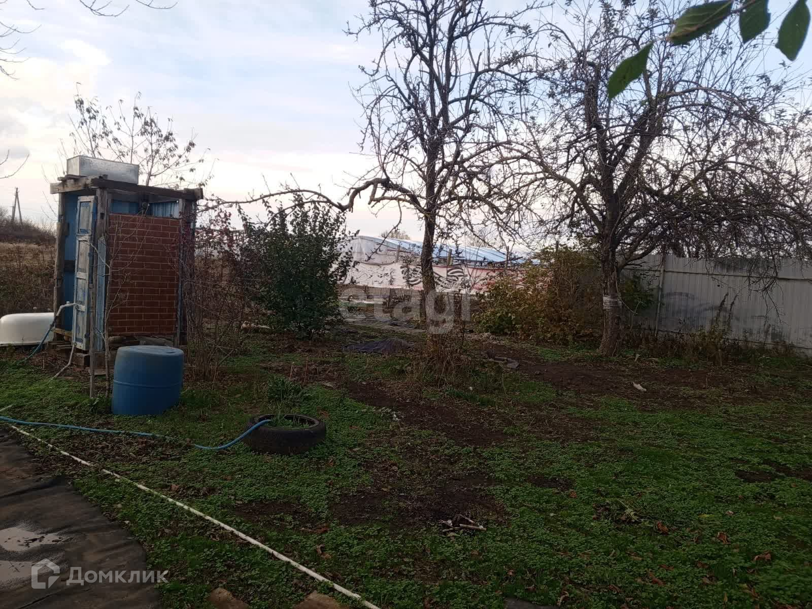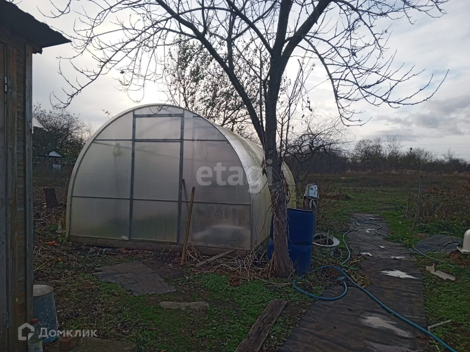 Есть теплица, в теплице стоит вода для полива. Небольшой сад с плодовыми деревьями: яблоко, груша, черешня.