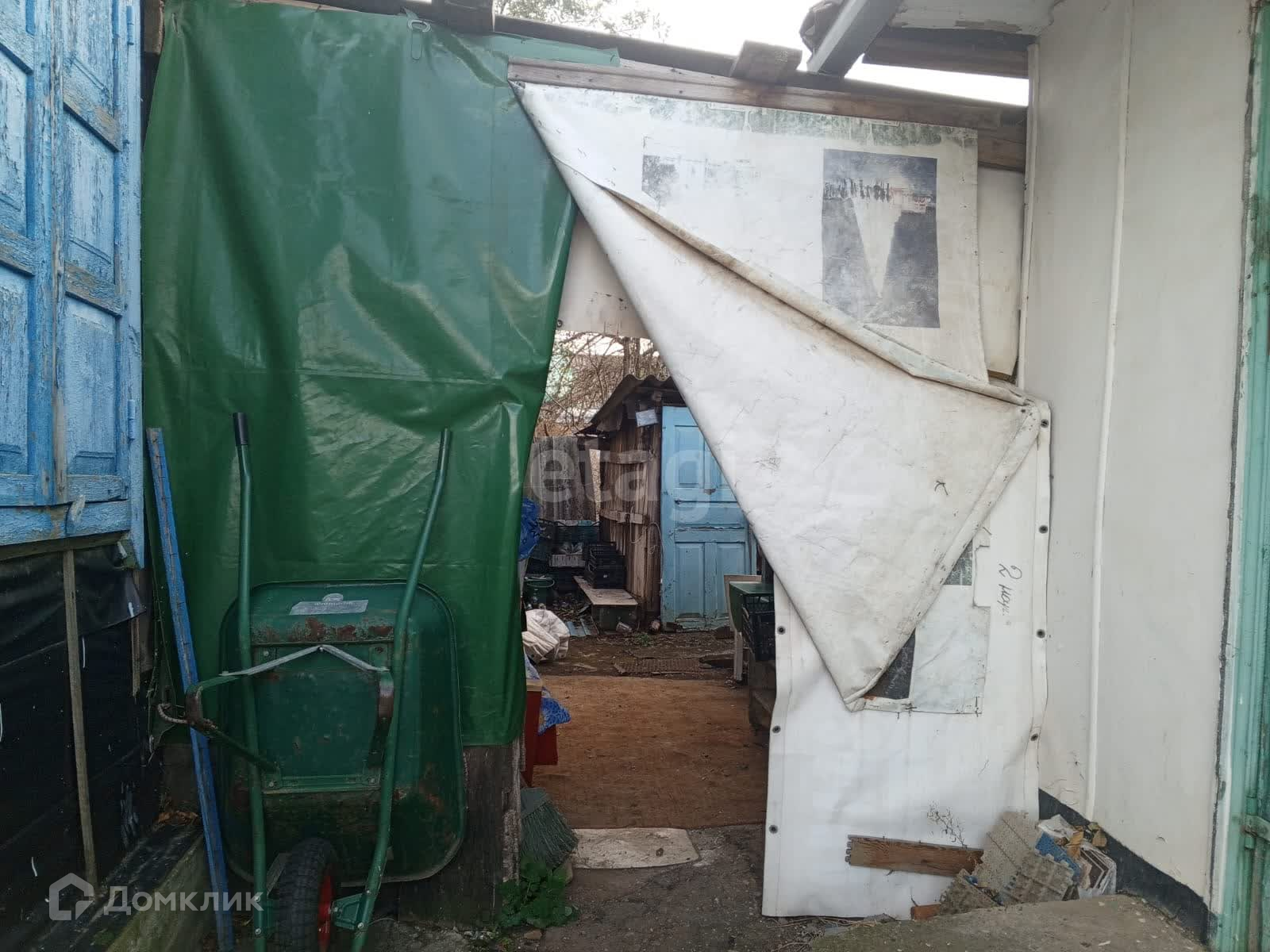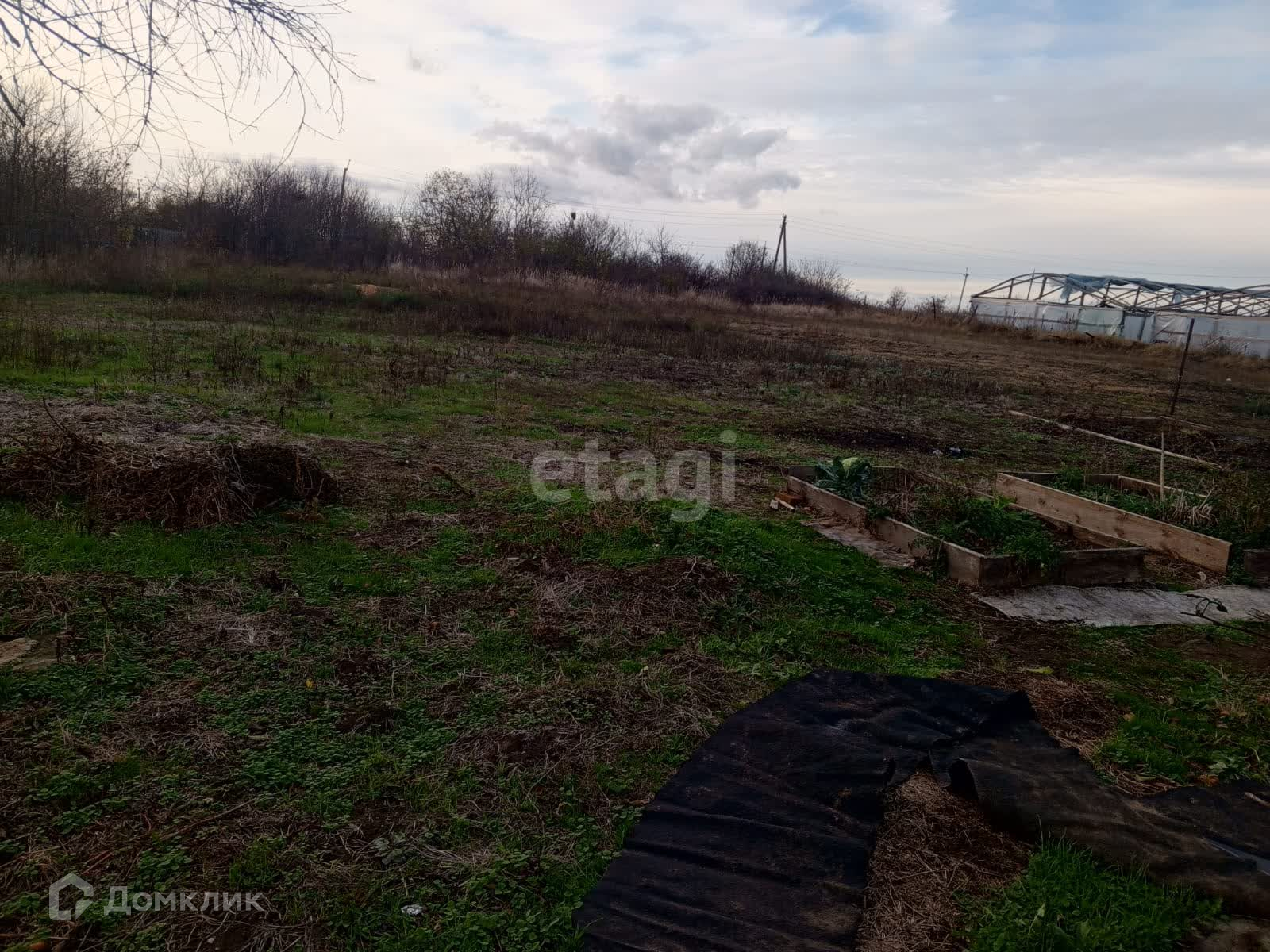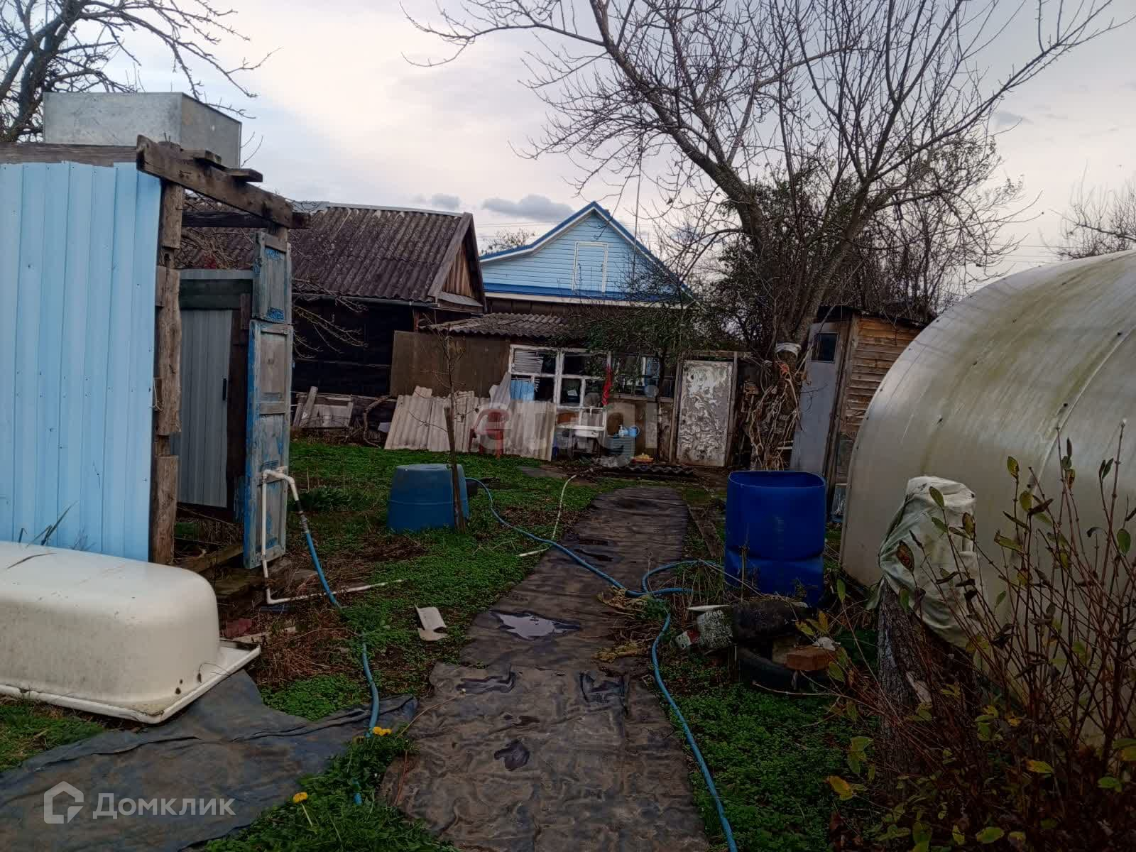 Есть теплица, в теплице стоит вода для полива. Небольшой сад с плодовыми деревьями: яблоко, груша, черешня.