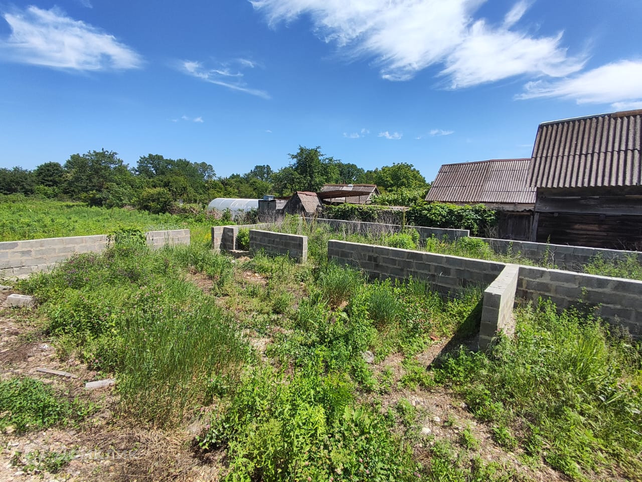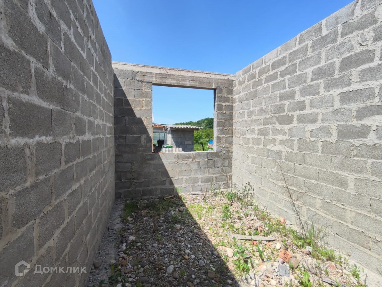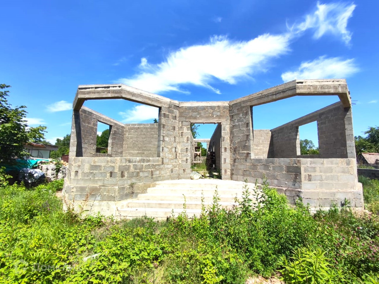 Дом на стадии строительства, возведены стены (под крышу) из блока на высоком, ленточном фундаменте, сделан сейсмопояс. Рядом с домом залит фундамент под гараж и хозяйственные постройки.