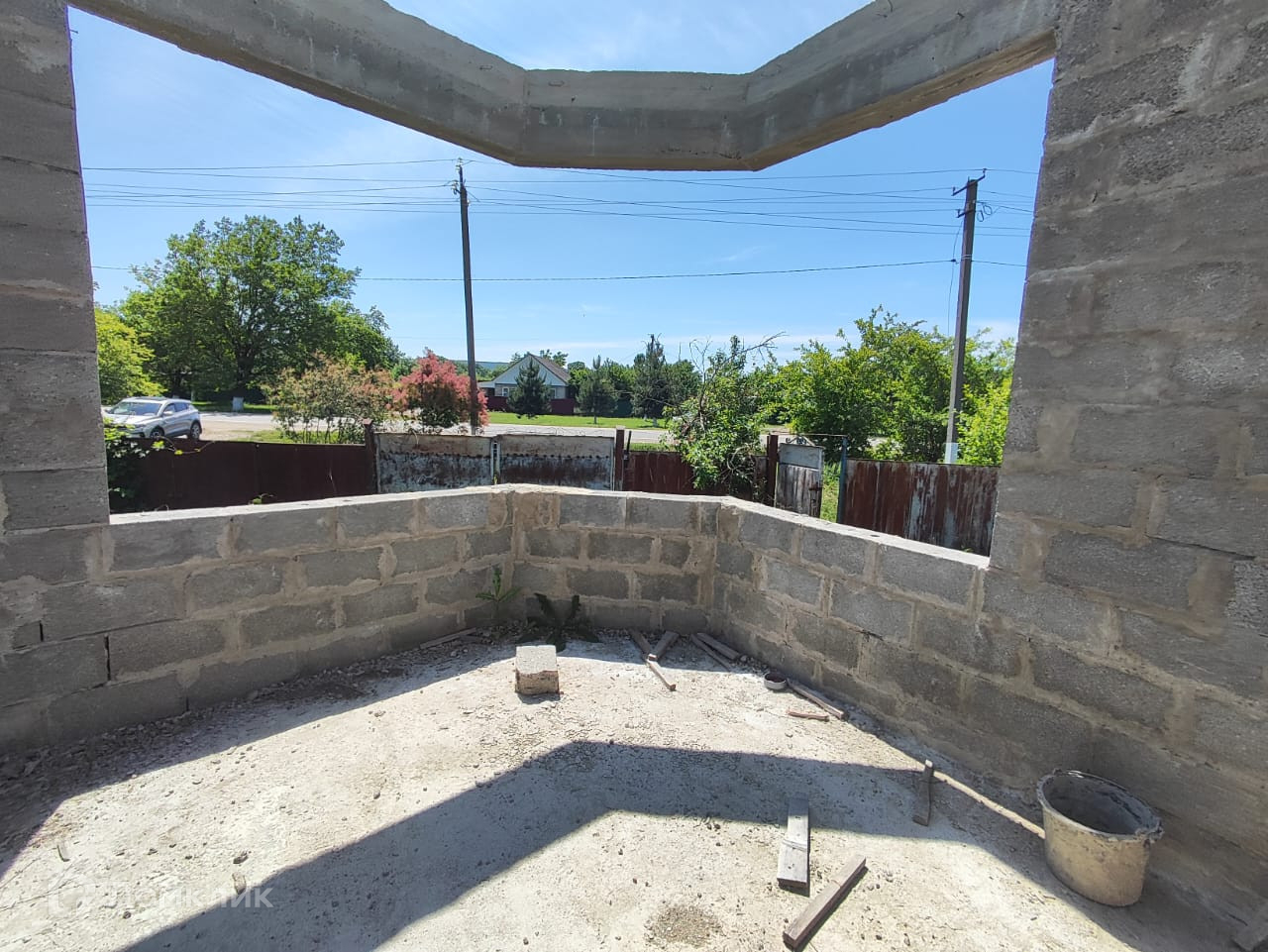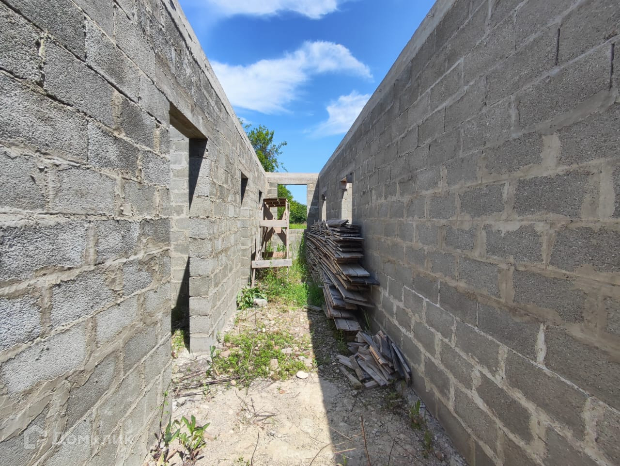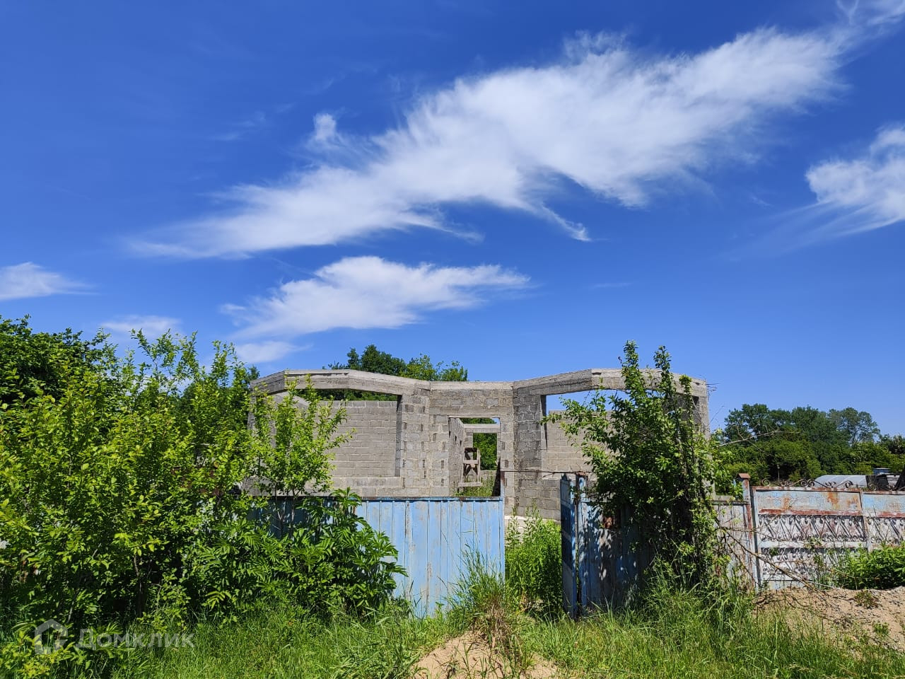 Дом на стадии строительства, возведены стены (под крышу) из блока на высоком, ленточном фундаменте, сделан сейсмопояс. Рядом с домом залит фундамент под гараж и хозяйственные постройки.