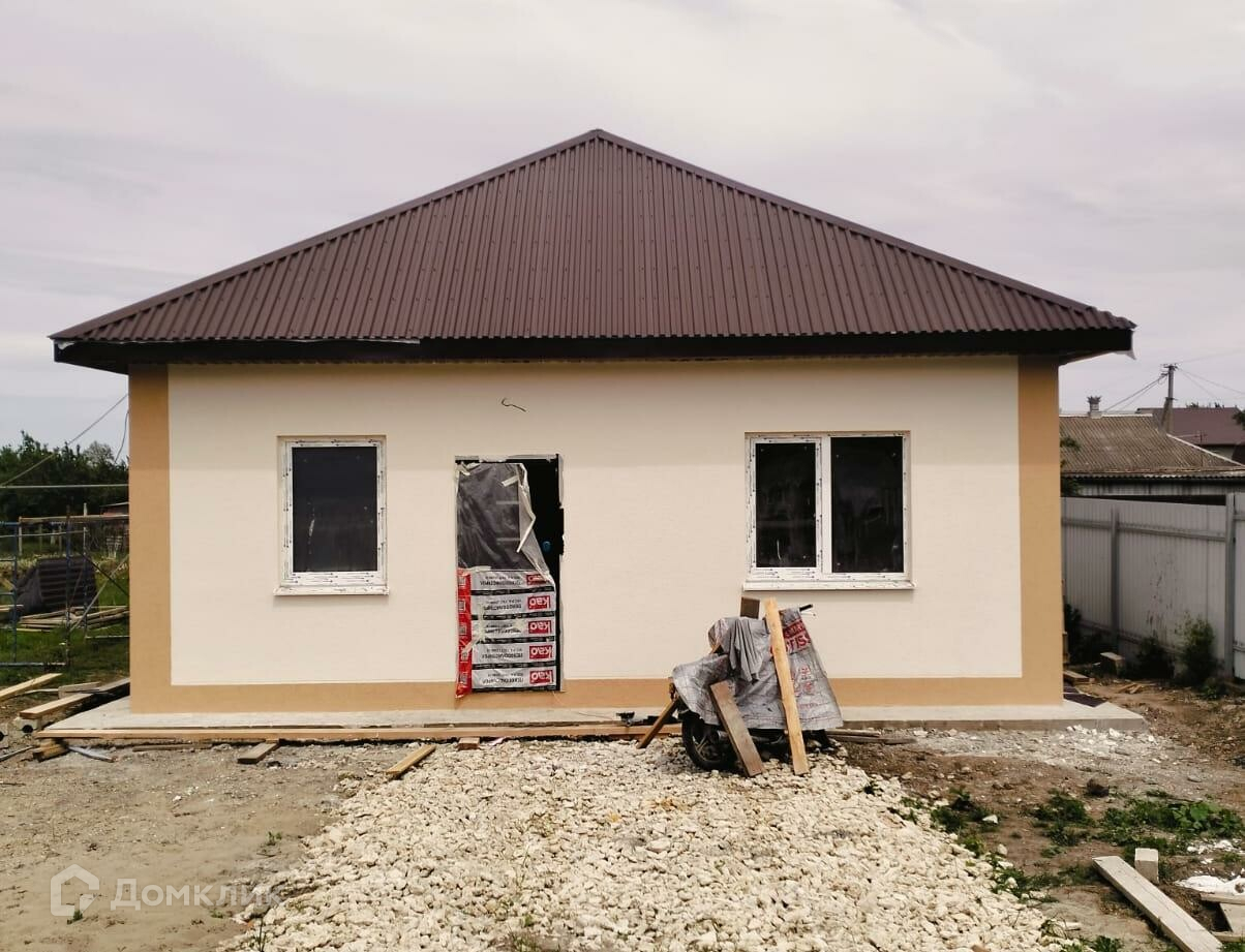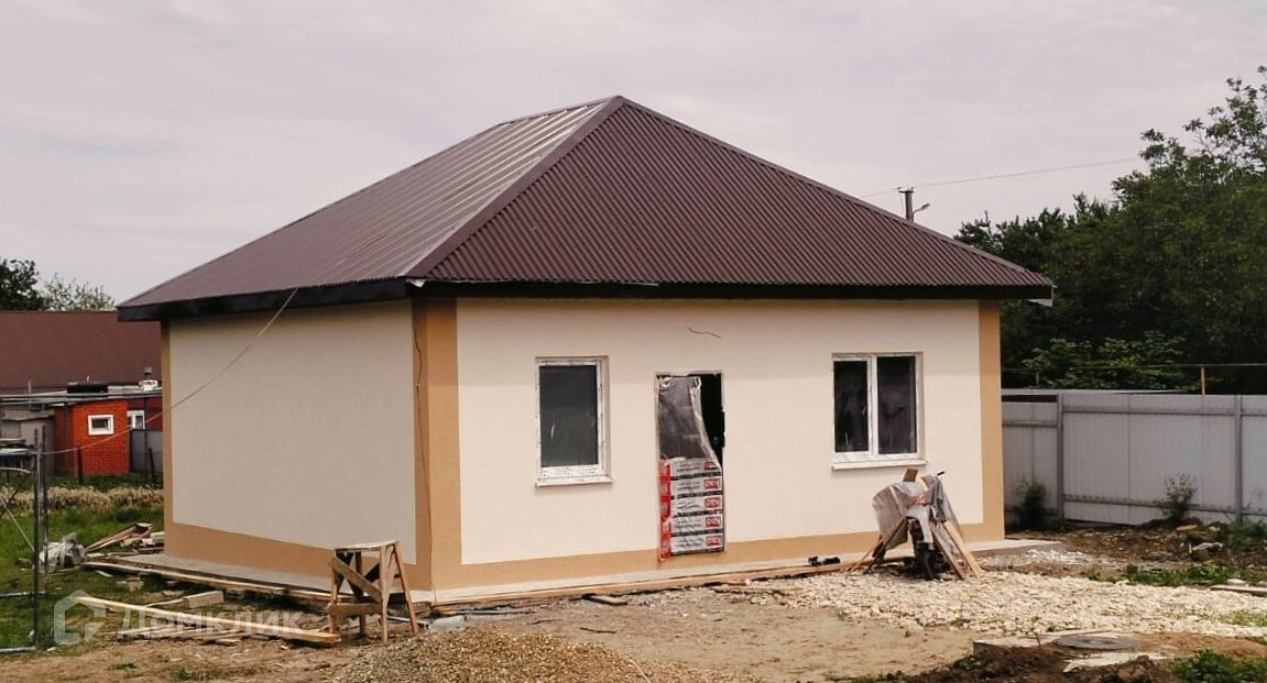 Ленточный армированный фундамент, стены - газоблок + утеплитель + короед, крыша - профнастил. Внутри - ламинат, плитка, тёплый пол, стены оштукатурены, наклеены обои, натянуты потолки. Кроме того, двухконтурный котёл, окна, двери (входные, межкомнатные), розетки, выключатели, светильники и т.п. Благоустройство двора, металлический забор.