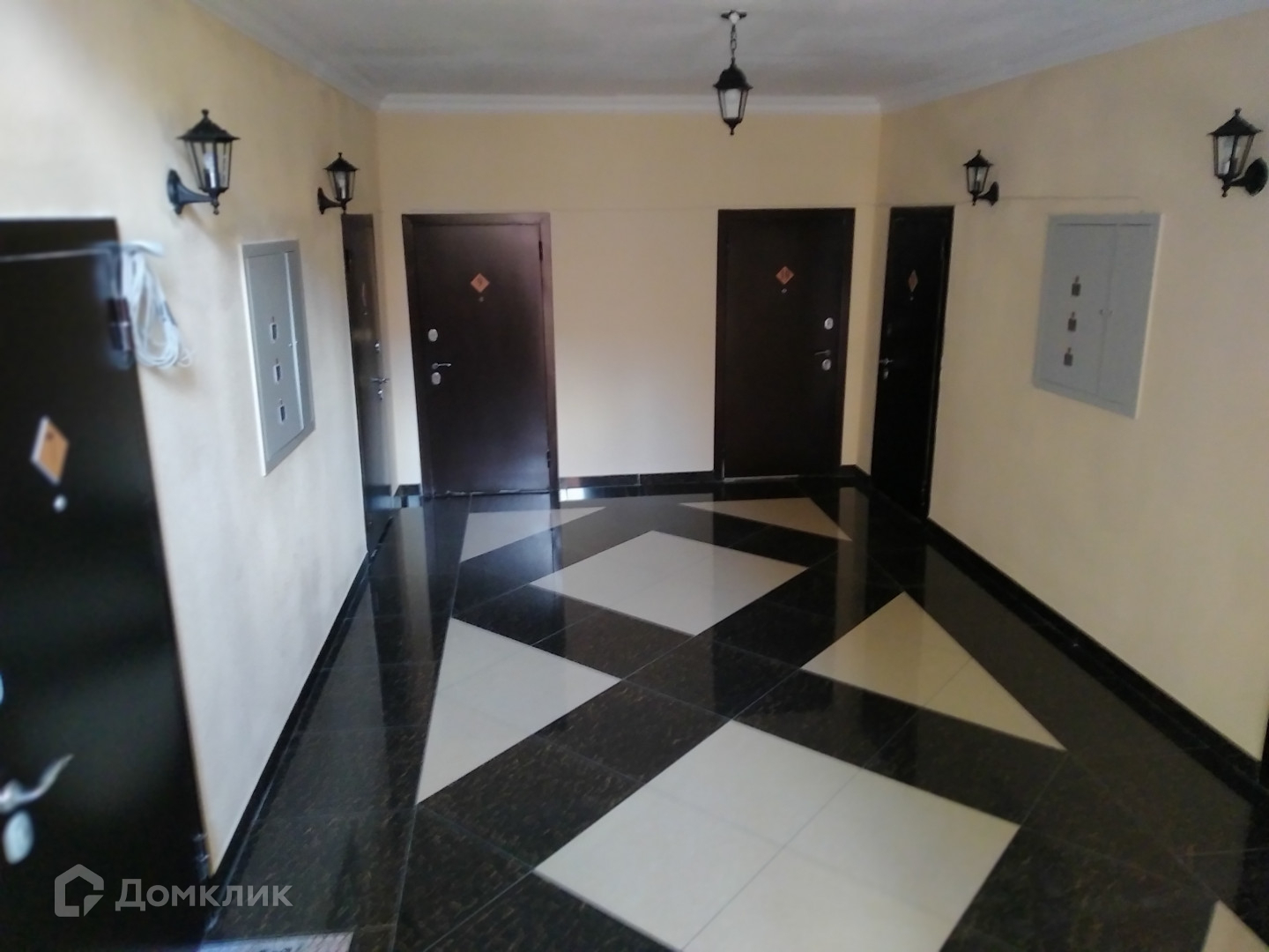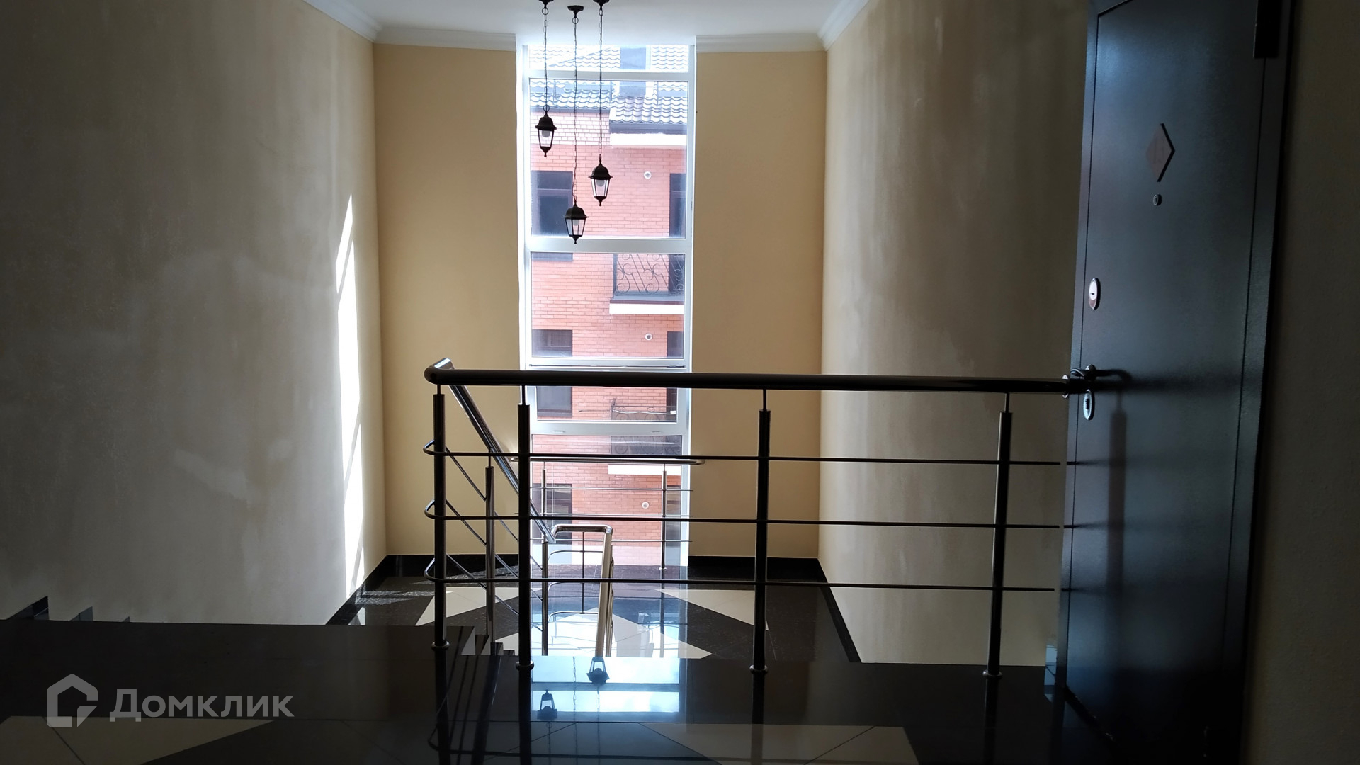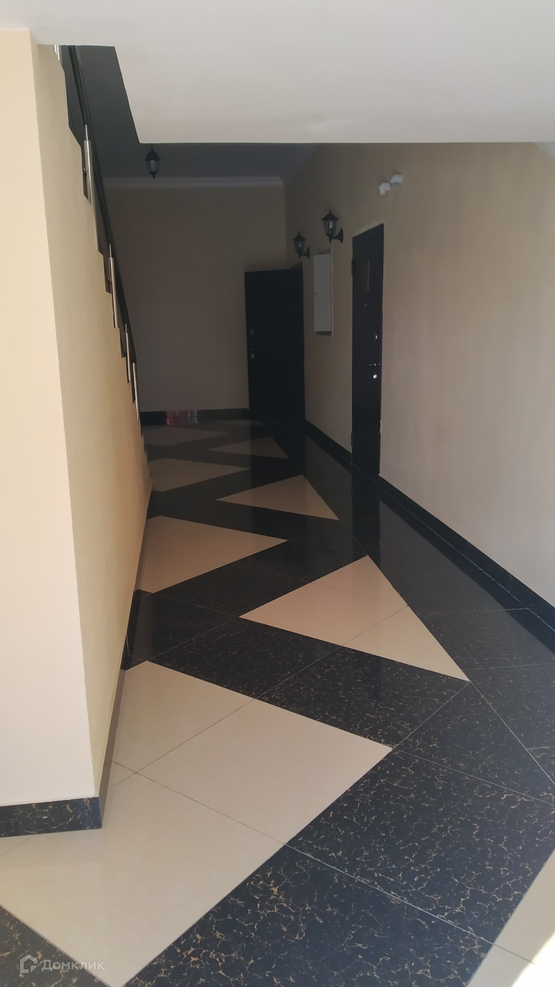 В подъезде широкие лестничные пролёты, но полу плитка, витражные окна.