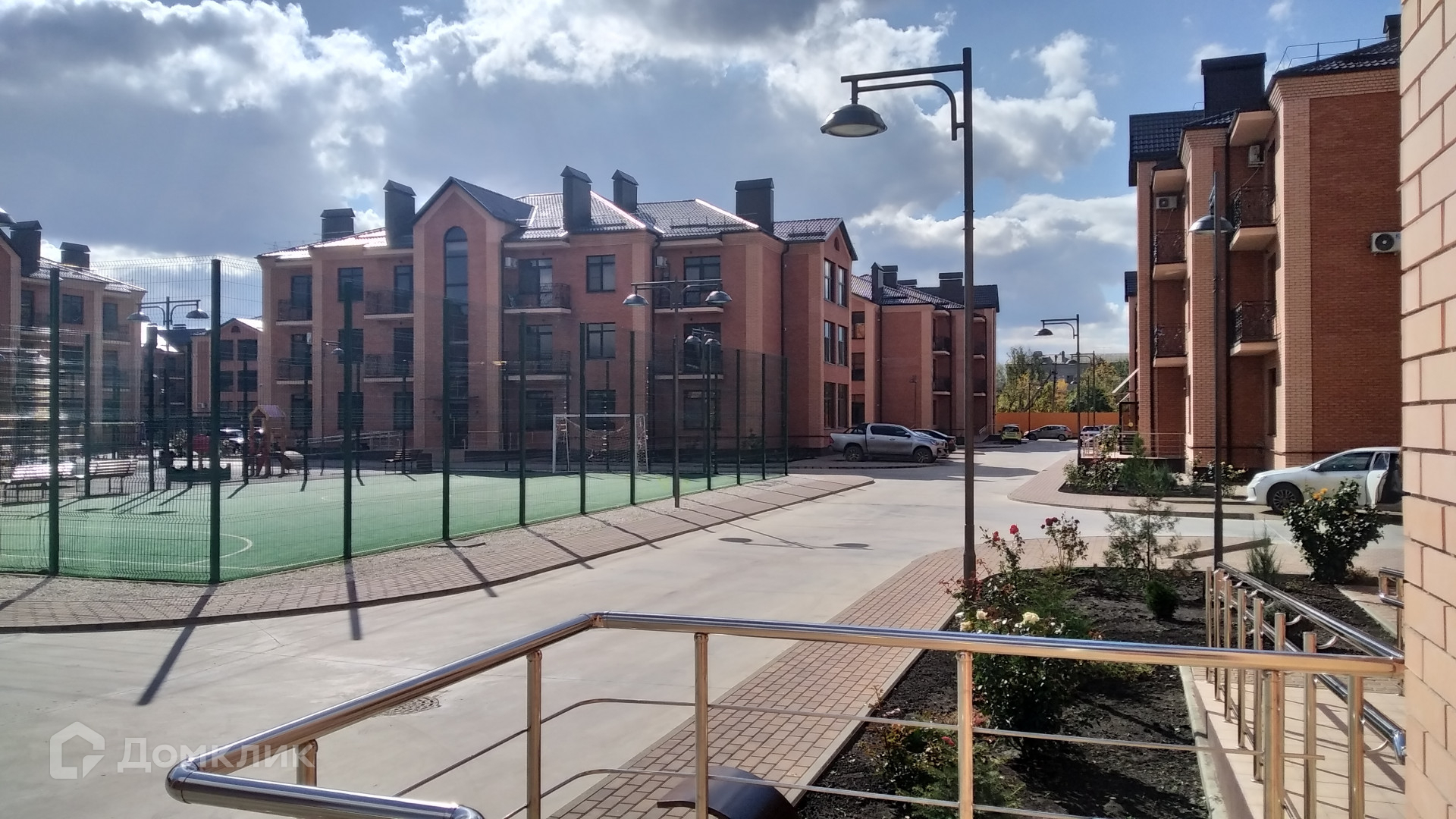Закрытый  двор выложен плиткой, собственная детская площадка, клумбы с розами, лавочки, достаточно парковочных мест. Два выезда со двора: основной на Ленина, дополнительно на Комсомольский. На Комсомольском современный детский сад.