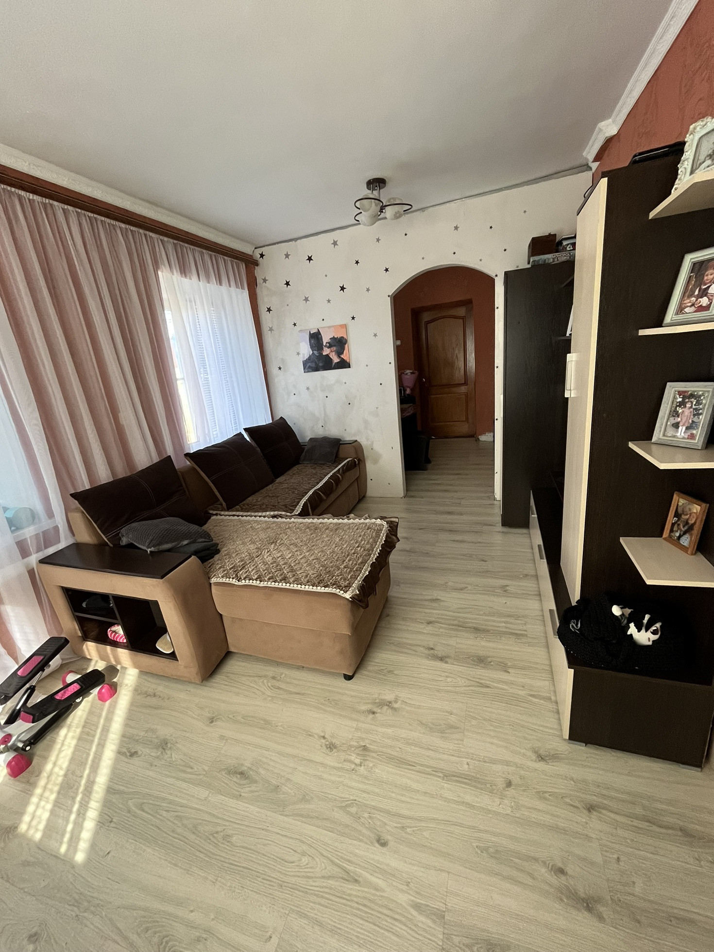 Дом саманный, летом держит прохладу, зимой тепло. Газ, свет, канализация. Недавно поменяли газовую колонку. Гостиная, зона столовой, спальни застелены ламинатом. В санузле плитка.