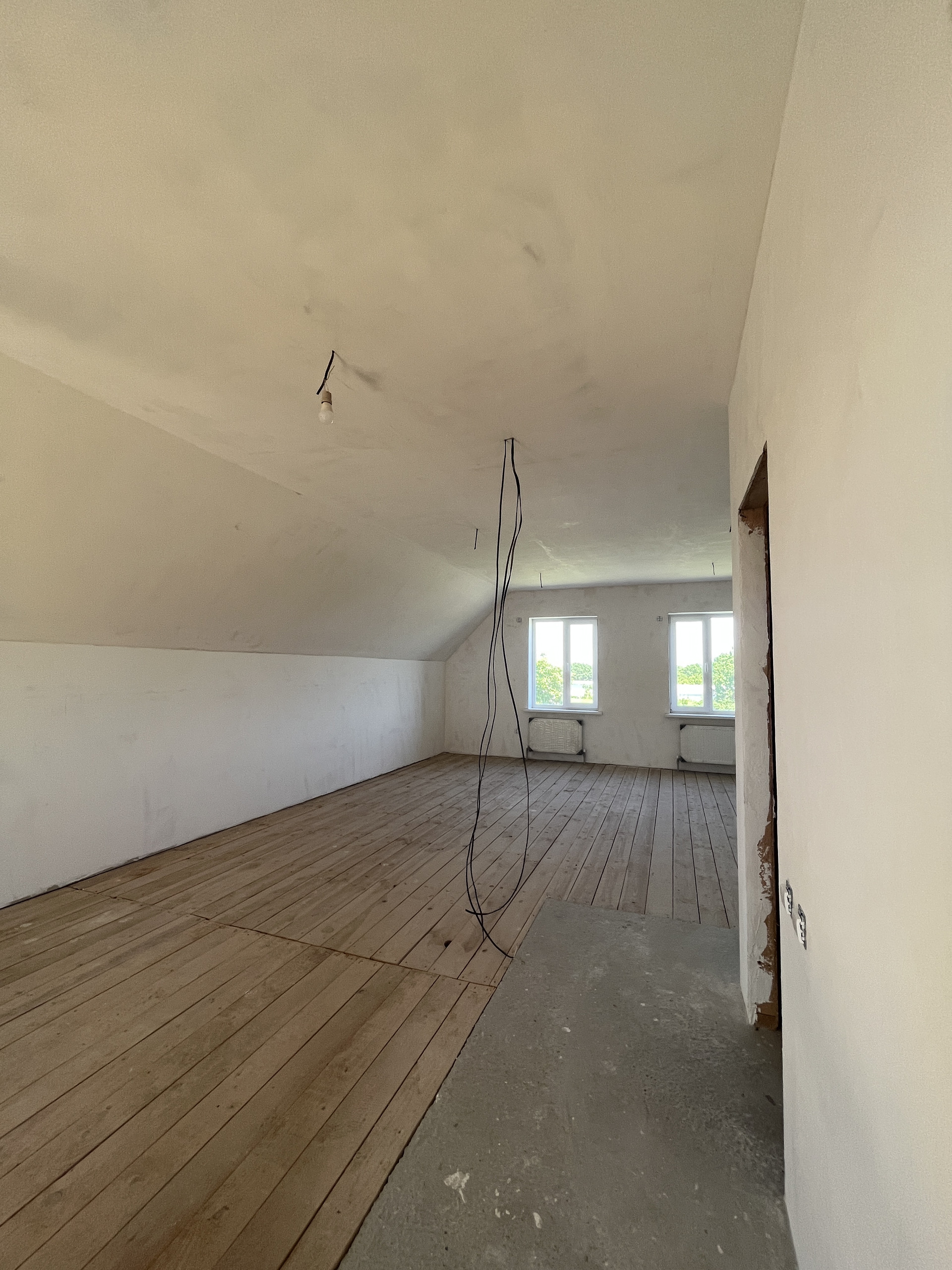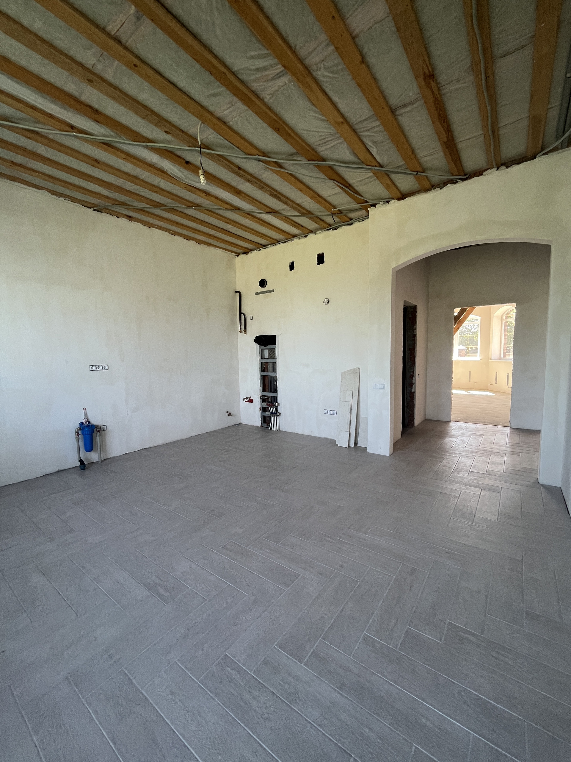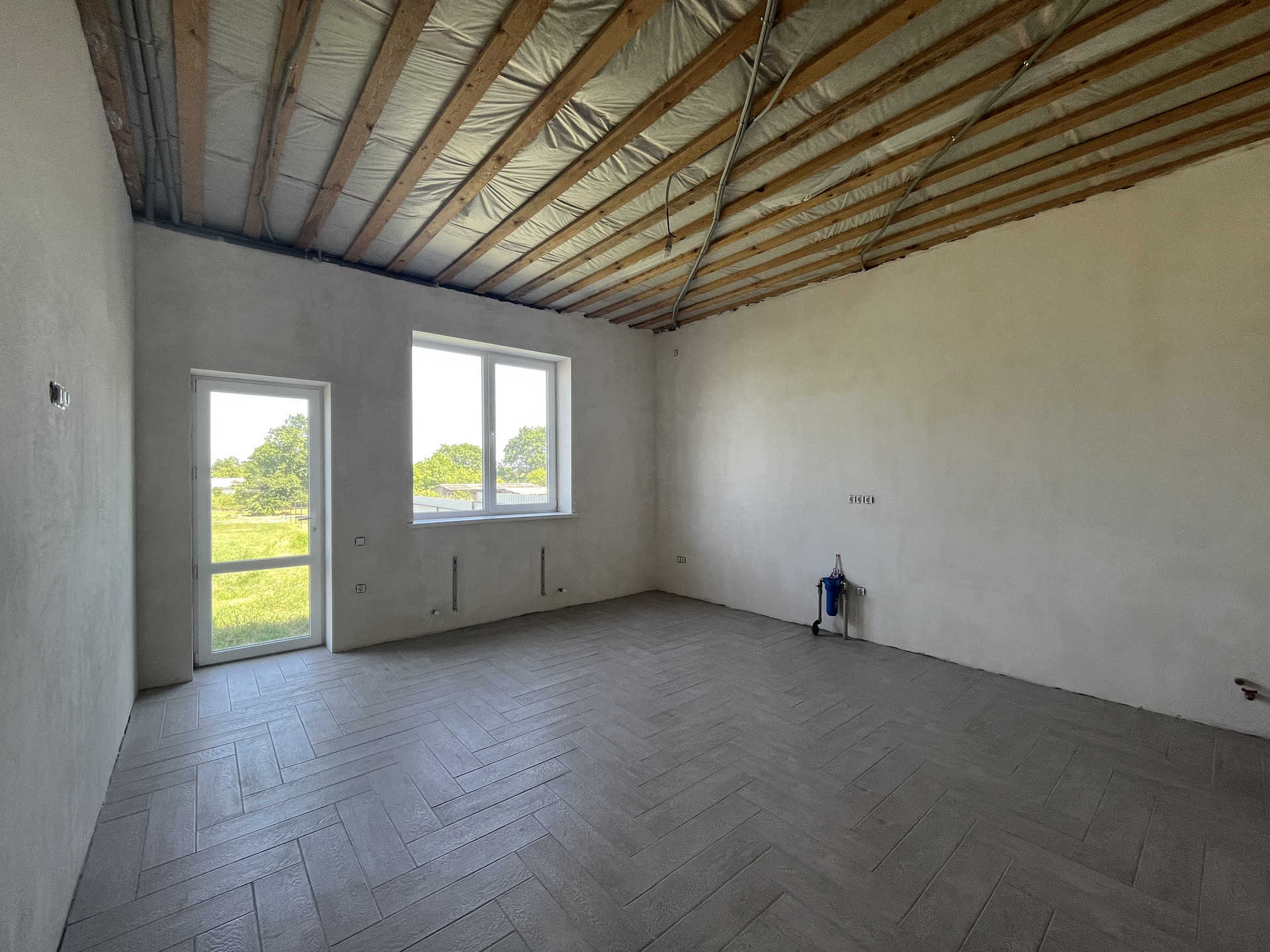 В доме выполнен частичный ремонт, в местах тёплого пола положена плитка, штукатурка, разводка электрического, сантехнического и отопительного оборудования, двухконтурный газовый котел, радиаторы отопления, поставлены розетки и выключатели, выводы под сплит-системы.