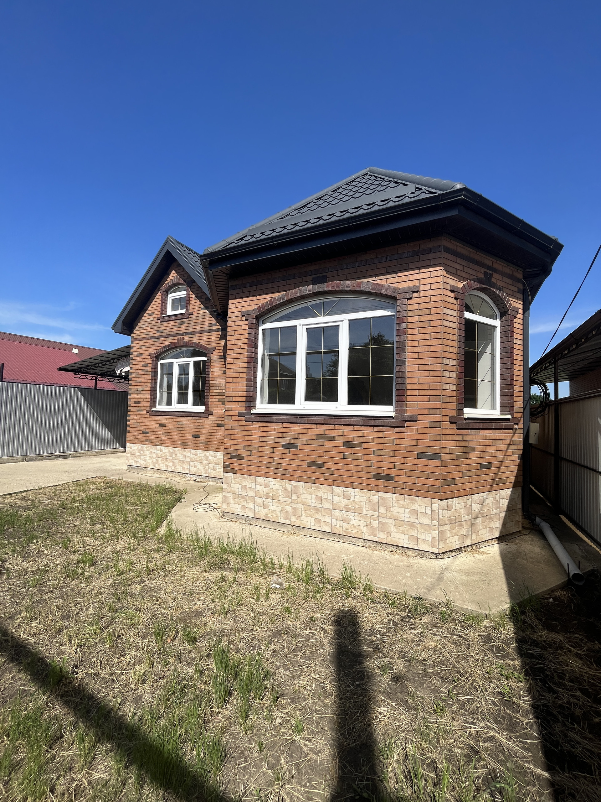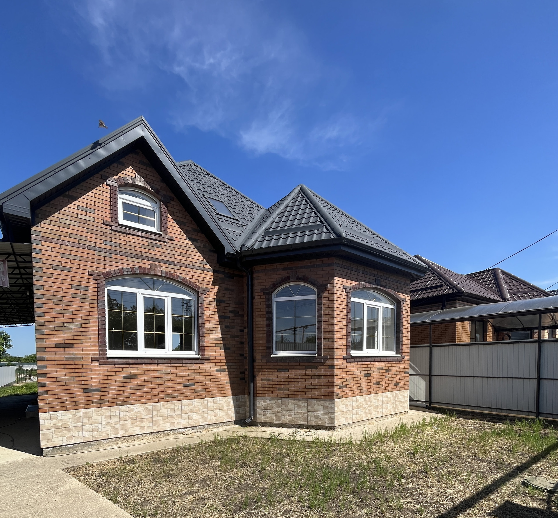 Дом возведен полностью из кирпича с использованием качественных строительных материалов: ленточный фундамент, цоколь отделан декоративным камнем, стены — забутовочный кирпич, наружные —облицовочный керамический кирпич, большие металлопластиковые окна с декоративной раскладкой, кровля — металлочерепица, качественные входные двери.