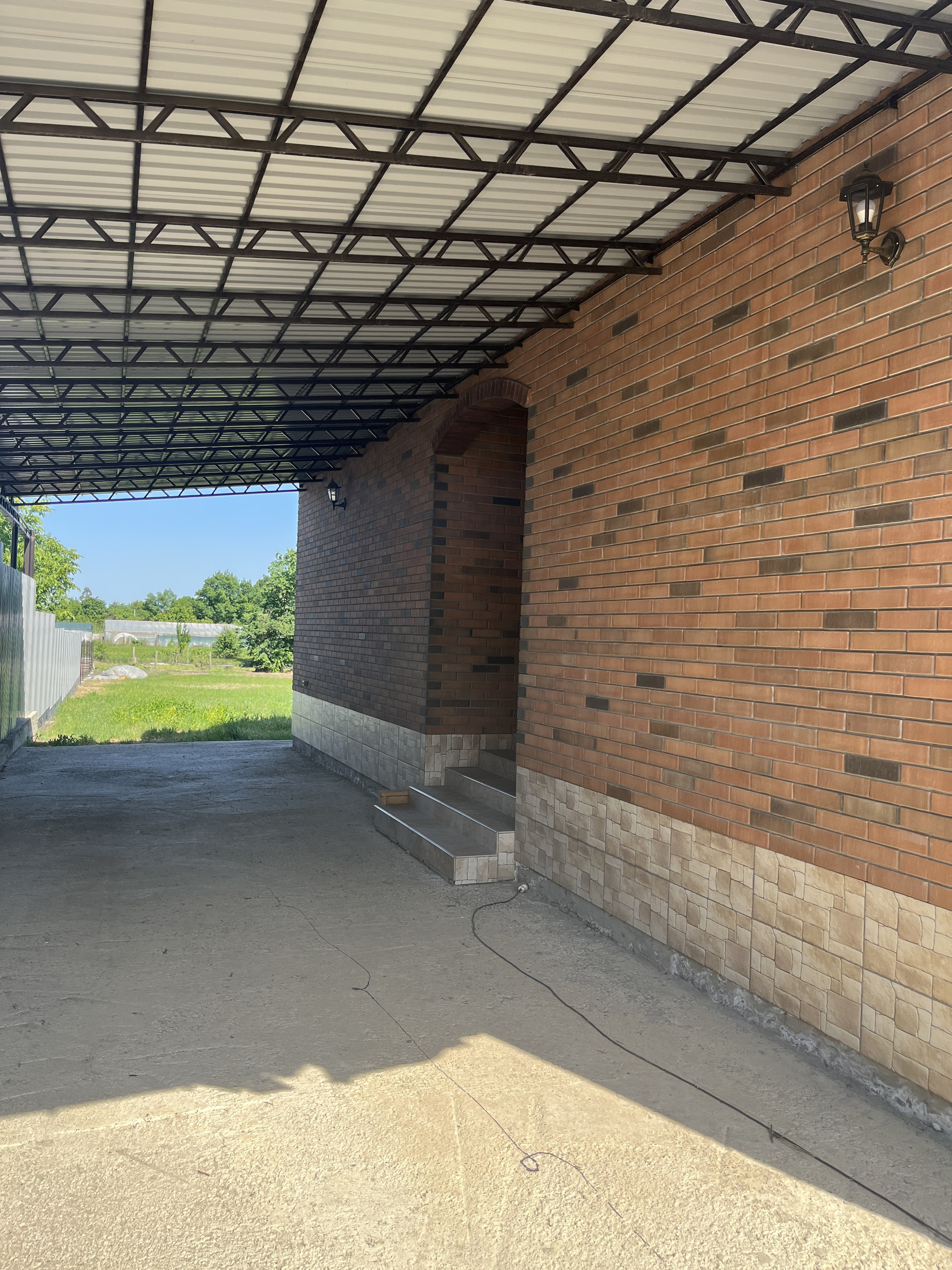 Двор забетонирован, отмостка, парковочные места для автомобилей.
