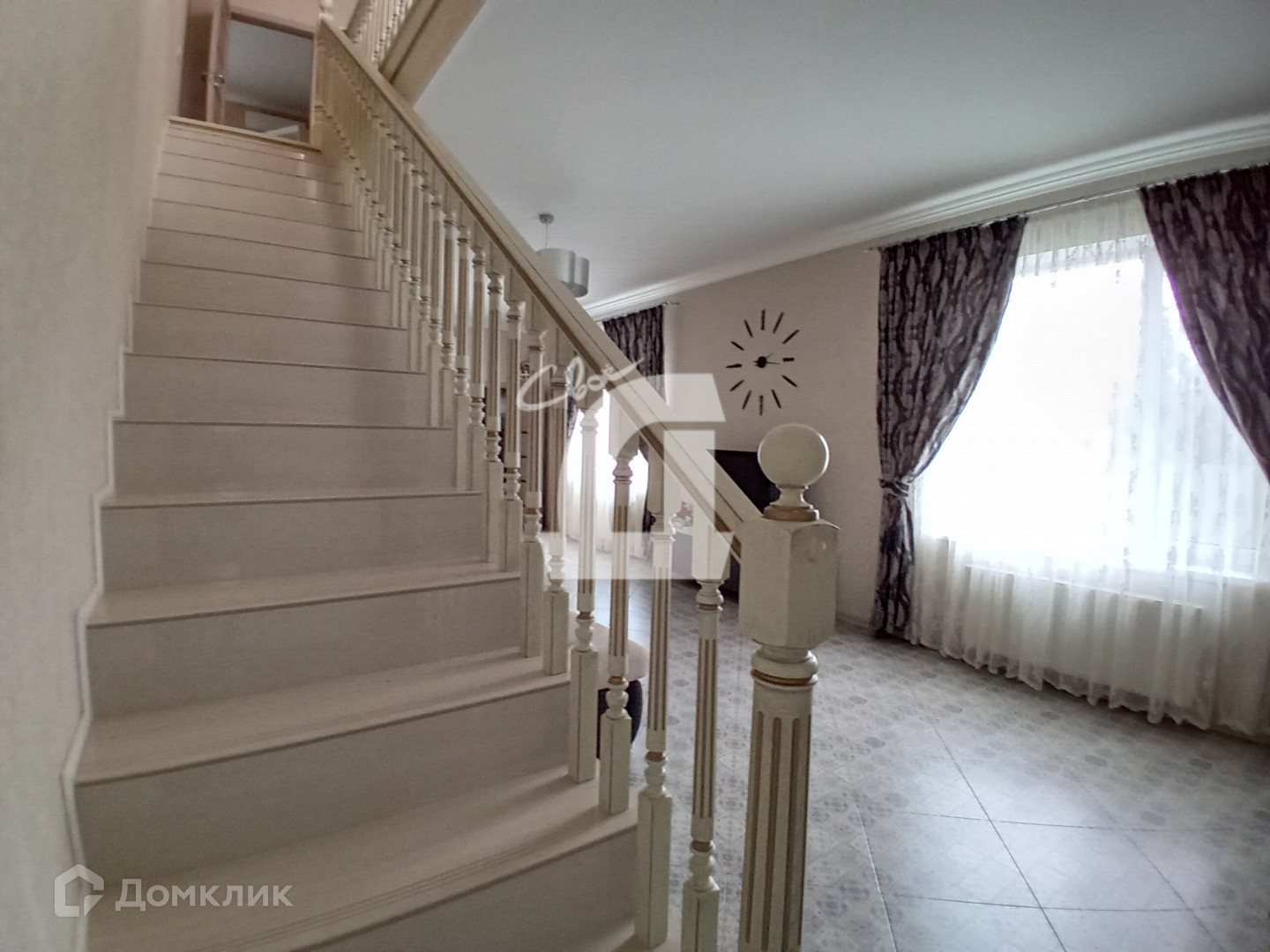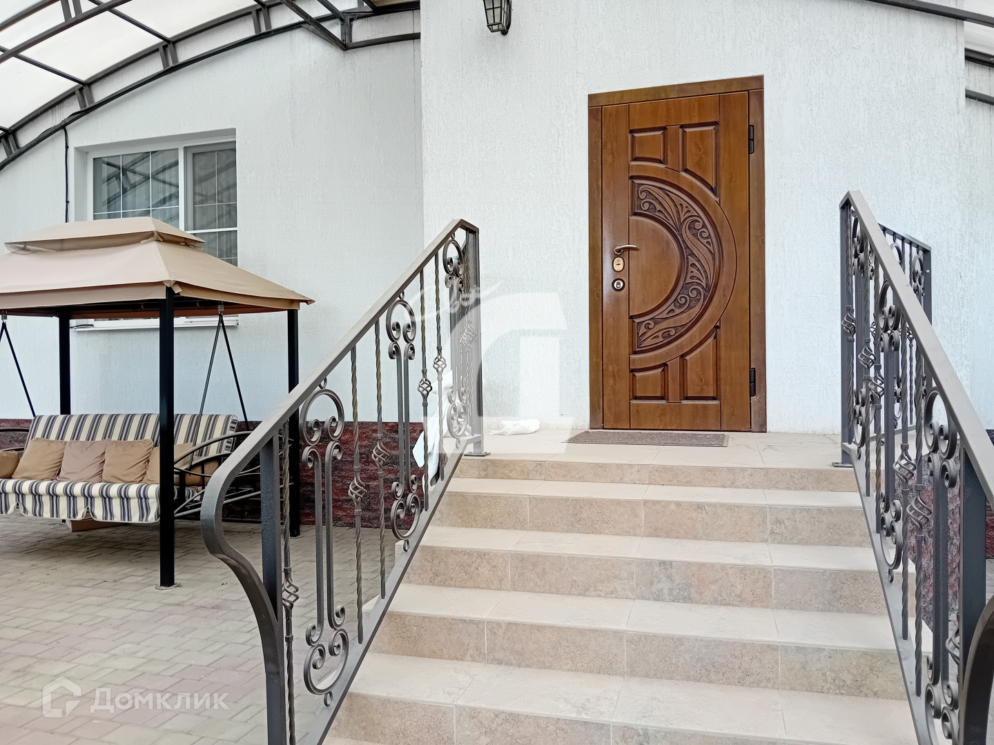 В дом ведет гостеприимная высокая кованная лестница, установлена красивая надежная дверь с тремя степенями защиты