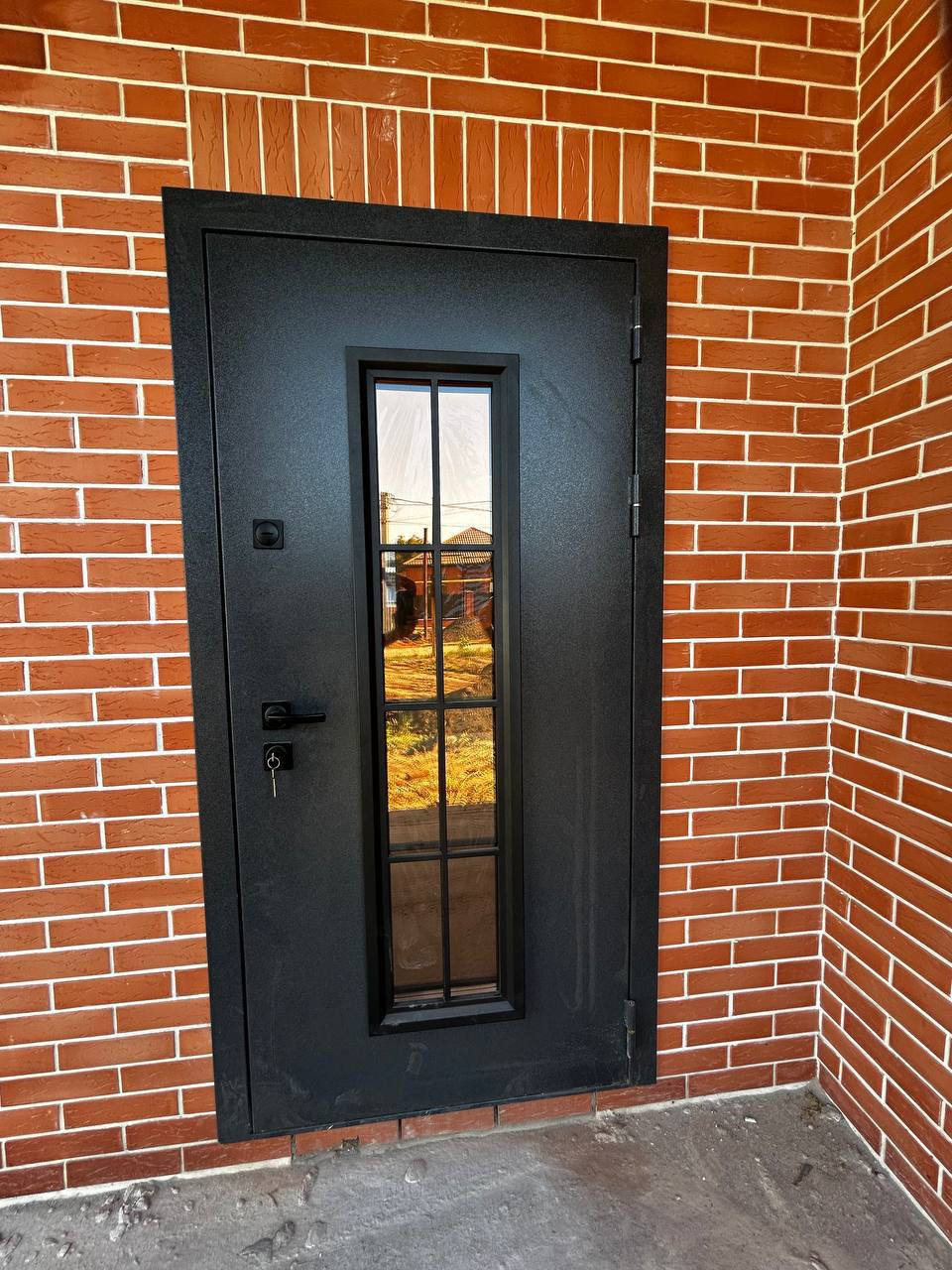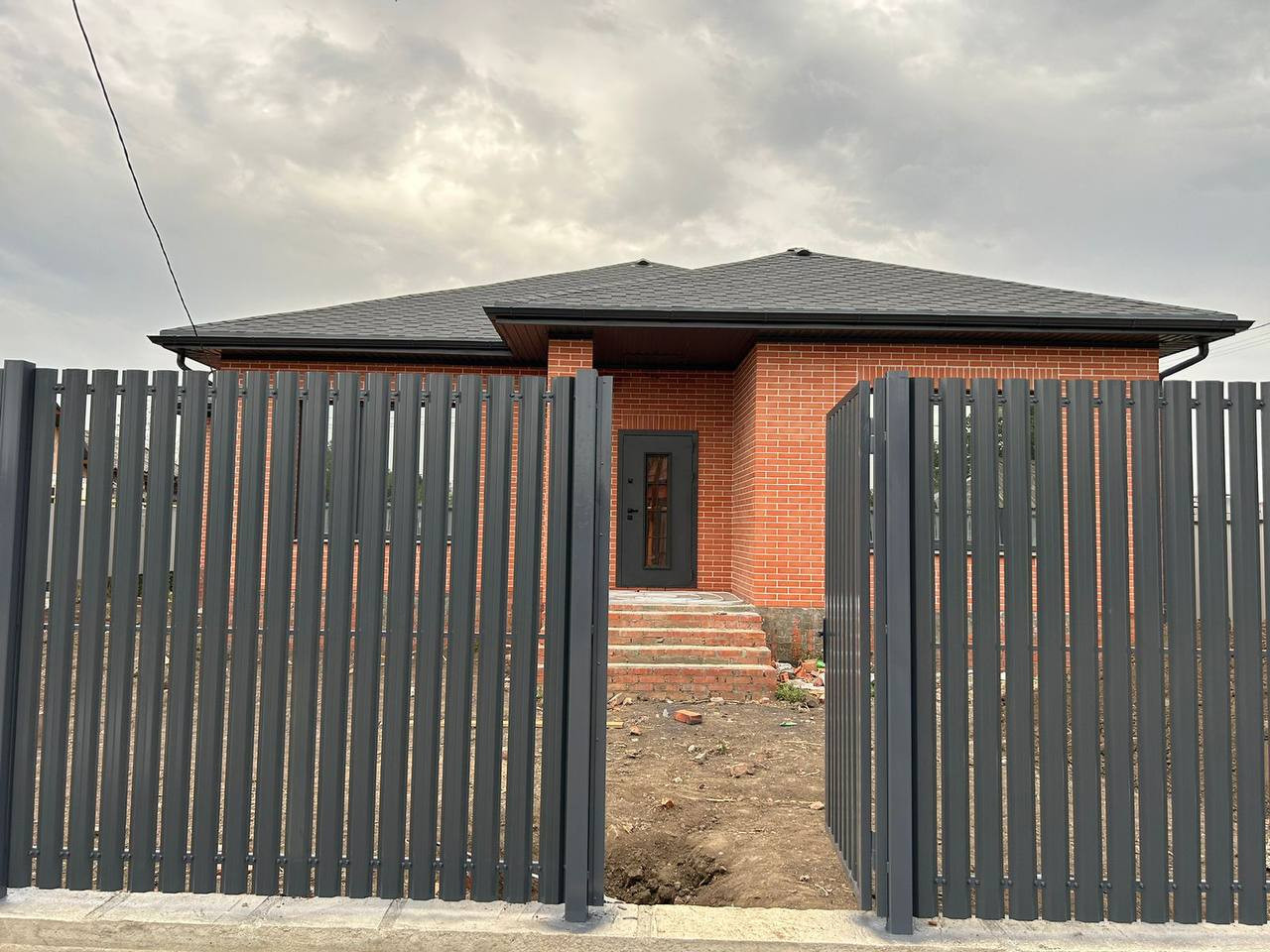 Одноэтажный коттедж возведен на ленточном фундаменте, материал стен — кирпич, наружные — керамический облицовочный кирпич, большие панорамные металлопластиковые окна с внешней ламинацией, кровля — металлочерепица, входные двери.