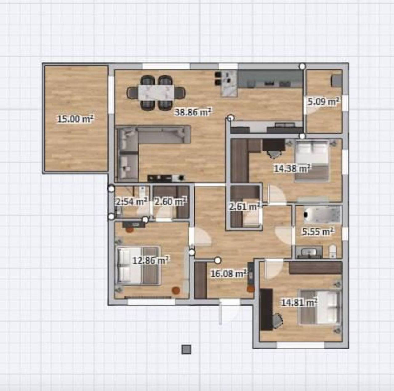 Одноэтажный коттедж общей площадью 139 кв.м эргономичной очень классной планировки, комфортной для проживания семьи: холл 16,8 кв.м, три спальни, одна из которых мастер-спальня со своей гардеробной и санузлом, еще одна спальня со своей гардеробной, совмещенный санузел 5,55 кв.м, кухня-гостиная 48,86 кв.м с выходом на крытую террасу 15 кв.м, котельная 5,09 кв.м.