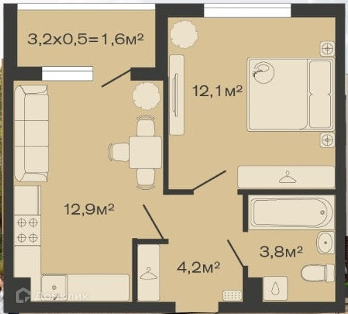 Общая площадь 34.6 м2