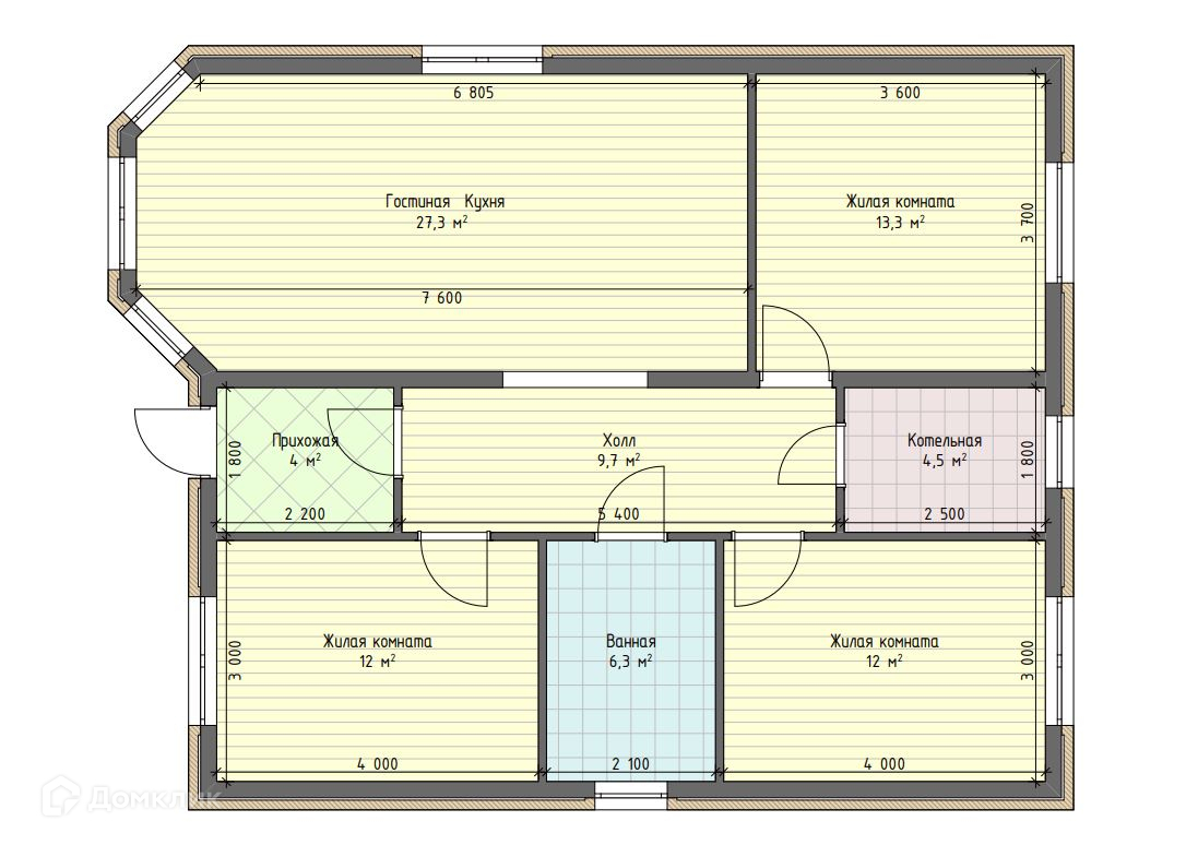В доме 3 жилых комнаты, коридор, котельная и кухня-гостиная.