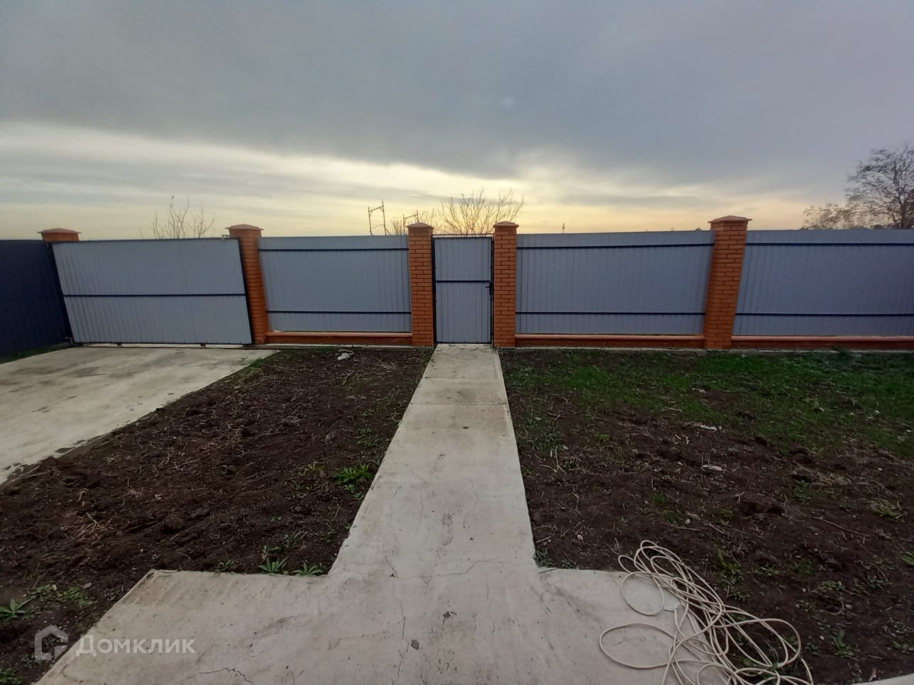 Участок огорожен. Фасадный забор из металлопрофиля на кирпичных колоннах. Ворота откатные.