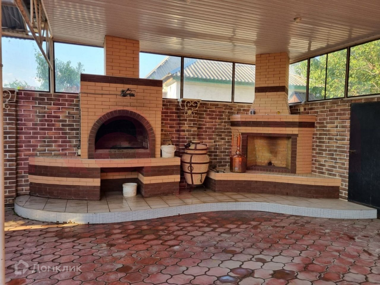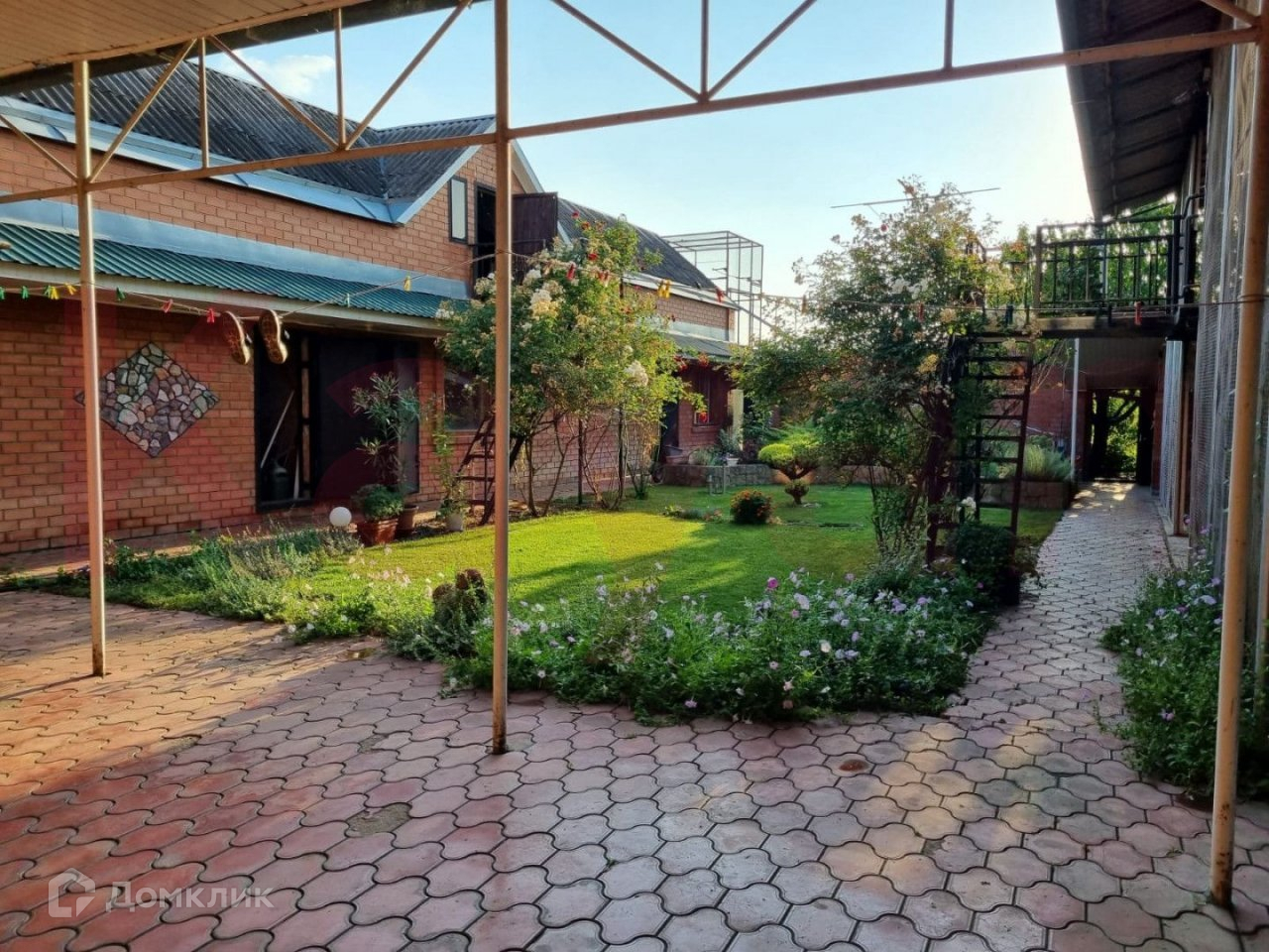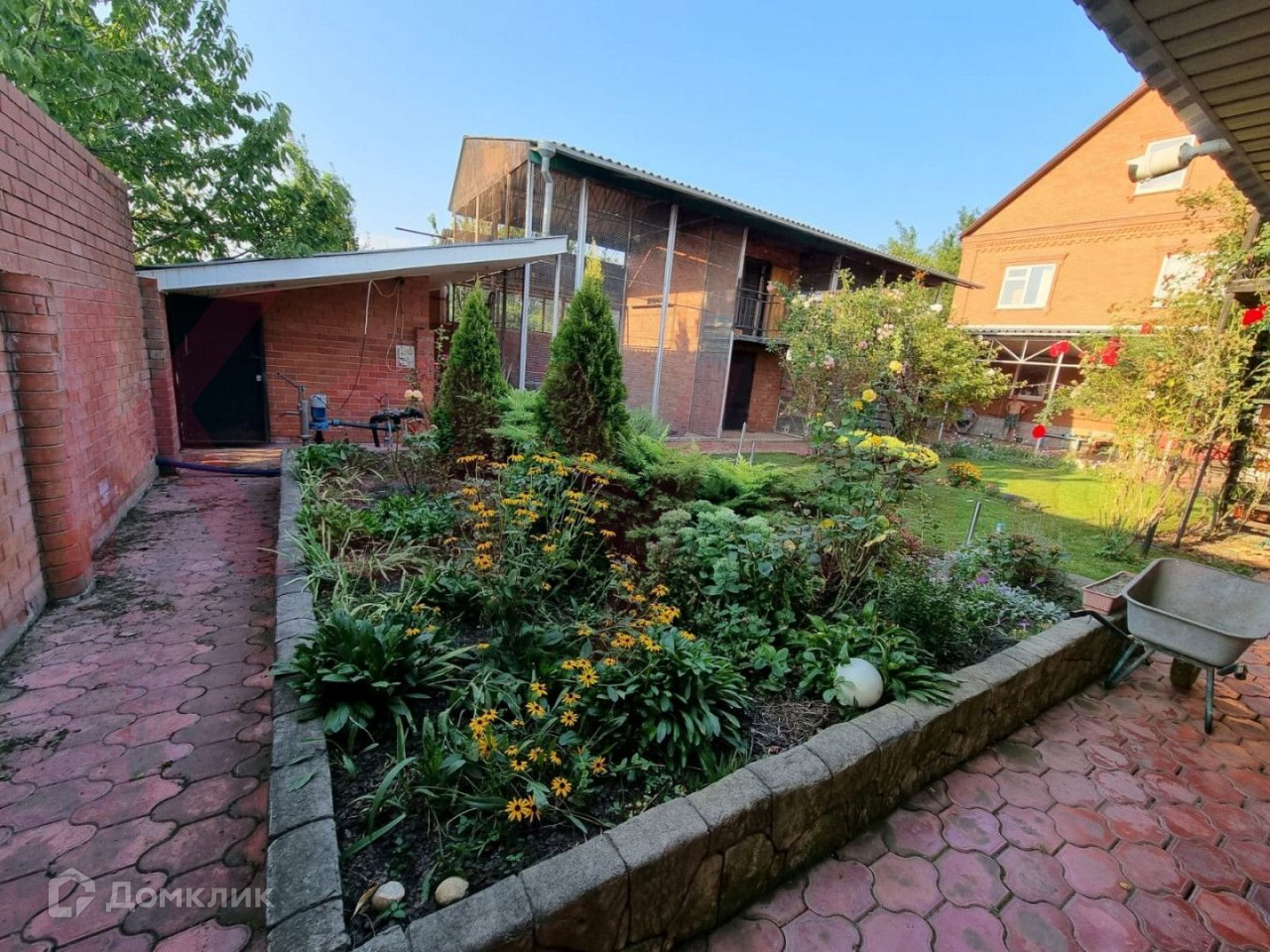 На участке есть гараж, баня (сауна), кухня, большая двух этажная голубятня, вольеры для собак, навес, под навесом кирпичный мангал и камин, хоз.двор с постройками. Двор просторный в плитке с освещением и видеонаблюдением, ухоженные клумбы, газон с автополивом. Забор кирпичный.
