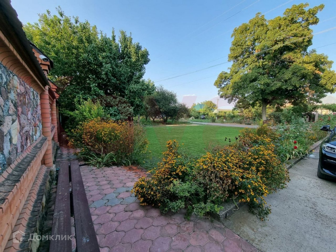 Приусадебная территория: подъезд на 4-6 машин, клумбы и газон с автополивом.