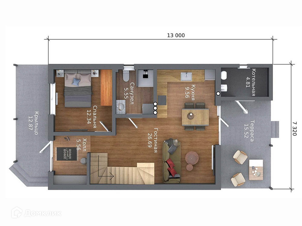 На 1 этаже располагается просторная кухня-гостиная, жилая комната и санузел.