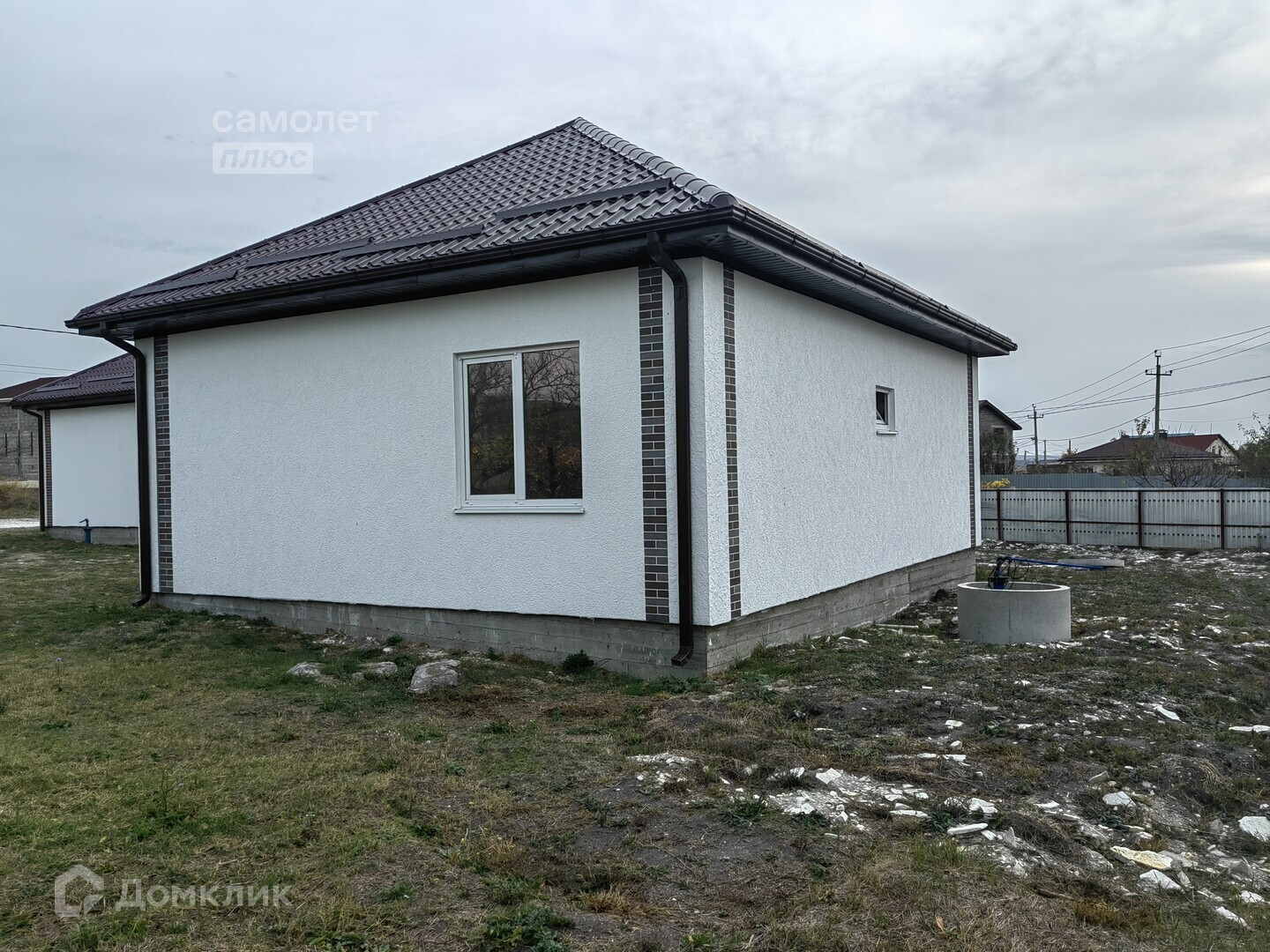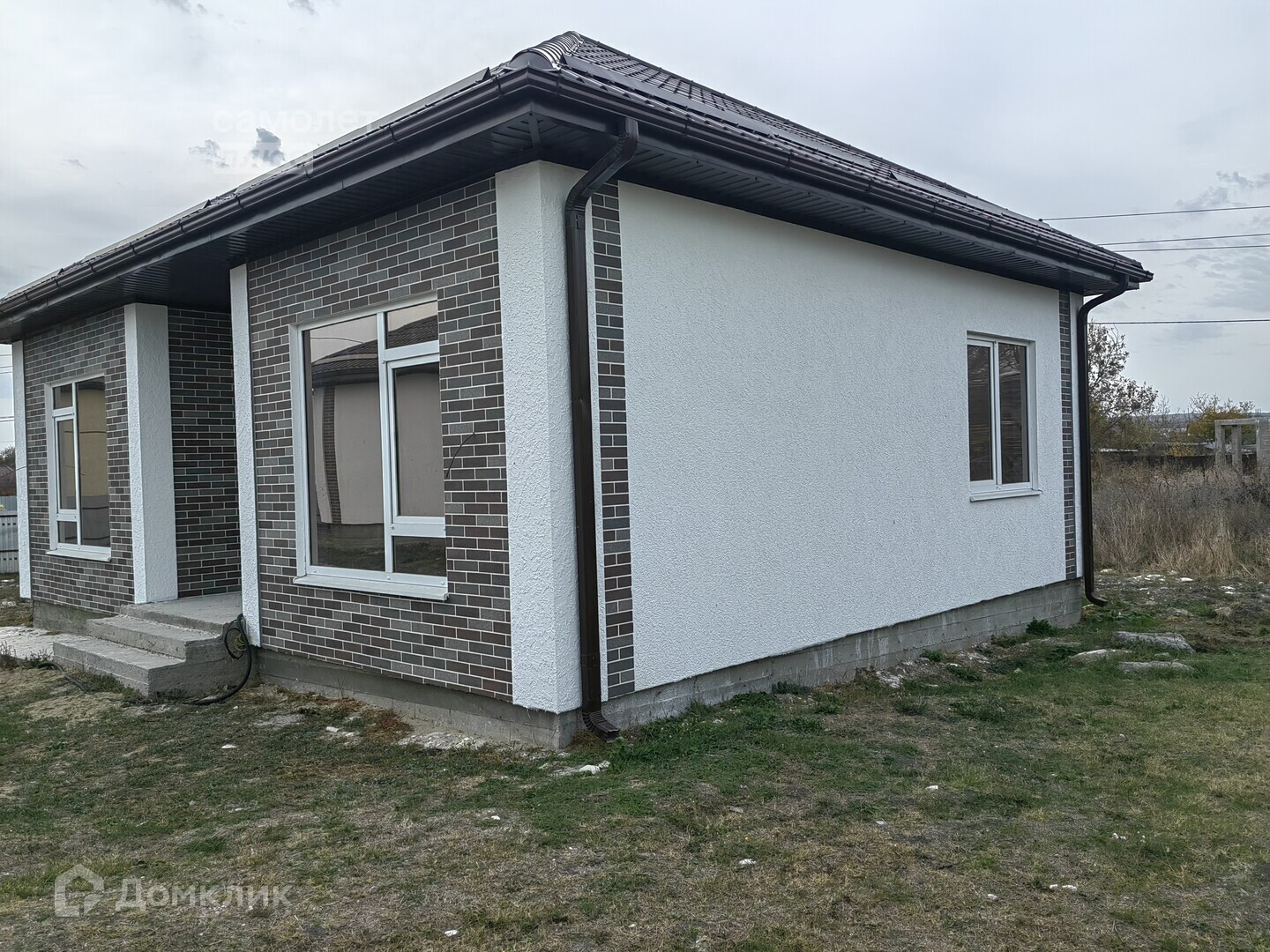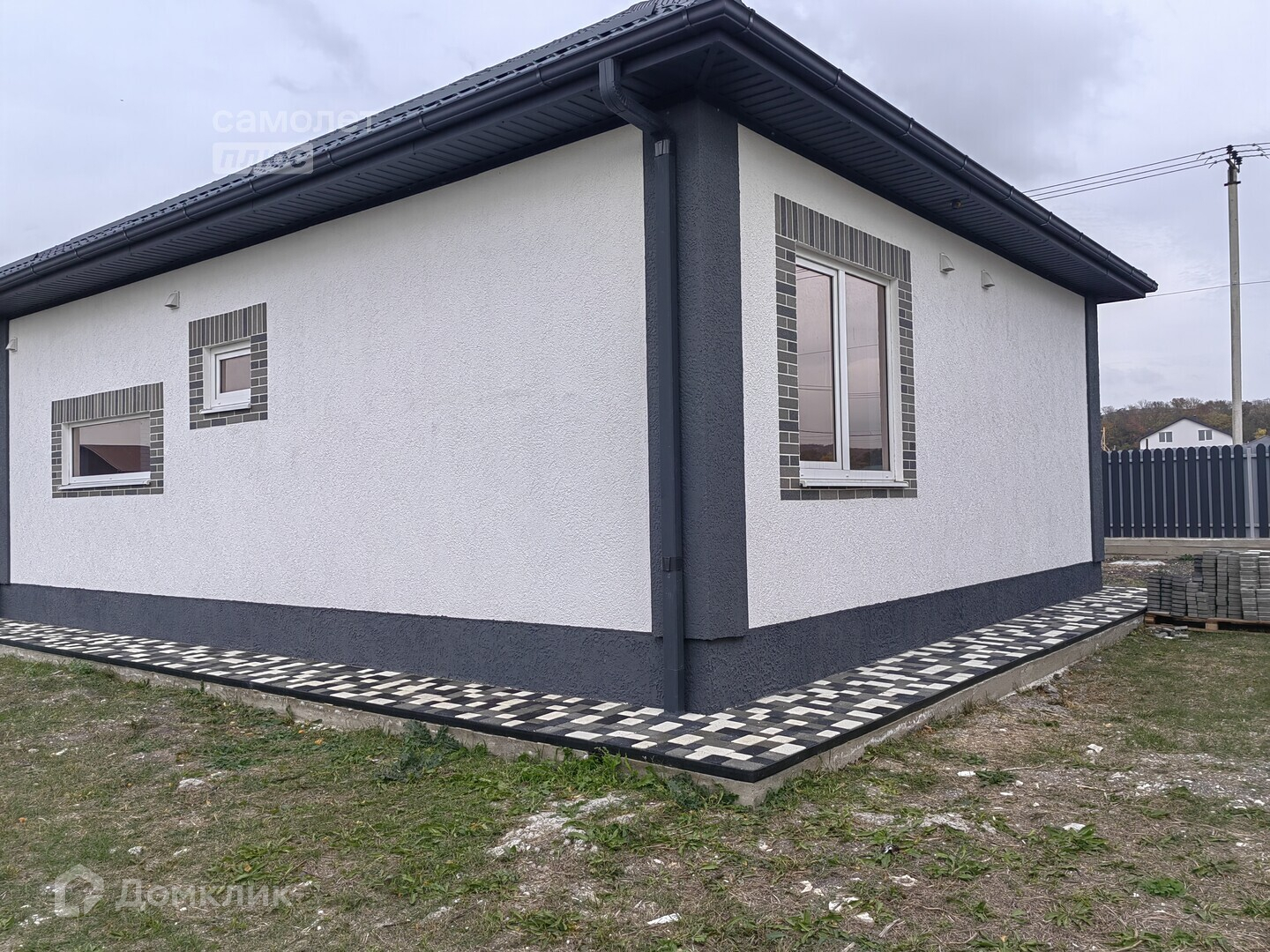 - общая площадь дома 80м2. Фундамент - ленточный ж/б, стены - керамзитобетонные блоки, утепленные с декоративной отделкой, кровля - металлочерепица;