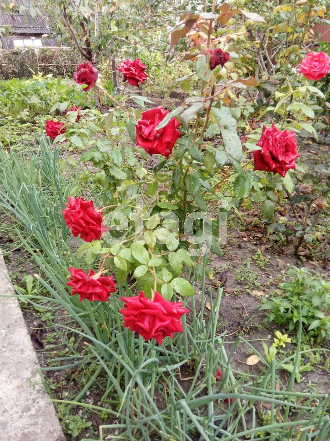 Участок огорожен, в саду растут розы, декоративные кустарники, фруктовые деревья. Во дворе большая подсыпанная площадка под автомобиль.