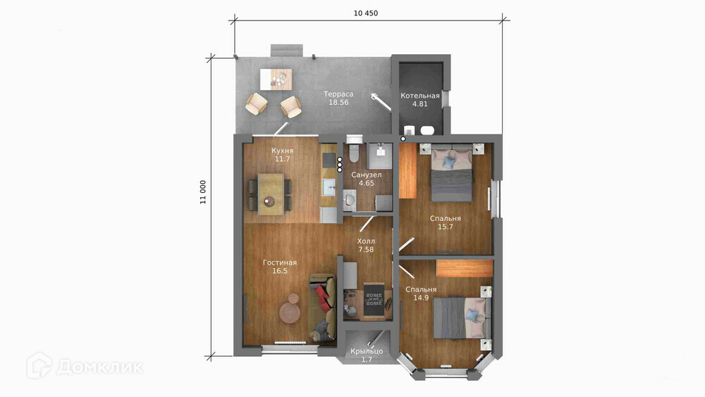 Особенностью этого проекта является спальня с панорамным эркером, создающим уютную атмосферу отдыха. Кроме того, в доме имеется еще одна спальня, просторная кухня-гостиная с выходом на террасу и санузел. А через террасу можно пройти в котельную.