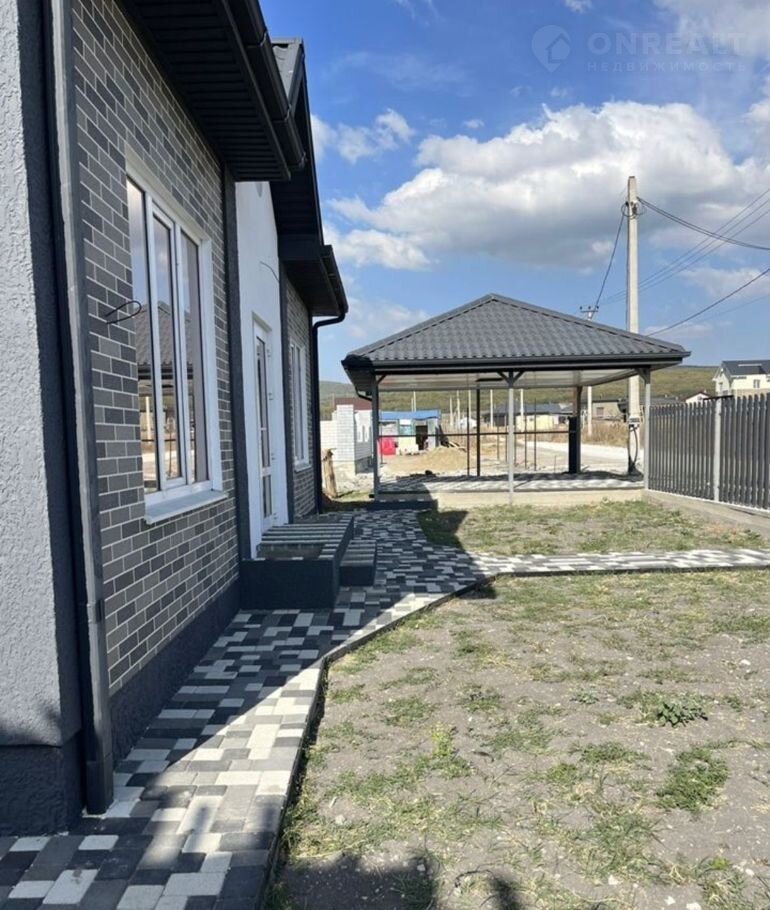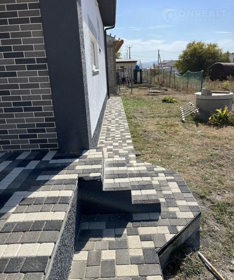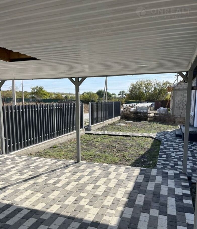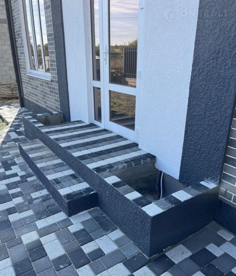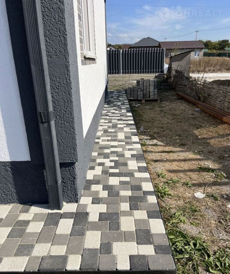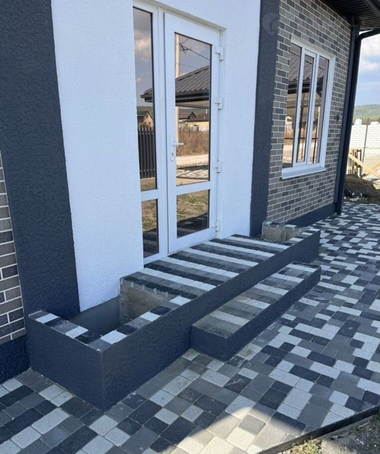 По фасаду двусторонний забор с воротами и калиткой, имеется место под два автомобиля с навесом. Тротуарная трехцветная плитка с мраморной крошкой уложена на полноценное бетонное основание по всей площади включая отмостку.
