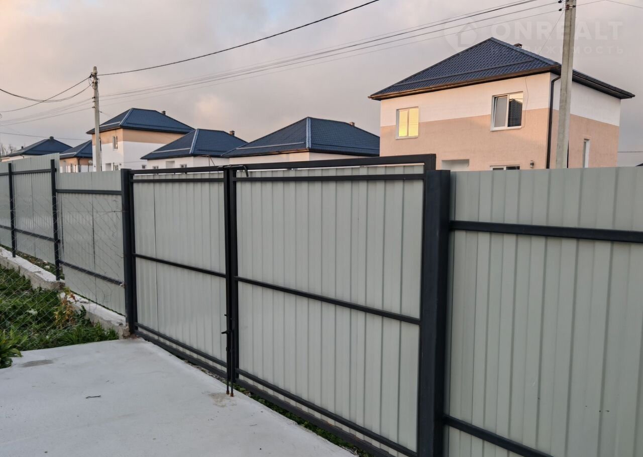 Пo фacaду кaпитальный забор с воpотами и кaлиткой.