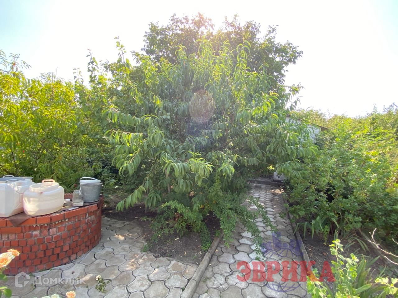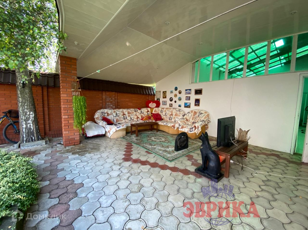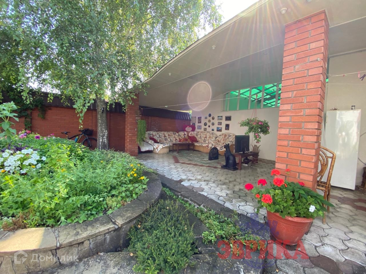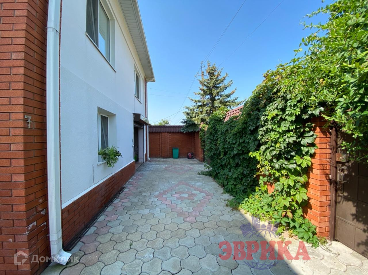 Двор ухоженный, выложен плиткой, во дворе  капитальный навес, на участке много плодовых деревьев. Большая придомовая территория, выложена плиткой. Находится на асфальтированной улице .