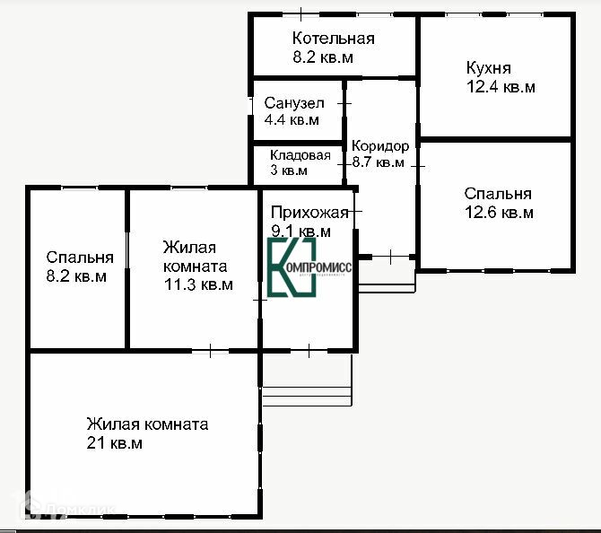 В доме 4 жилых комнаты, кухня, совмещенный санузел, кладовая, прихожая, коридор,