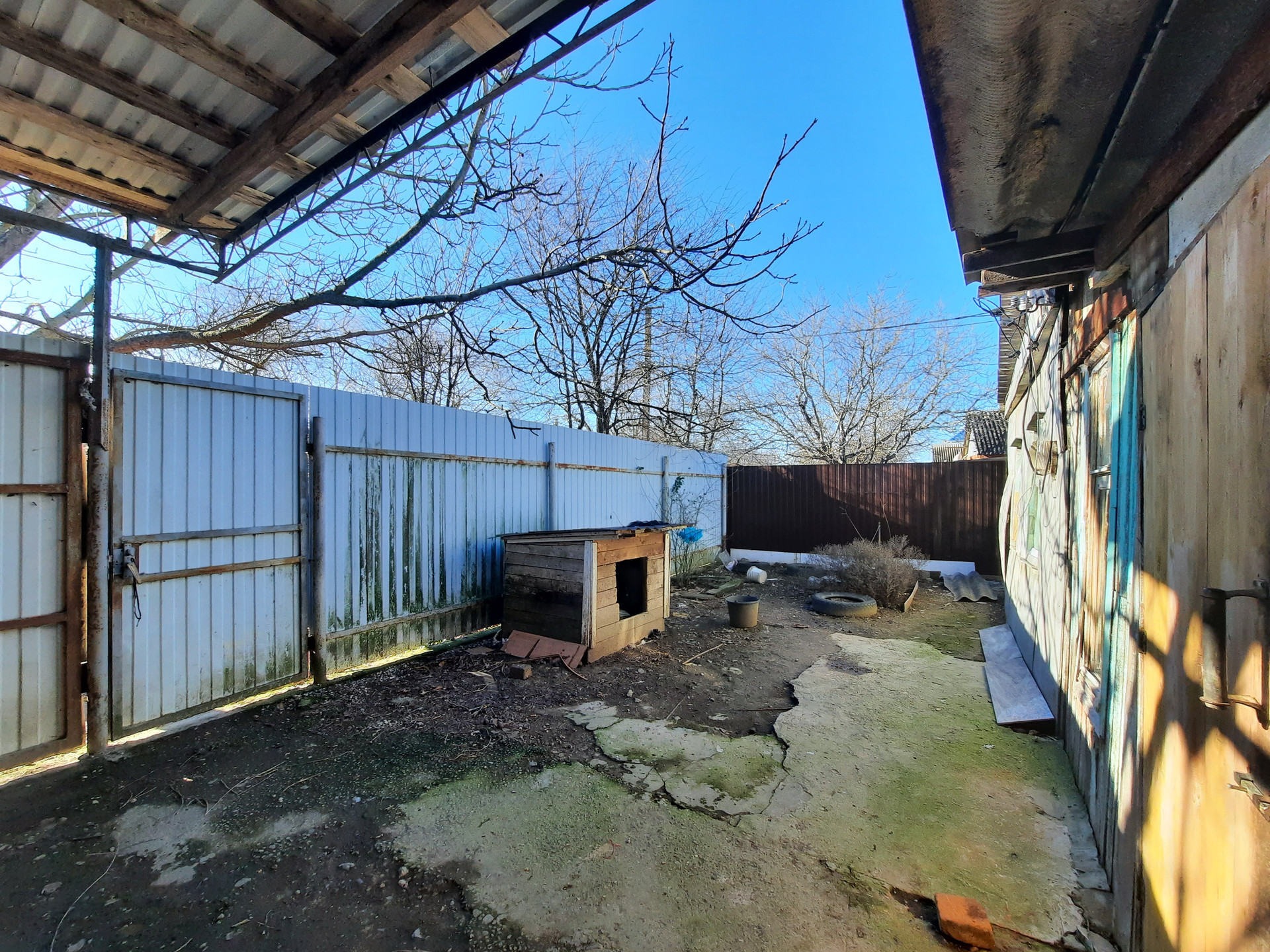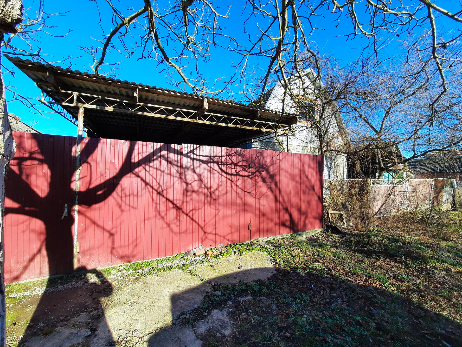 По фасаду металлопрофильный забор, есть заезд для автомобиля под навесом