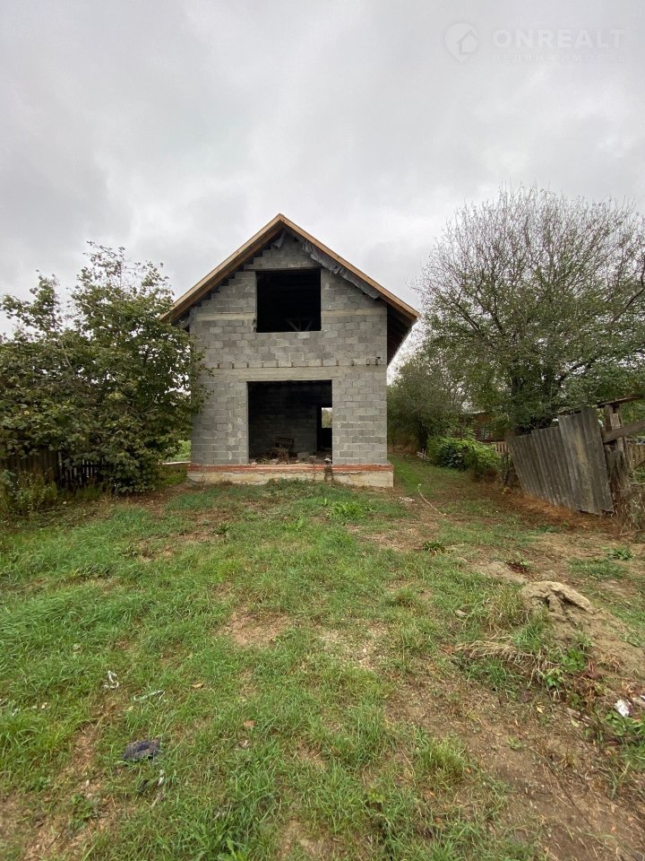 Забор из металлопрофиля, удобный подъезд. На участке недостроенный 2х этажный дом площадью 120 кв.м с накрытой профилем крышей. Все коммуникации по меже.