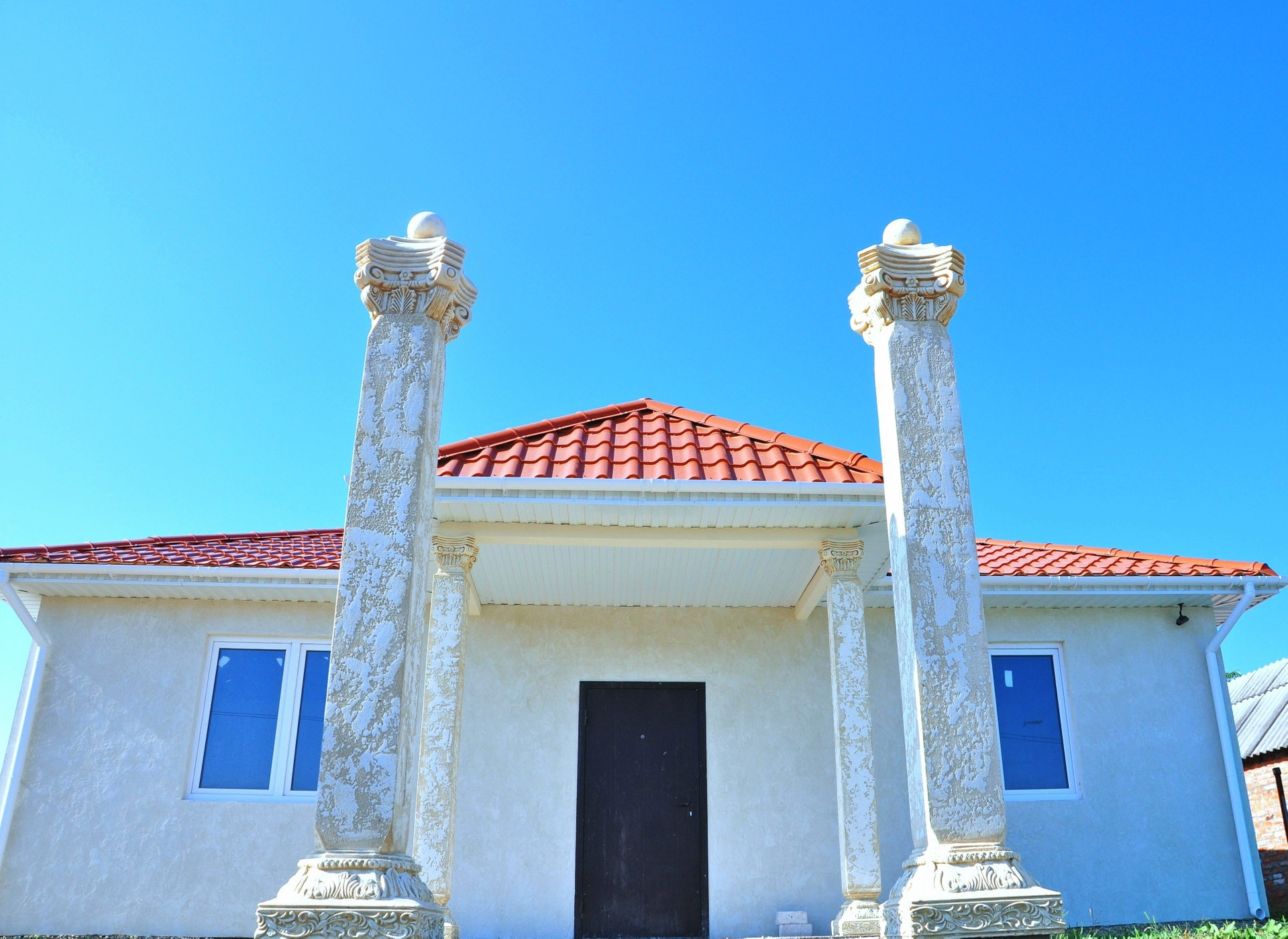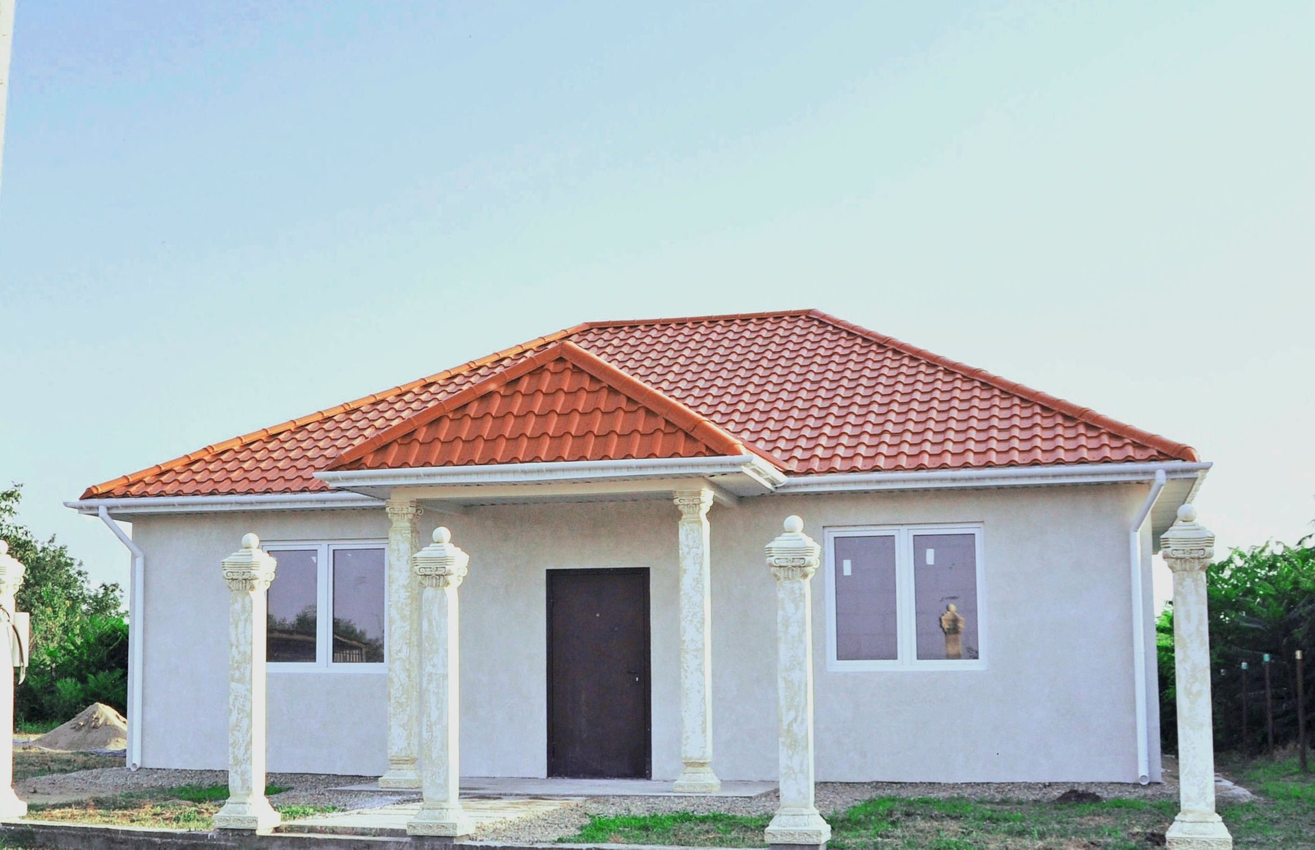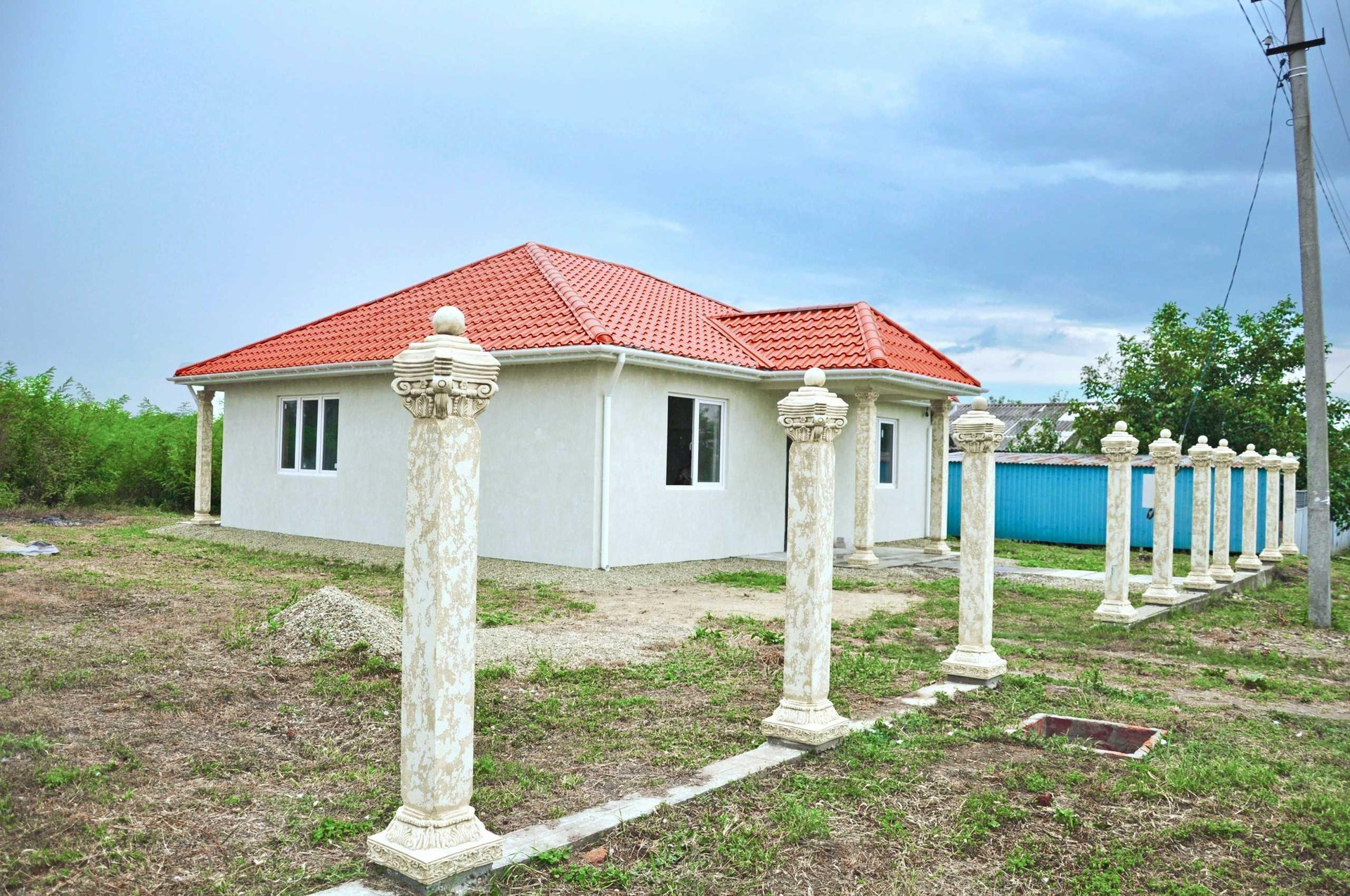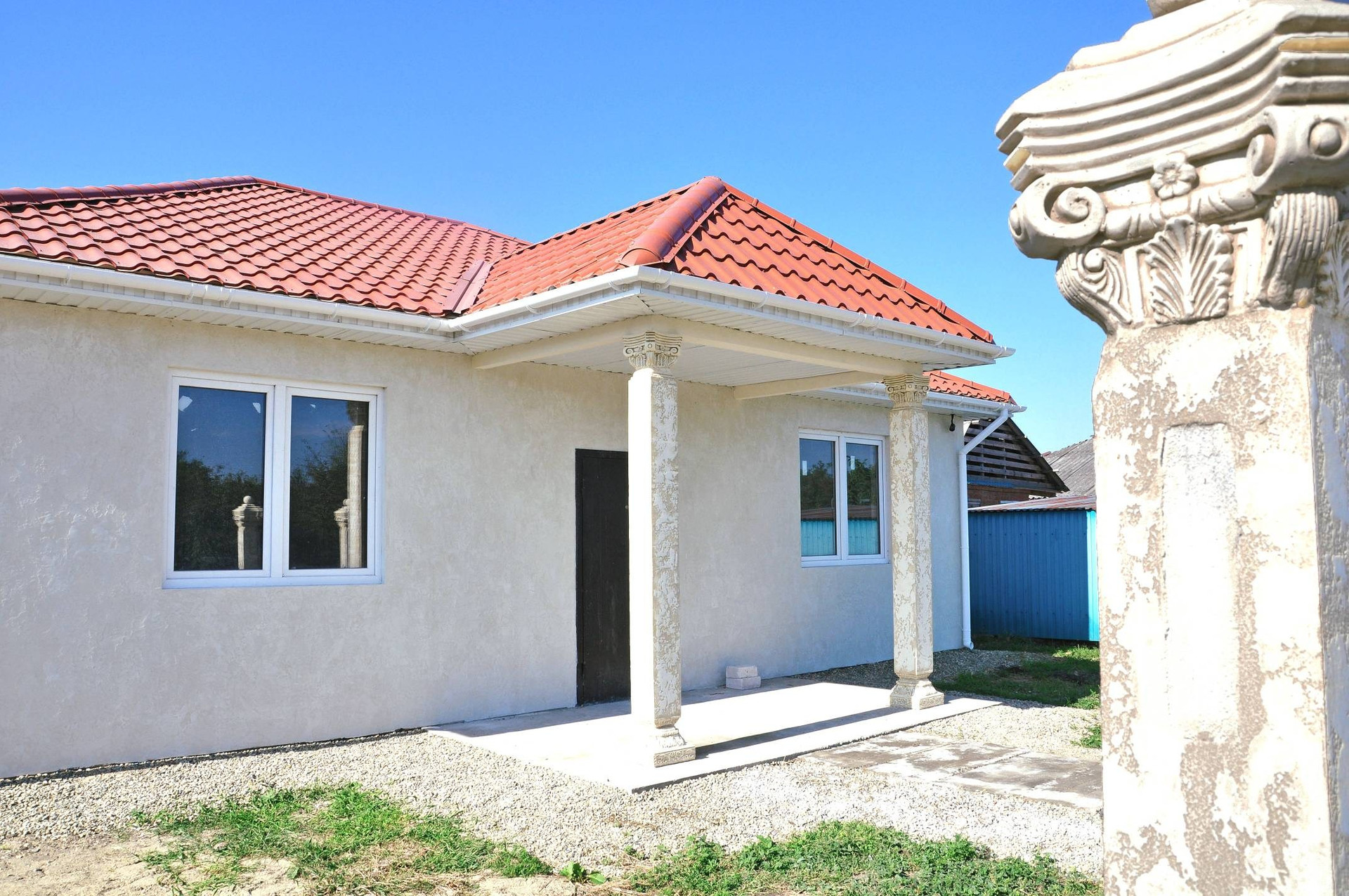 У дома двойные армированные стены.  Наружная стена не контактирует с внутренней (коробка в коробке  ) между стен утеплитель 10см. Фасад декоративная штукатурка Гротто. Потолок утеплён базальтовой ватой . Толщина утепления 17-20см.  Окна с двумя створками. В доме две спальни по 16кв каждый . Гостиная 20кв. Прихожая ,кухня, туалет ванная , витраж с выходом на задний двор . Участок позволяет дополнительно построить гараж , бассейн,зону барбекю и так же место для садоводства.  Цвет черепицы терракотовый, дом в цвете жемчуга (фото не так может передать цвета) Колонны полнотелые ,бетонные(не декор из пенопласта или чего-то другого) ,полностью ручная работа,собственный дизайн,единственный в своем роде,цвет слоновая кость.  Газ проходит перед домом под землёй . Посмотреть дом можно в любой день, когда вам удобно.