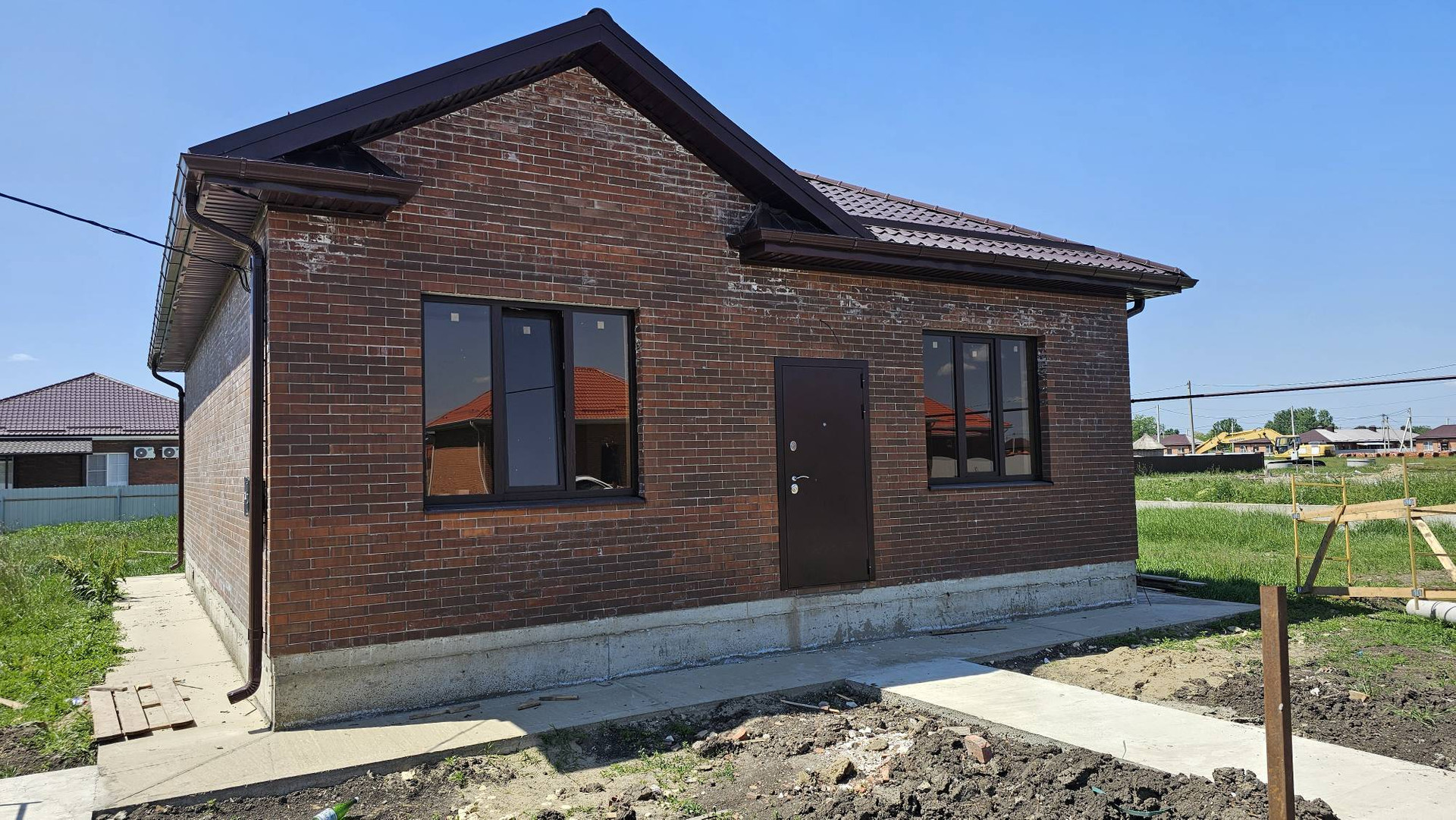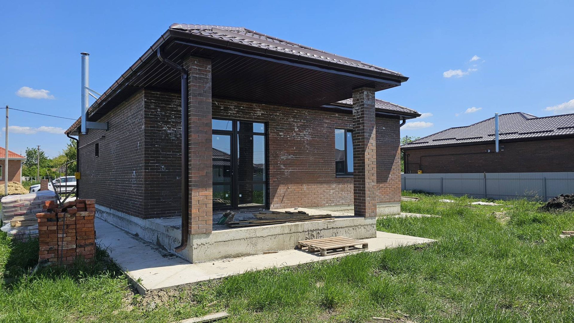 Дом на завершающем этапе строительства, ведутся работы по благоустройству территории и монтаж забора.