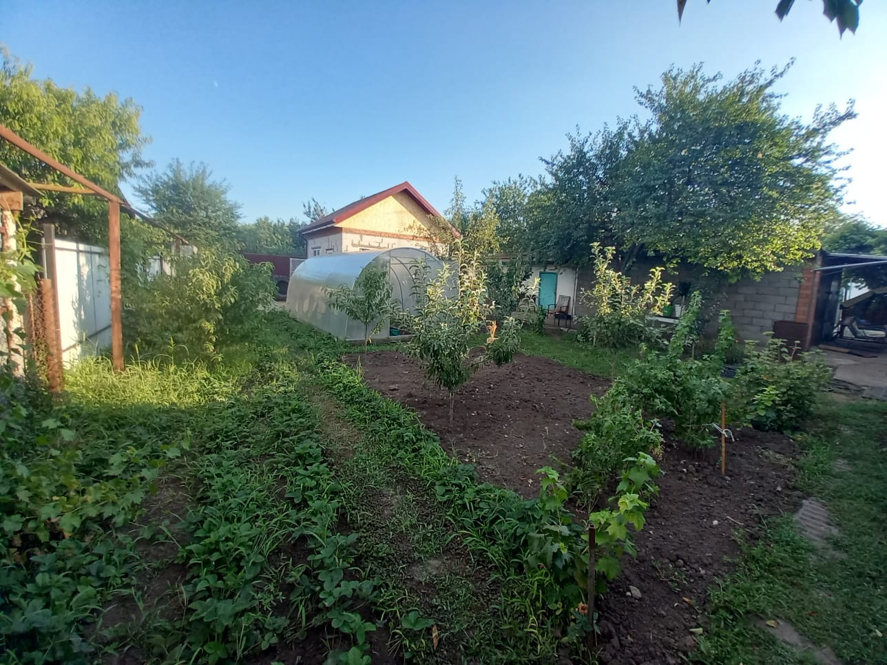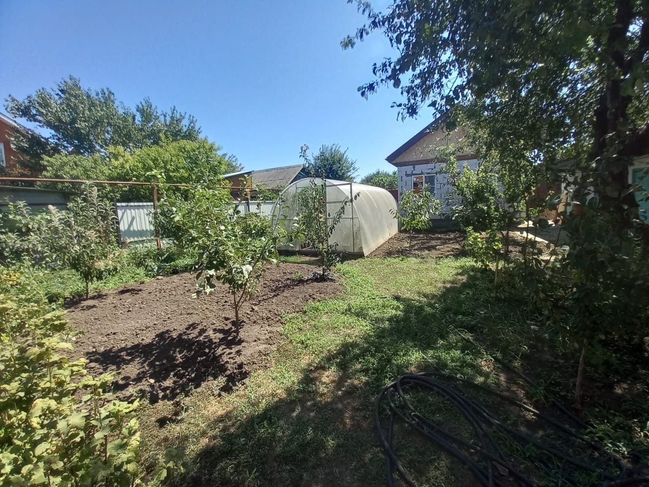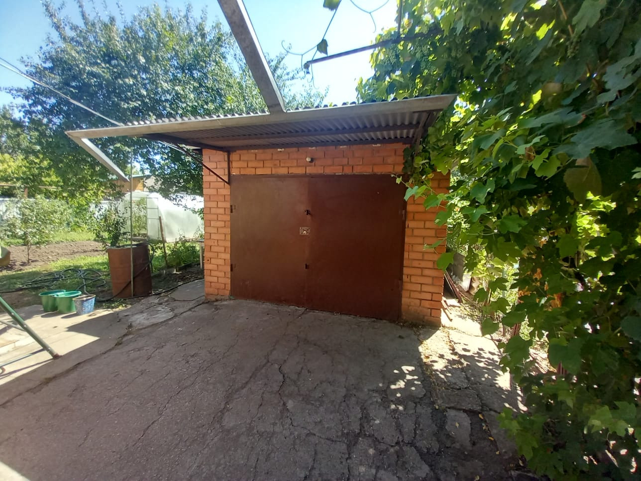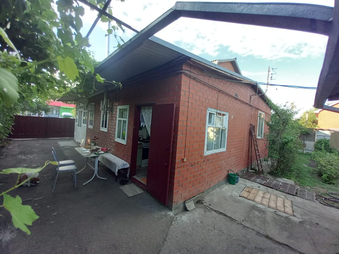 Двор асфальтирован. К дому пристроен металлический каркас беседки из виноградных лоз. Есть возможность сделать большой навес от прямых солнечных лучей. Во дворе имеется вывод воды для полива, мытья автомобиля и других бытовых нужд.