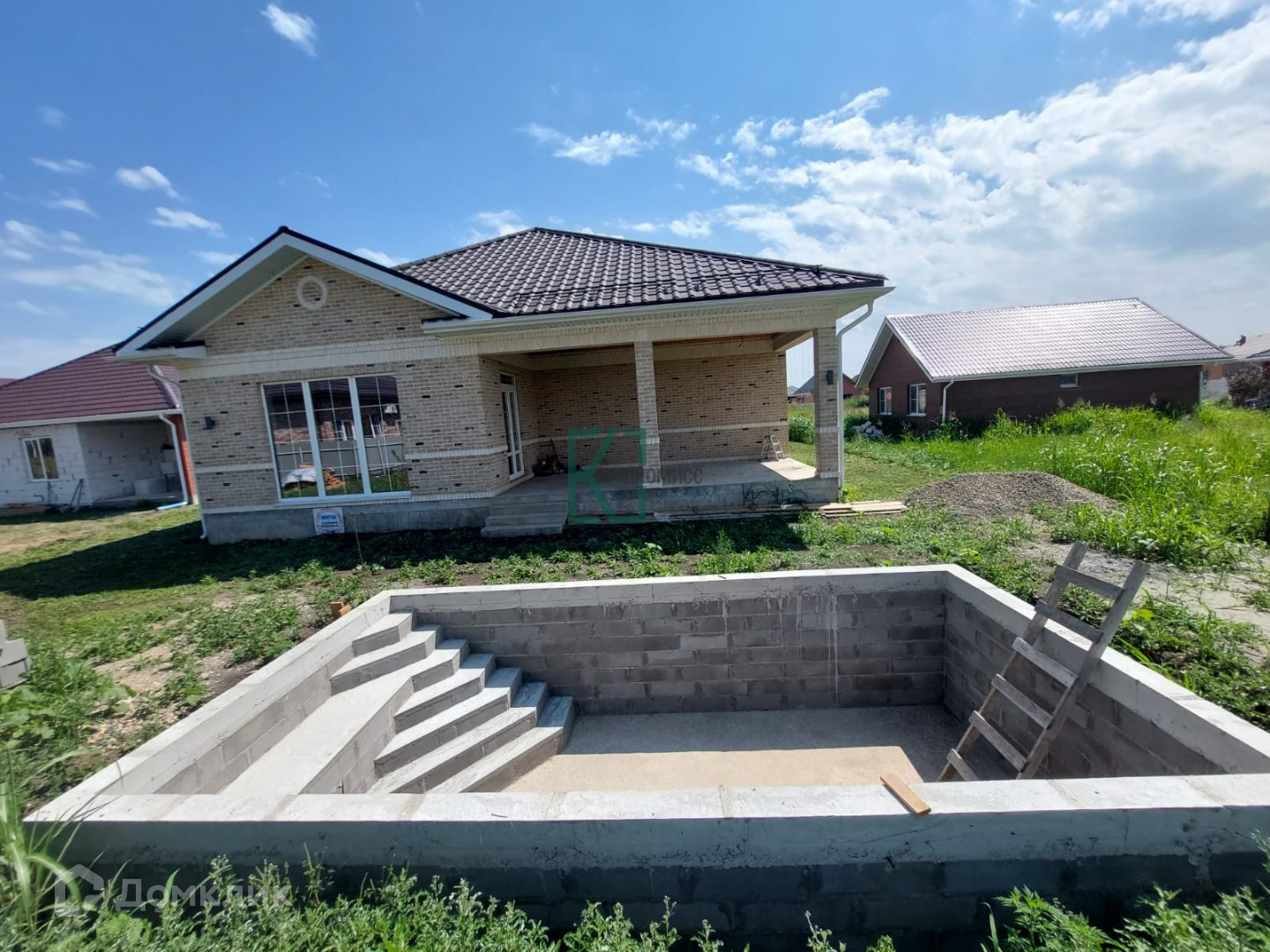 Участок прямоугольной формы с фасадом 20 метров. Имеется место под строительство бани, беседки, навеса и др. На участке выполнена из бетона и блока чаша под уличный бассейн, глубиной 1.6 м.