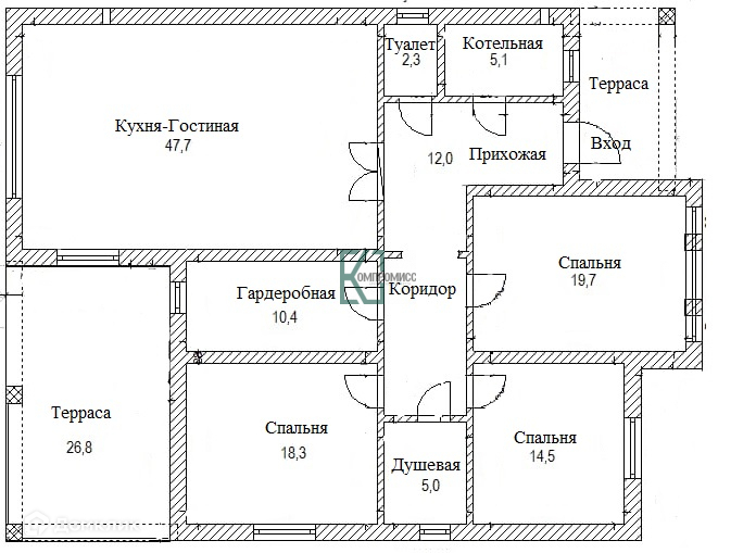 В доме: три спальни, большая кухня –гостиная, которая позволит разместиться большой семье с выходом на крытую и оборудованную коммуникациями террасу, туалет, душевая комната, котельная и прихожая. В гостиной установлены большие панорамные окна.