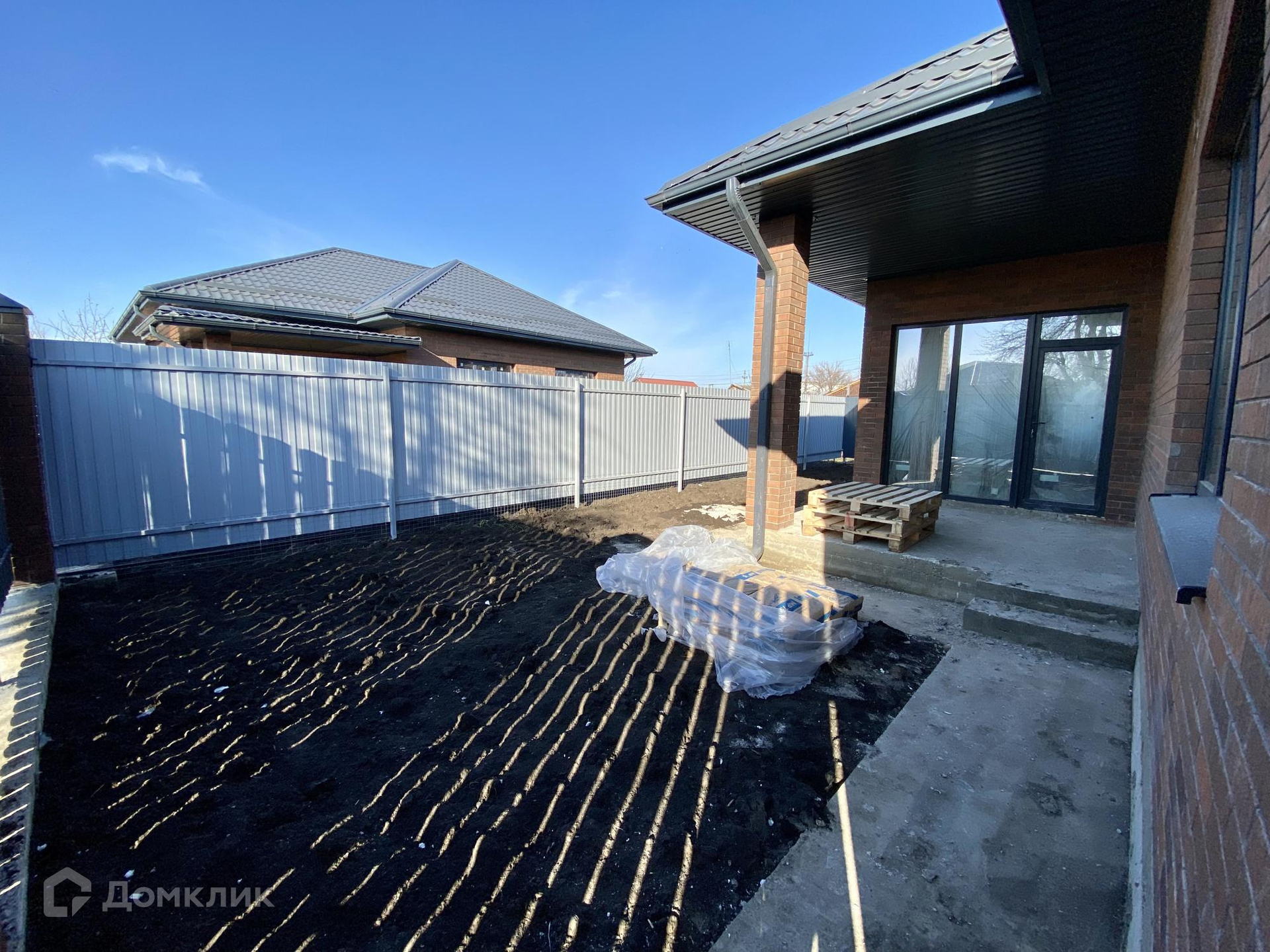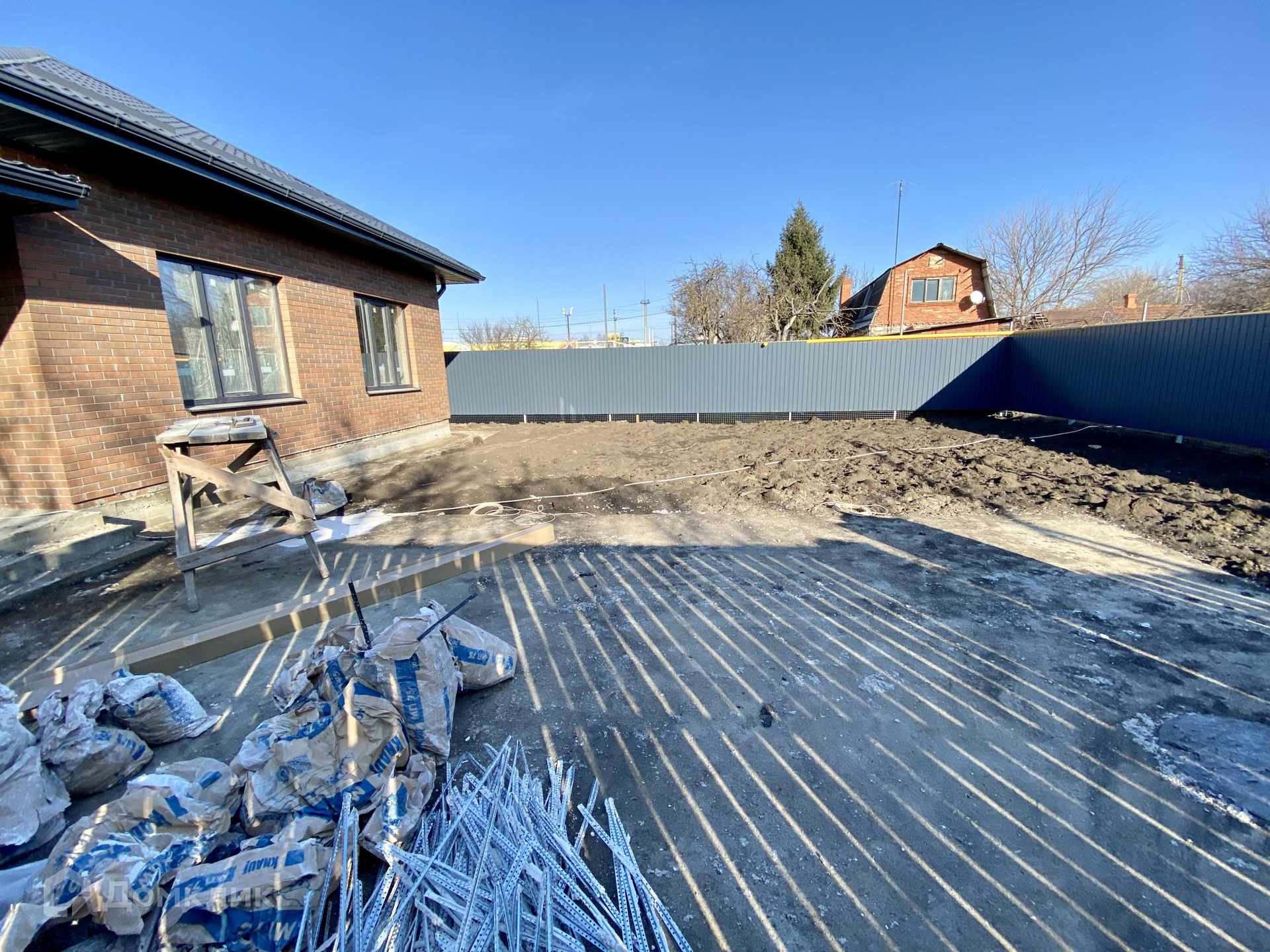 Участок 5 соток земли ИЖС, огорожен по периметру забором из металлопрофиля, забетонирован заезд для авто и отмостка по периметру дома.