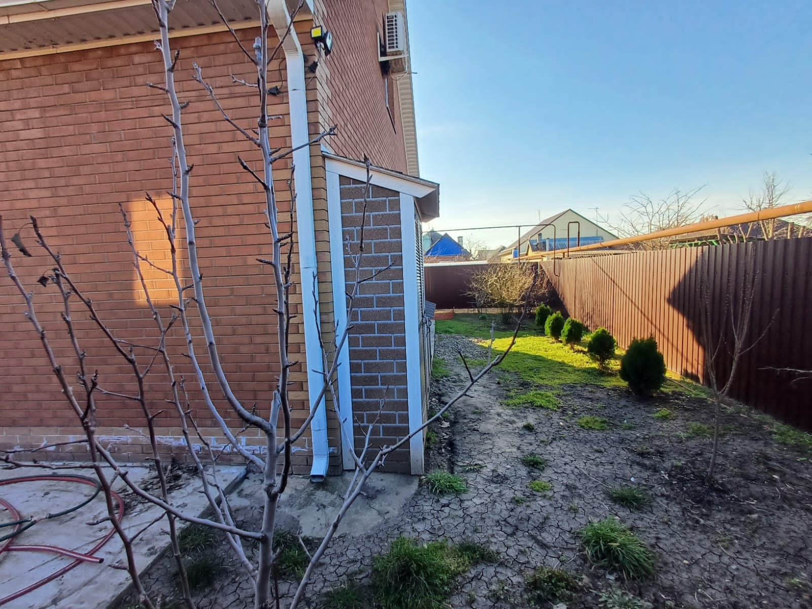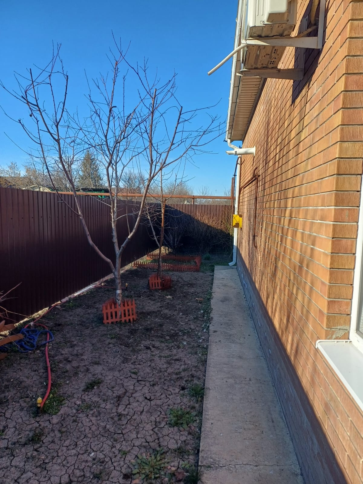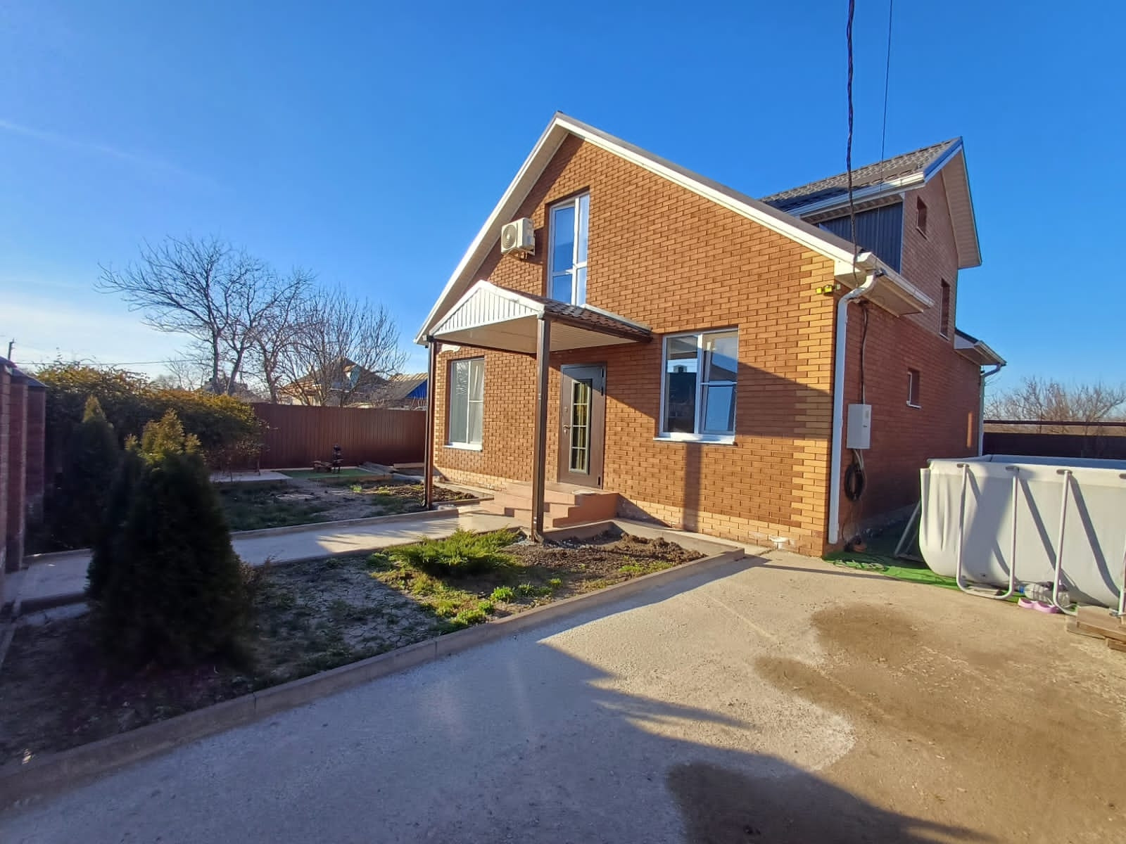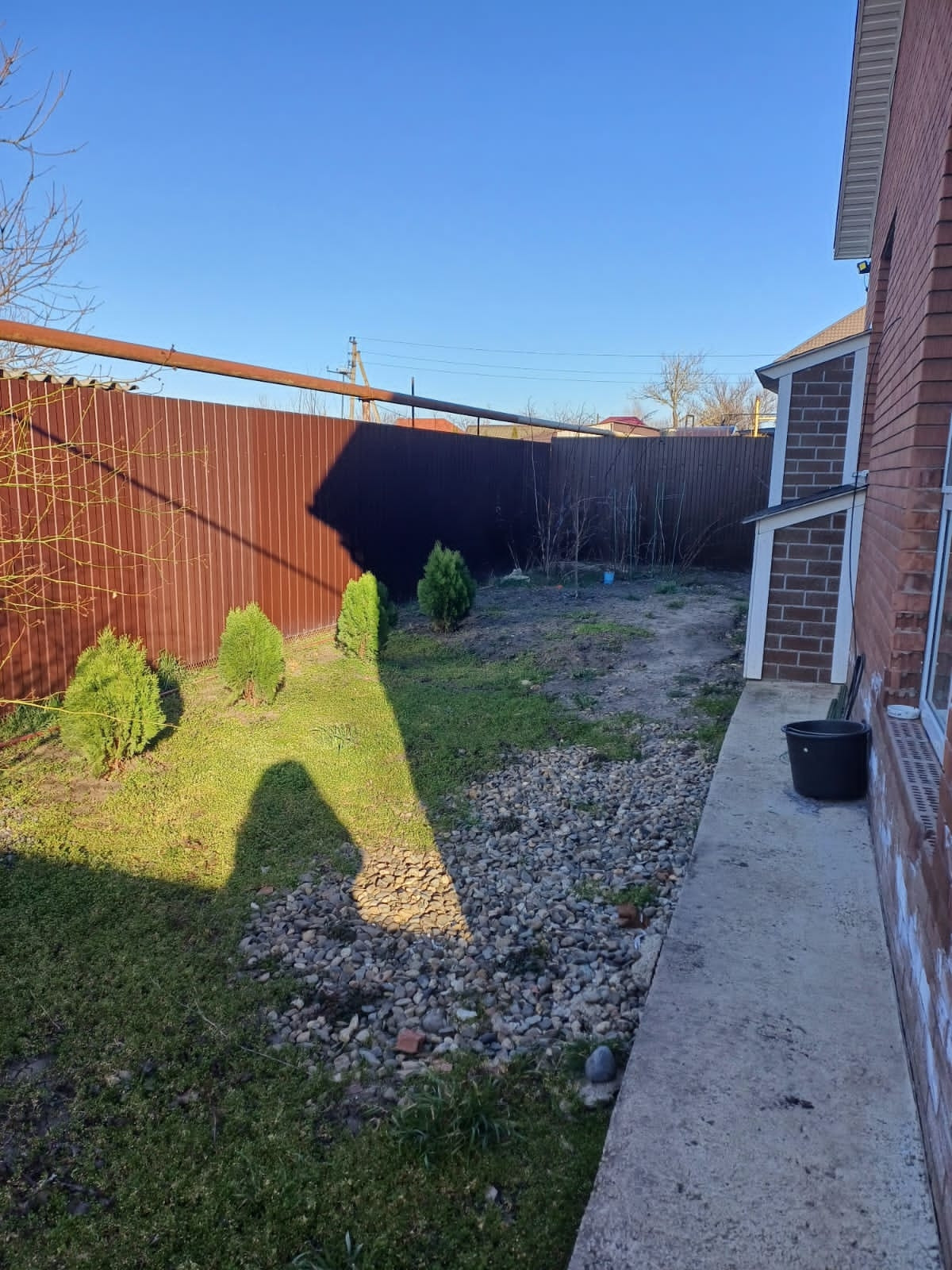 Участок 3 сотки, залита площадка под бассейн и под мангальную зону. Деревья - персик, яблоня, груша, слива белая, из кустарников - малина, жимолость, смородина. Также посажены хвойники - туя Смаракт, шаровидные туи, стелящаяся туя, золотистые туи