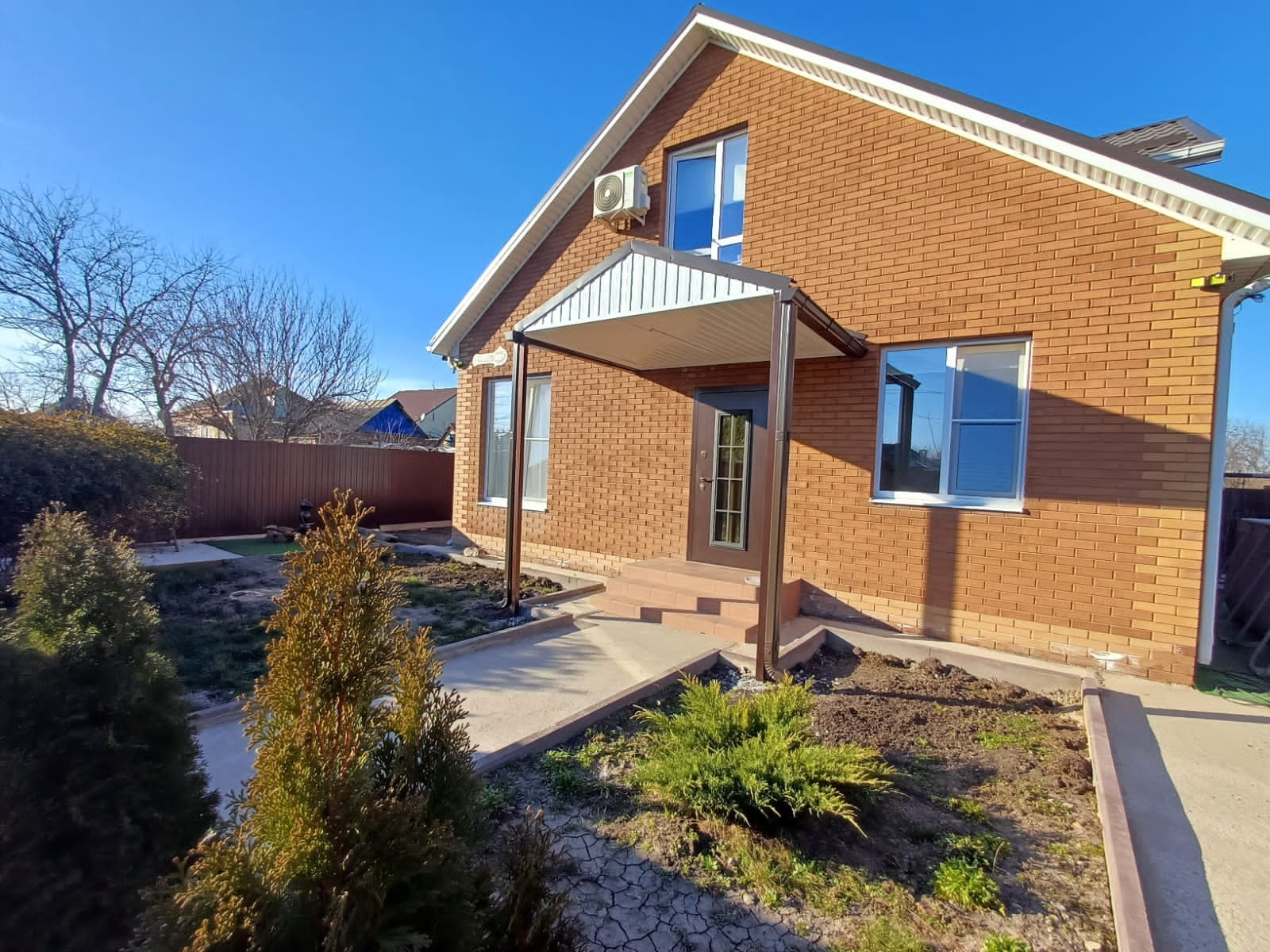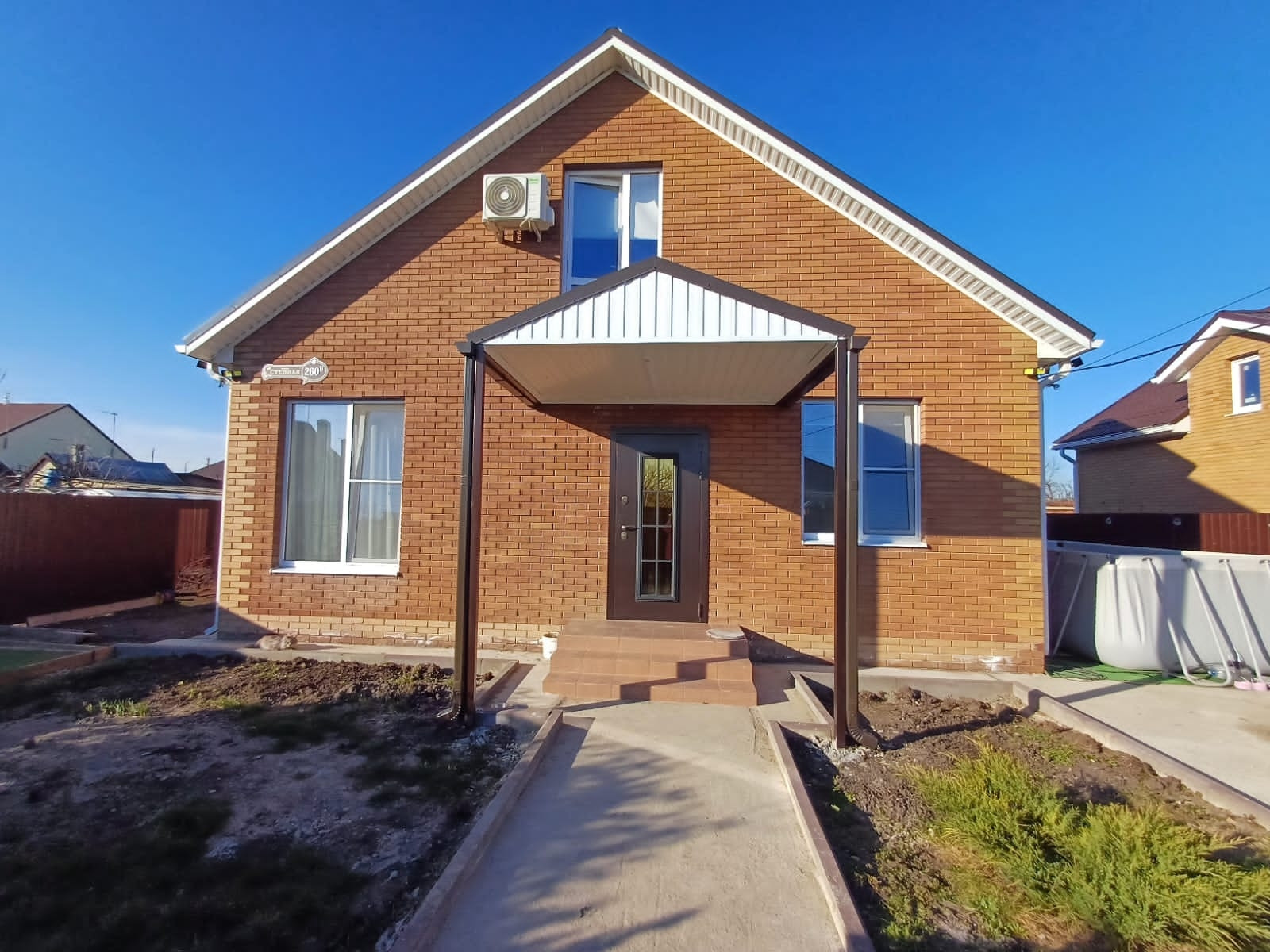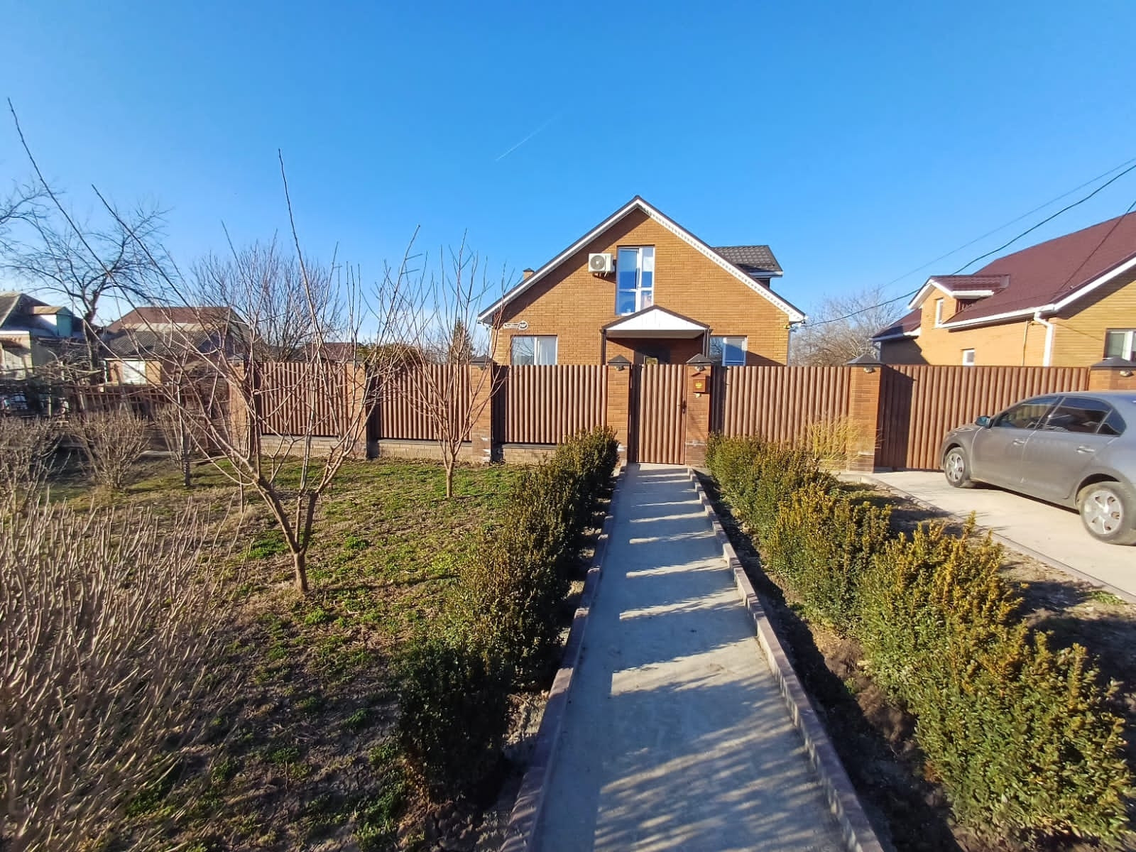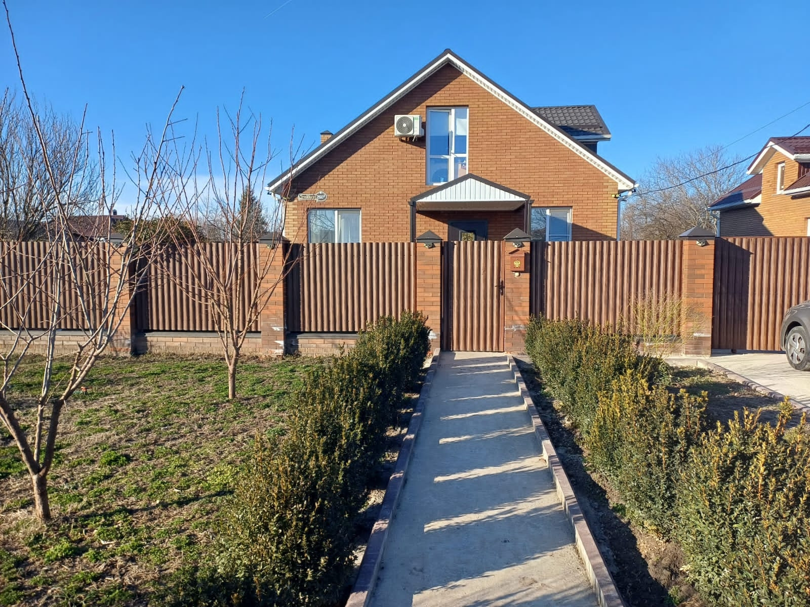 Участок 3 сотки, залита площадка под бассейн и под мангальную зону. Деревья - персик, яблоня, груша, слива белая, из кустарников - малина, жимолость, смородина. Также посажены хвойники - туя Смаракт, шаровидные туи, стелящаяся туя, золотистые туи